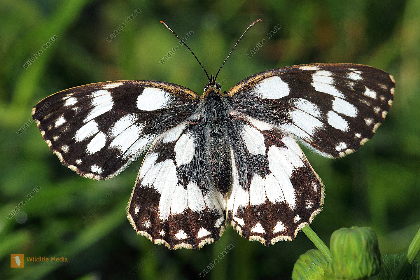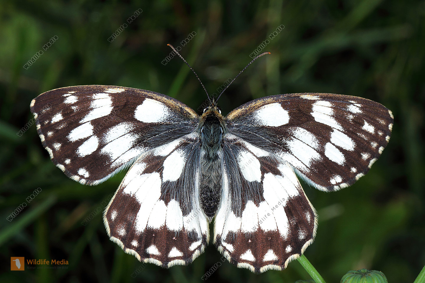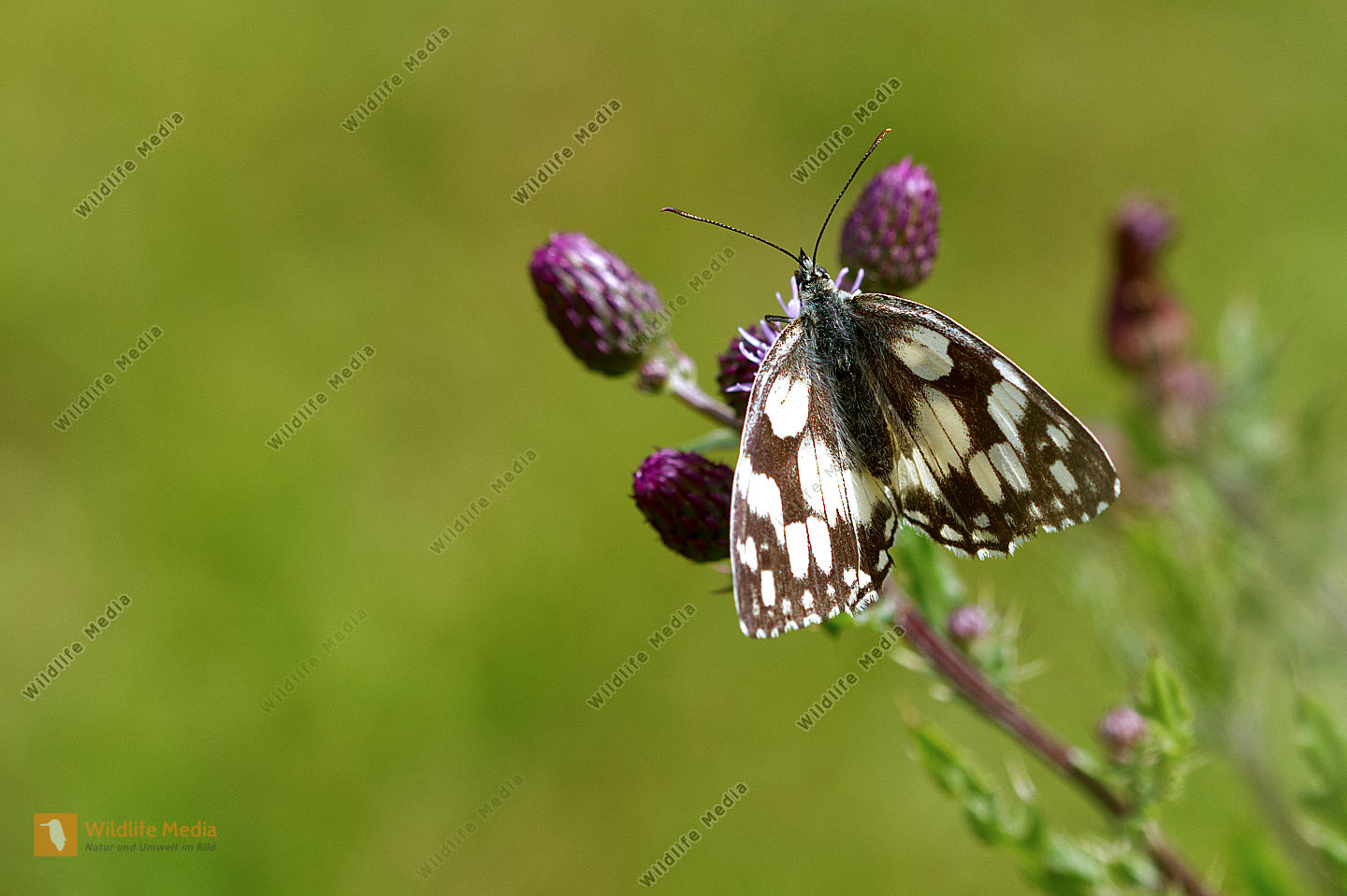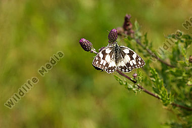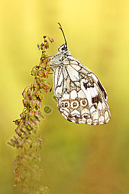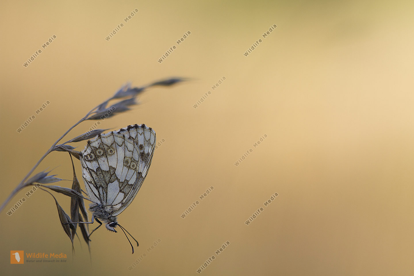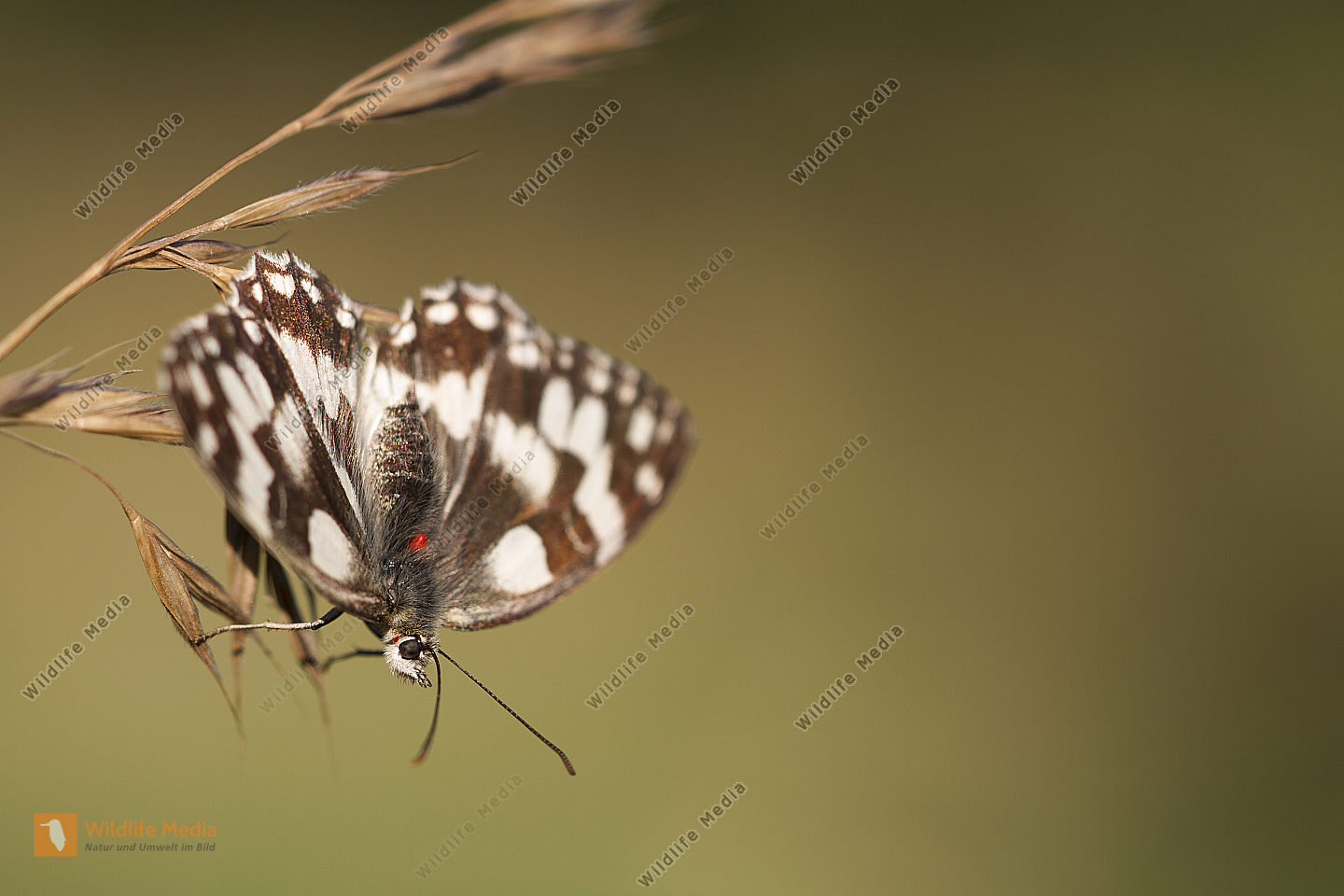Ein Schachbrettfalter sitzt auf einem Grashalm