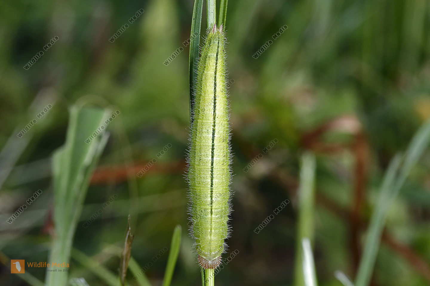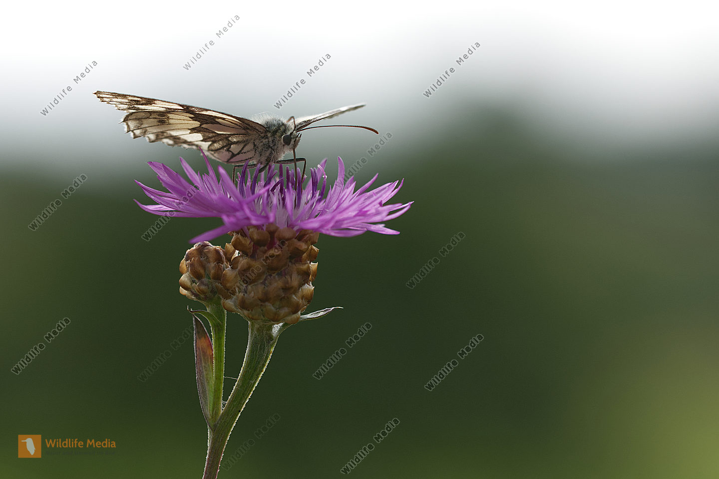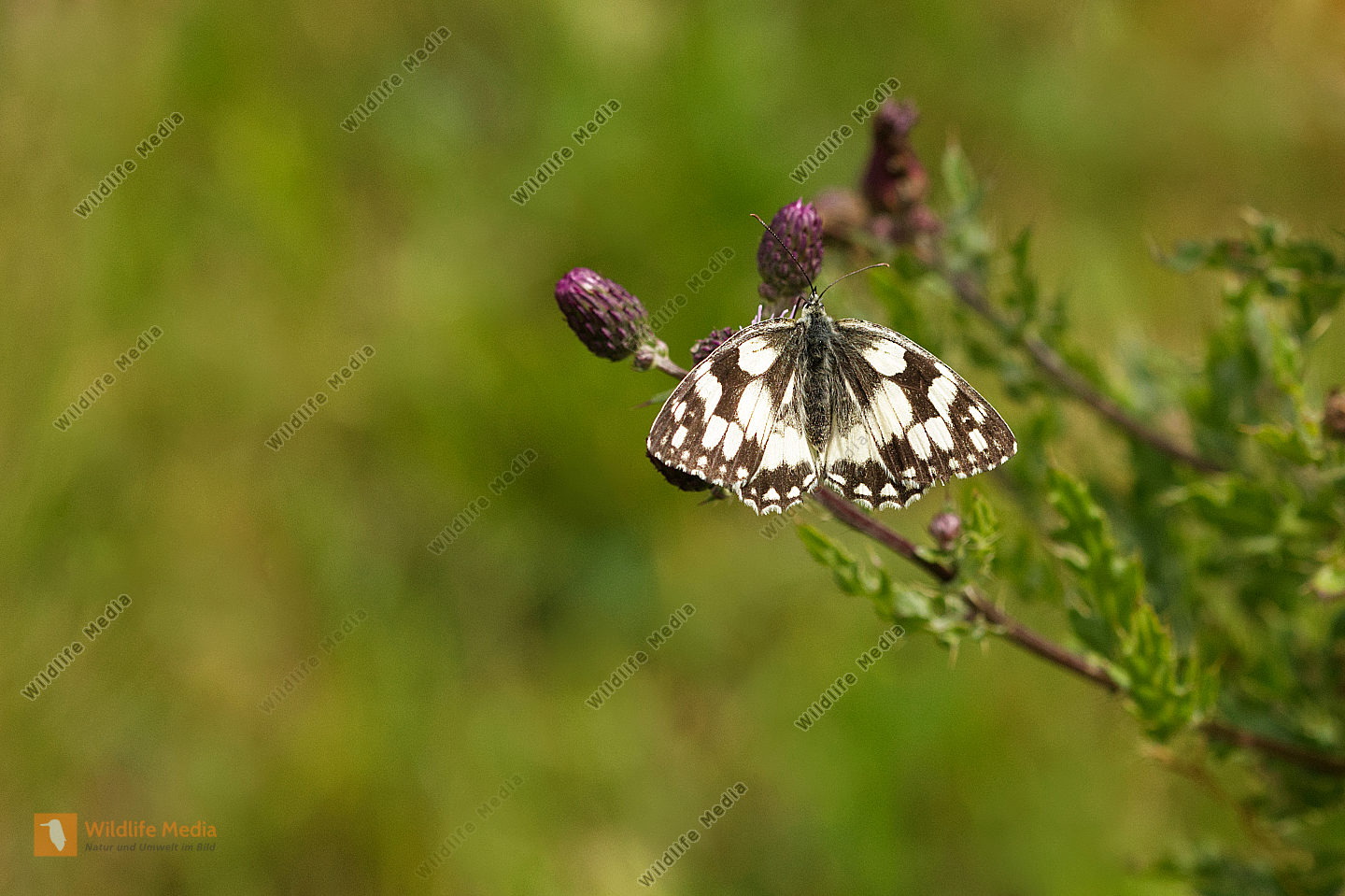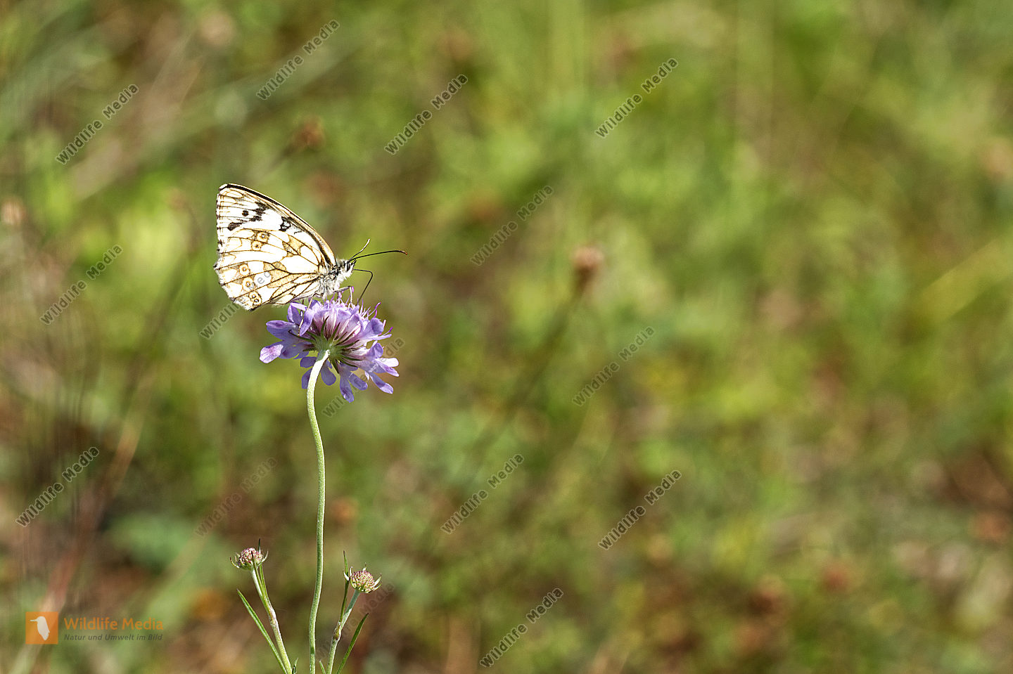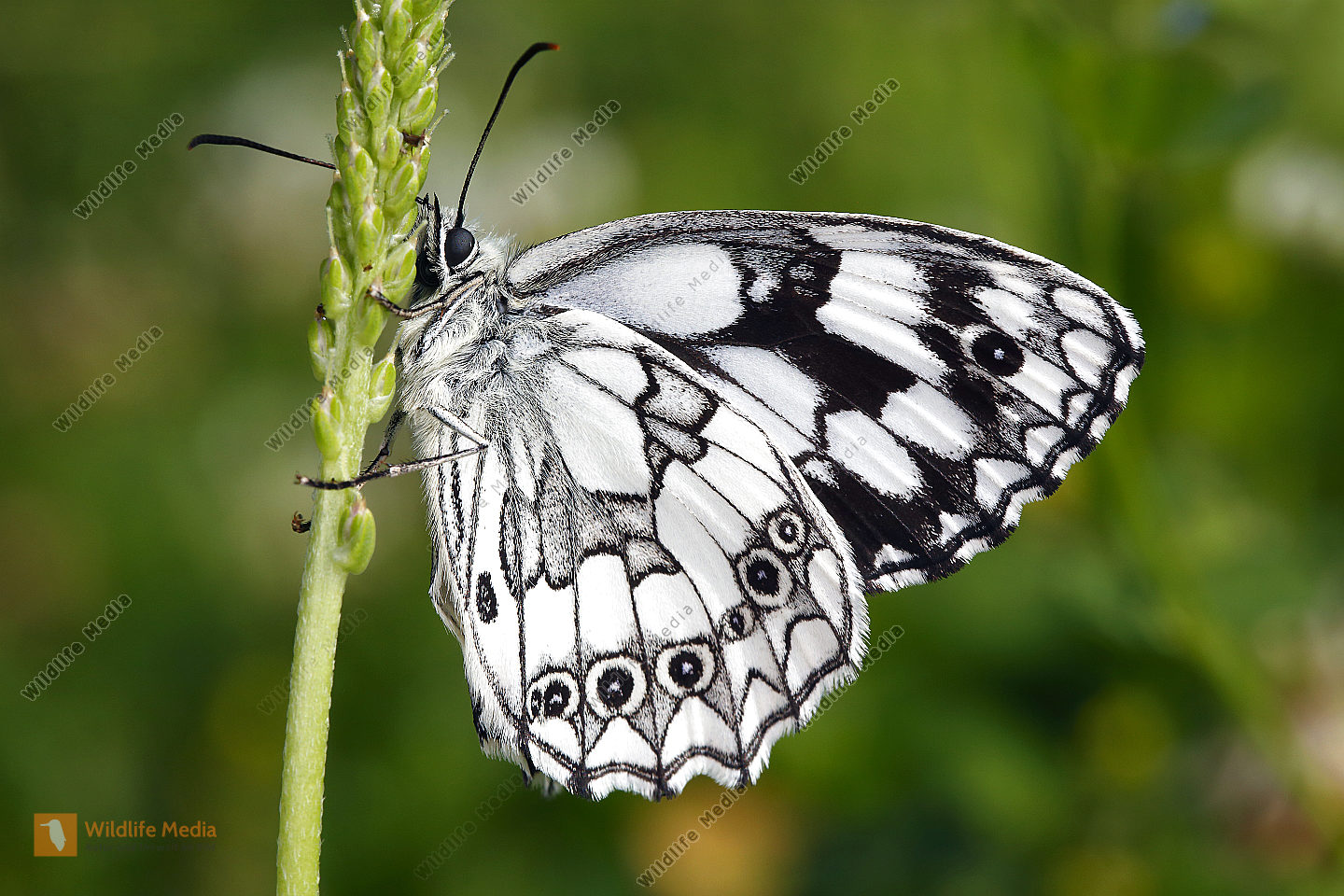 Ein Schachbrettfalter sitzt auf einem Grashalm