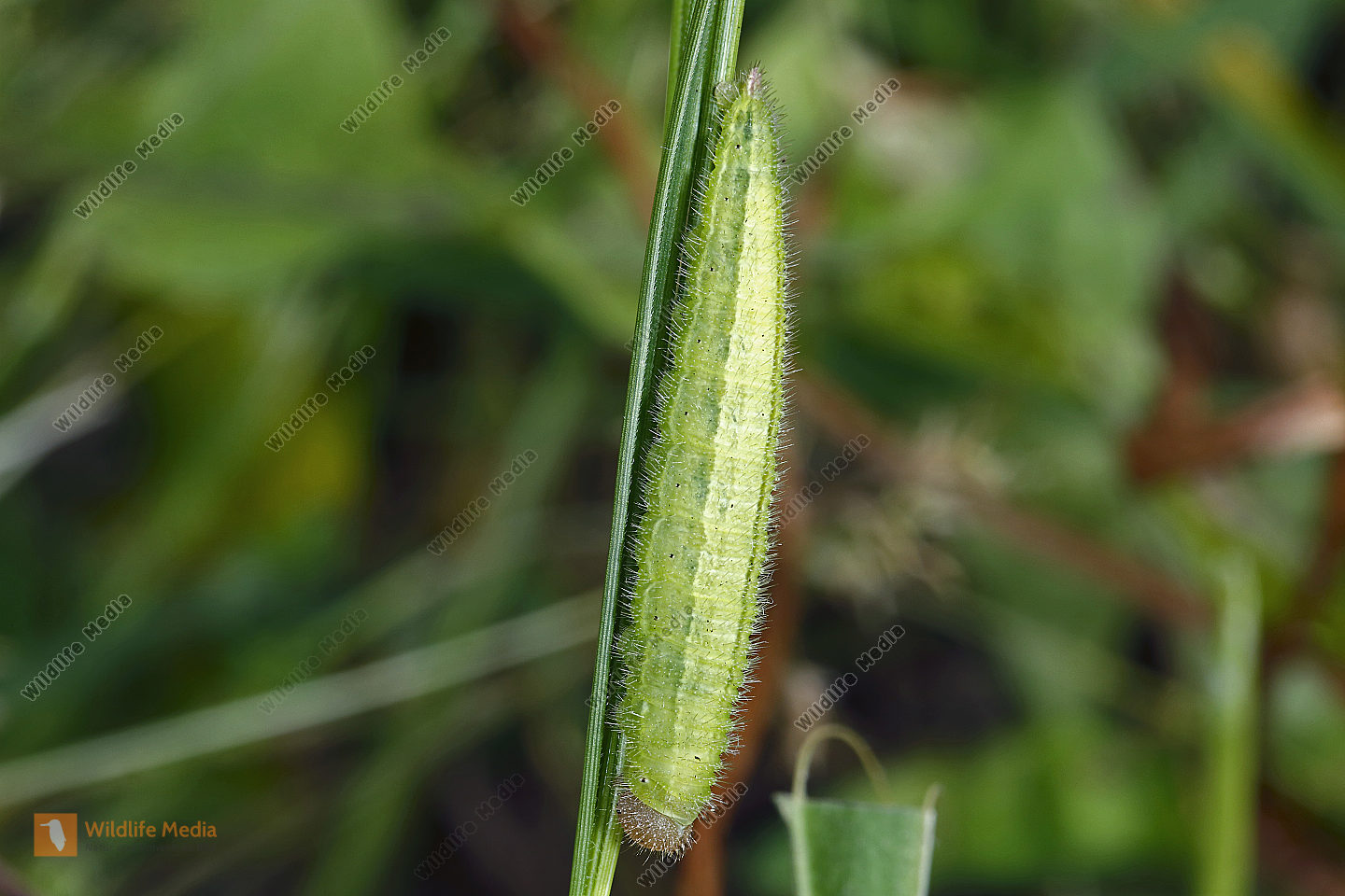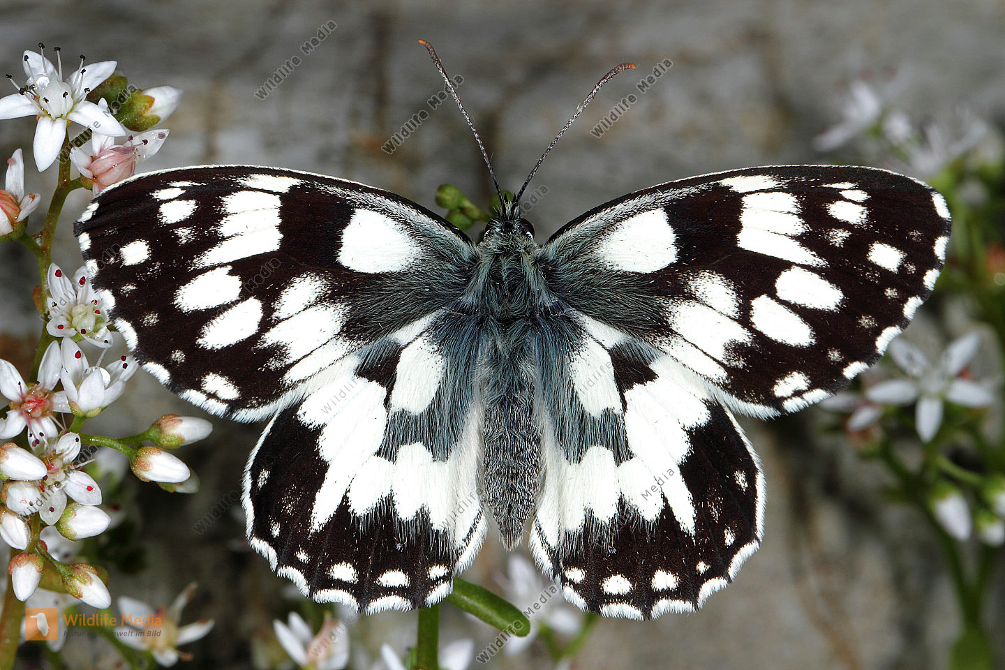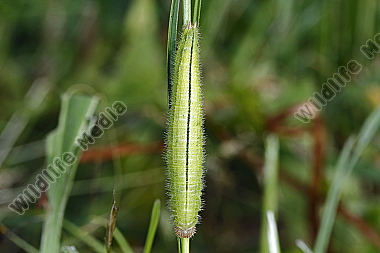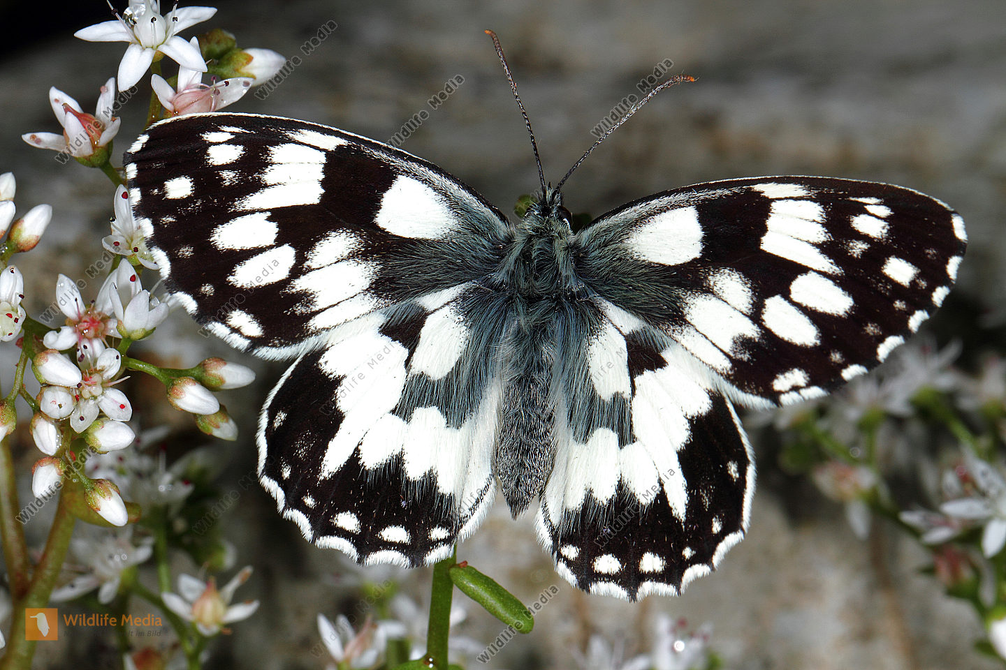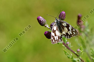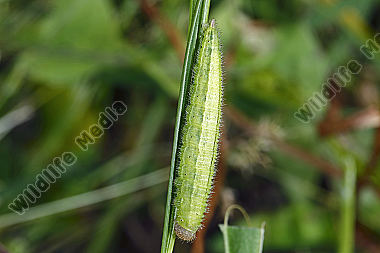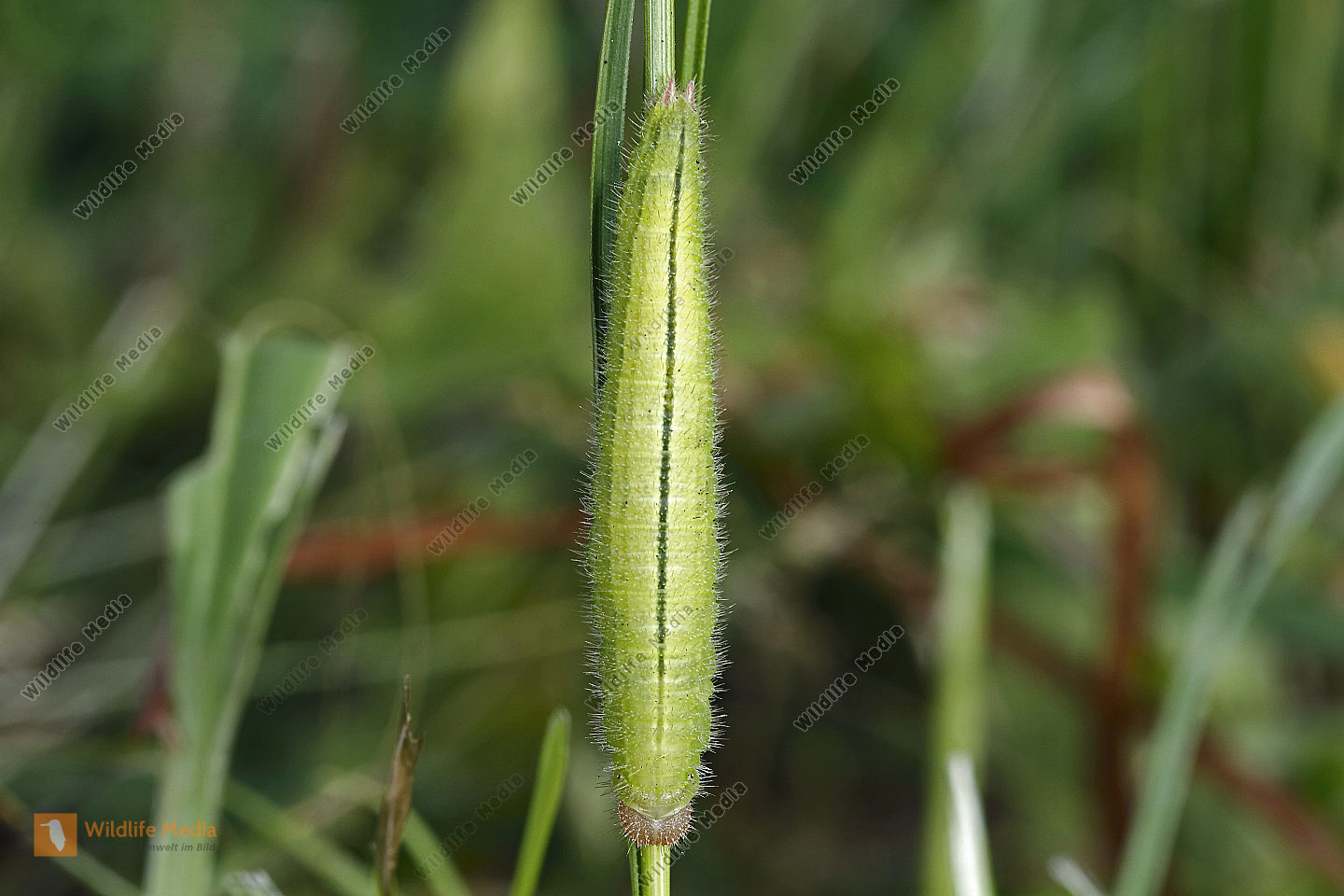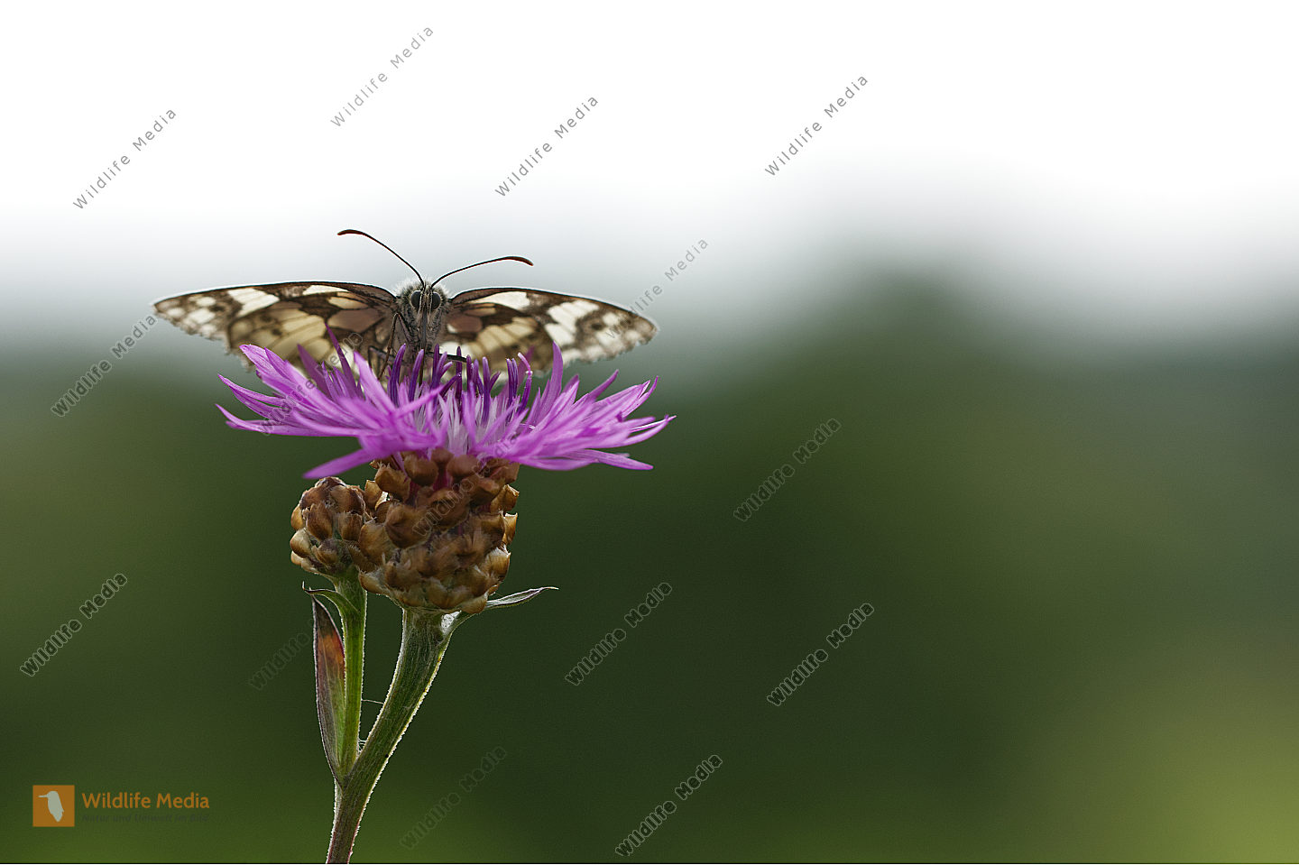 Ein Schachbrettfalter sitzt auf einem Grashalm