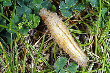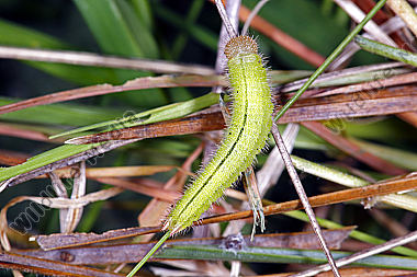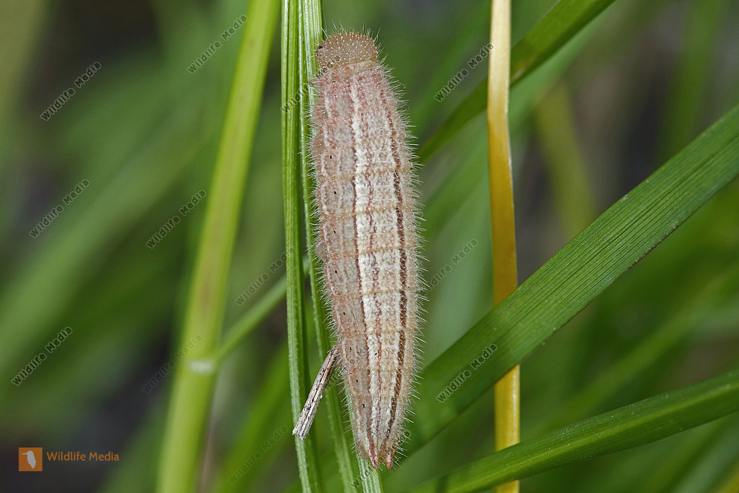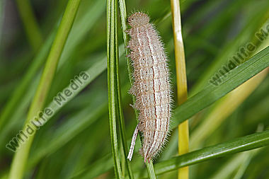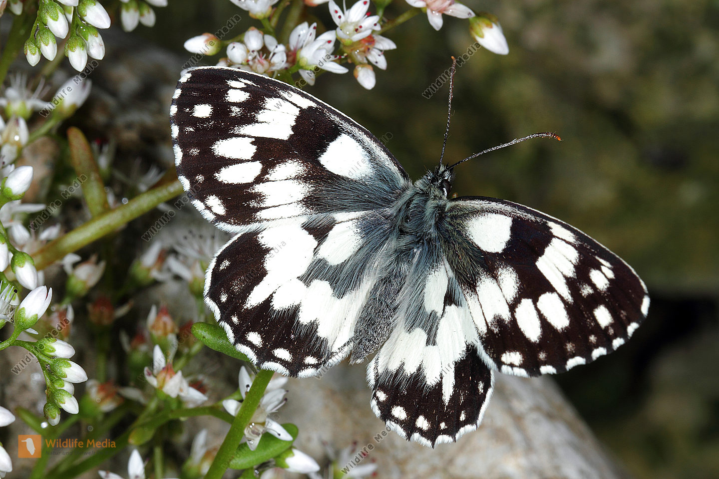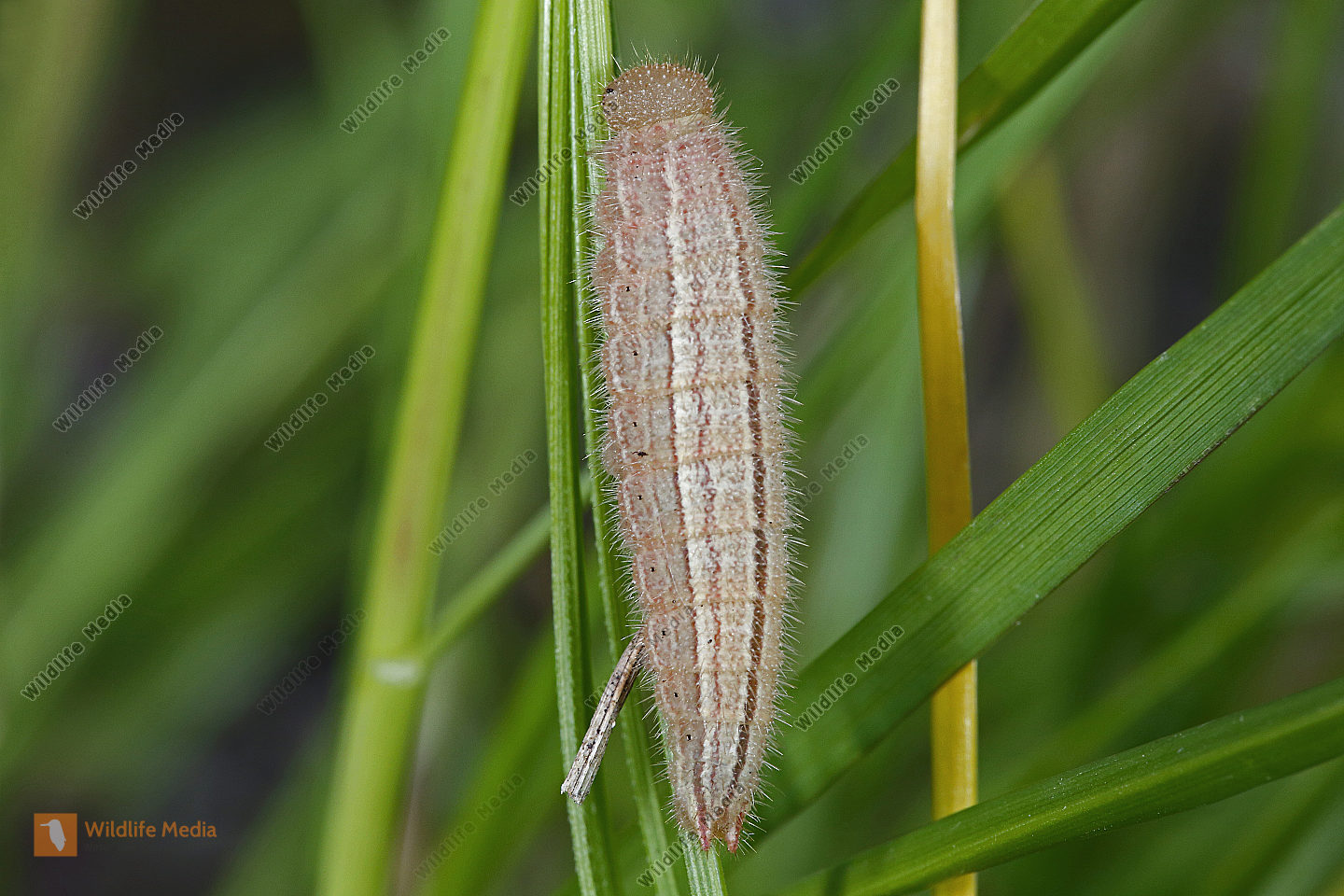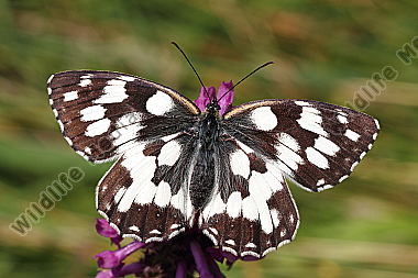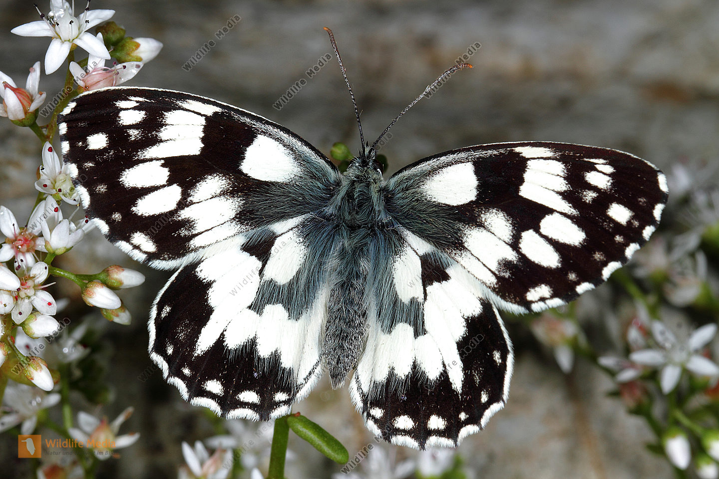 Ein Schachbrettfalter sitzt auf einem Grashalm