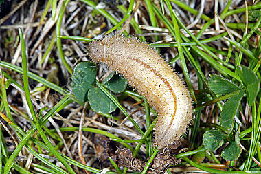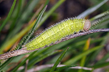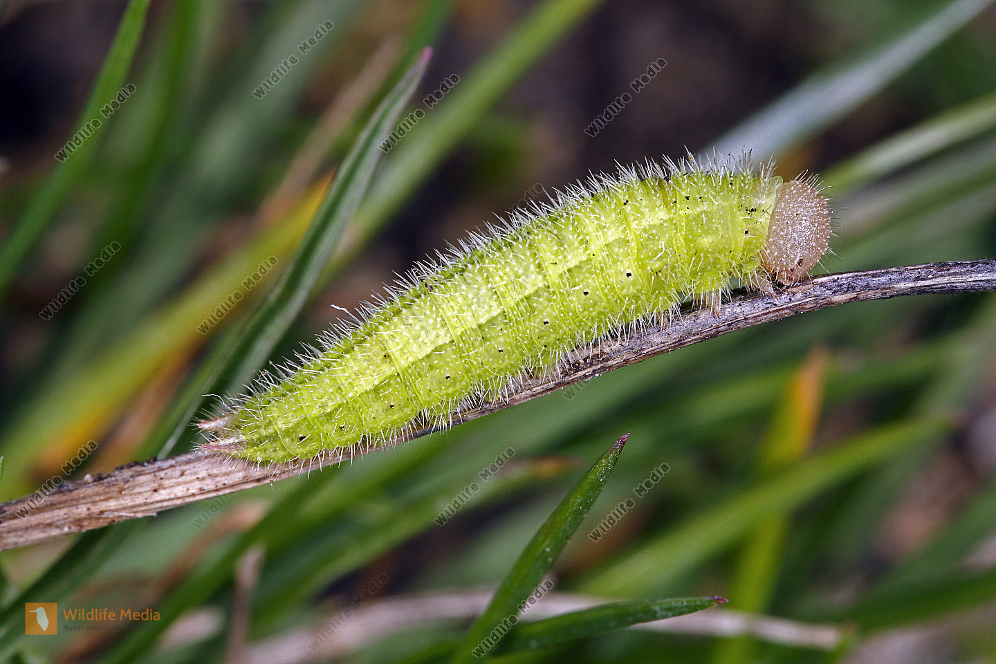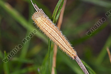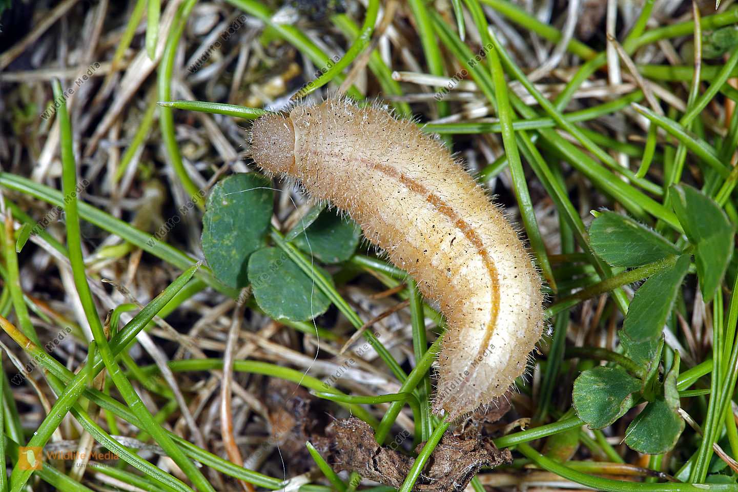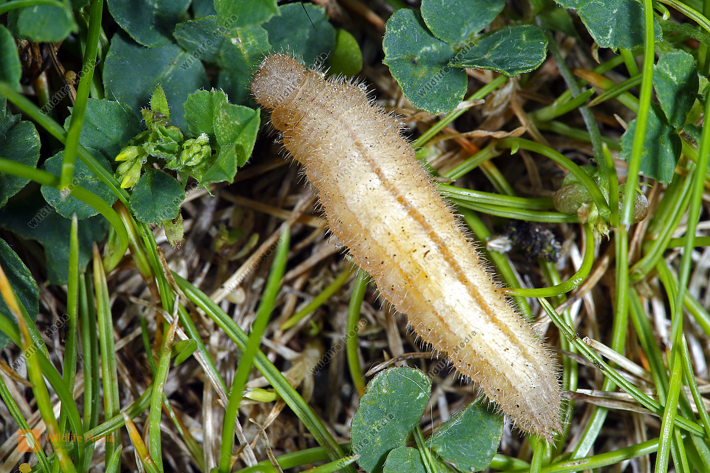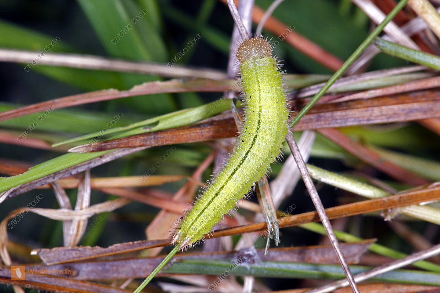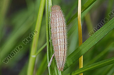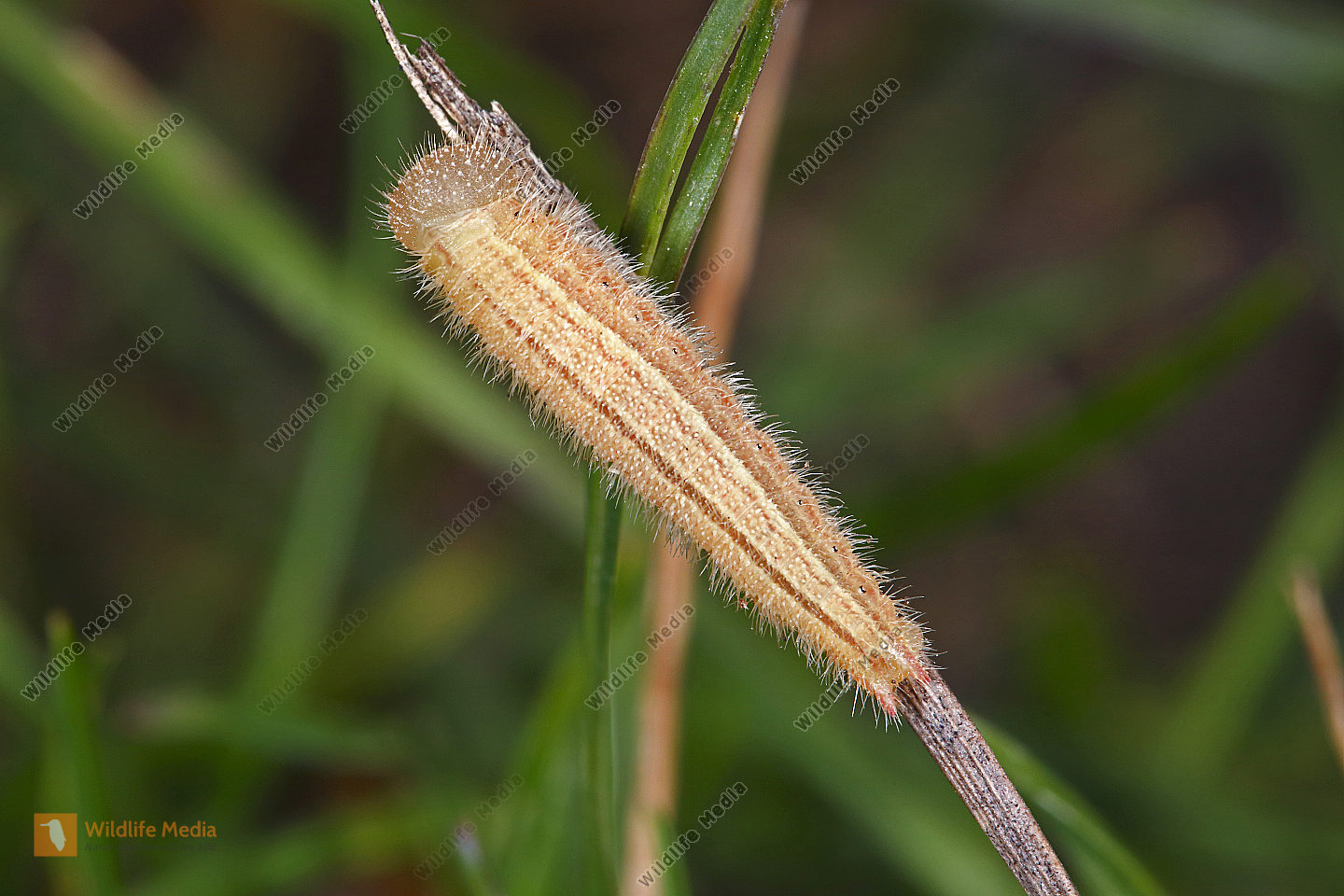 Ein Schachbrettfalter sitzt auf einem Grashalm