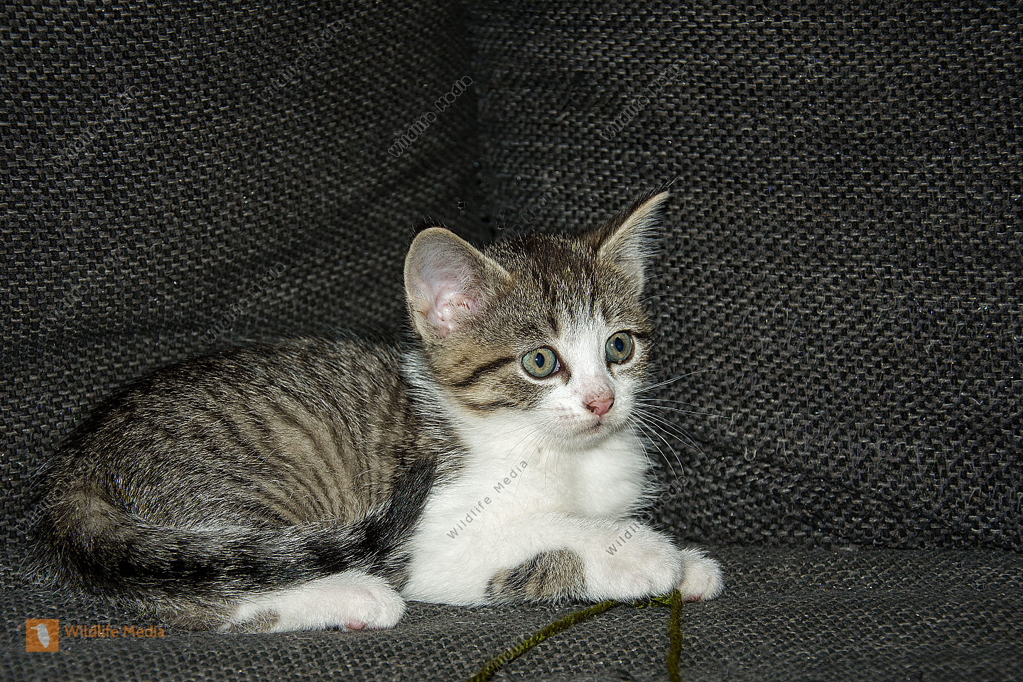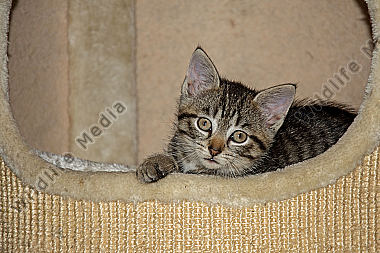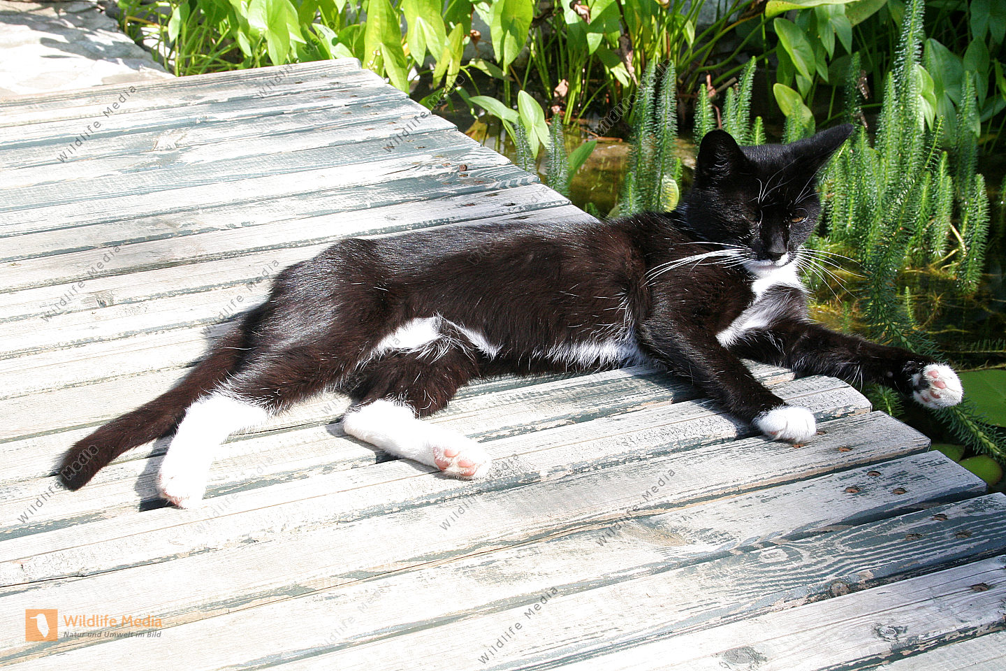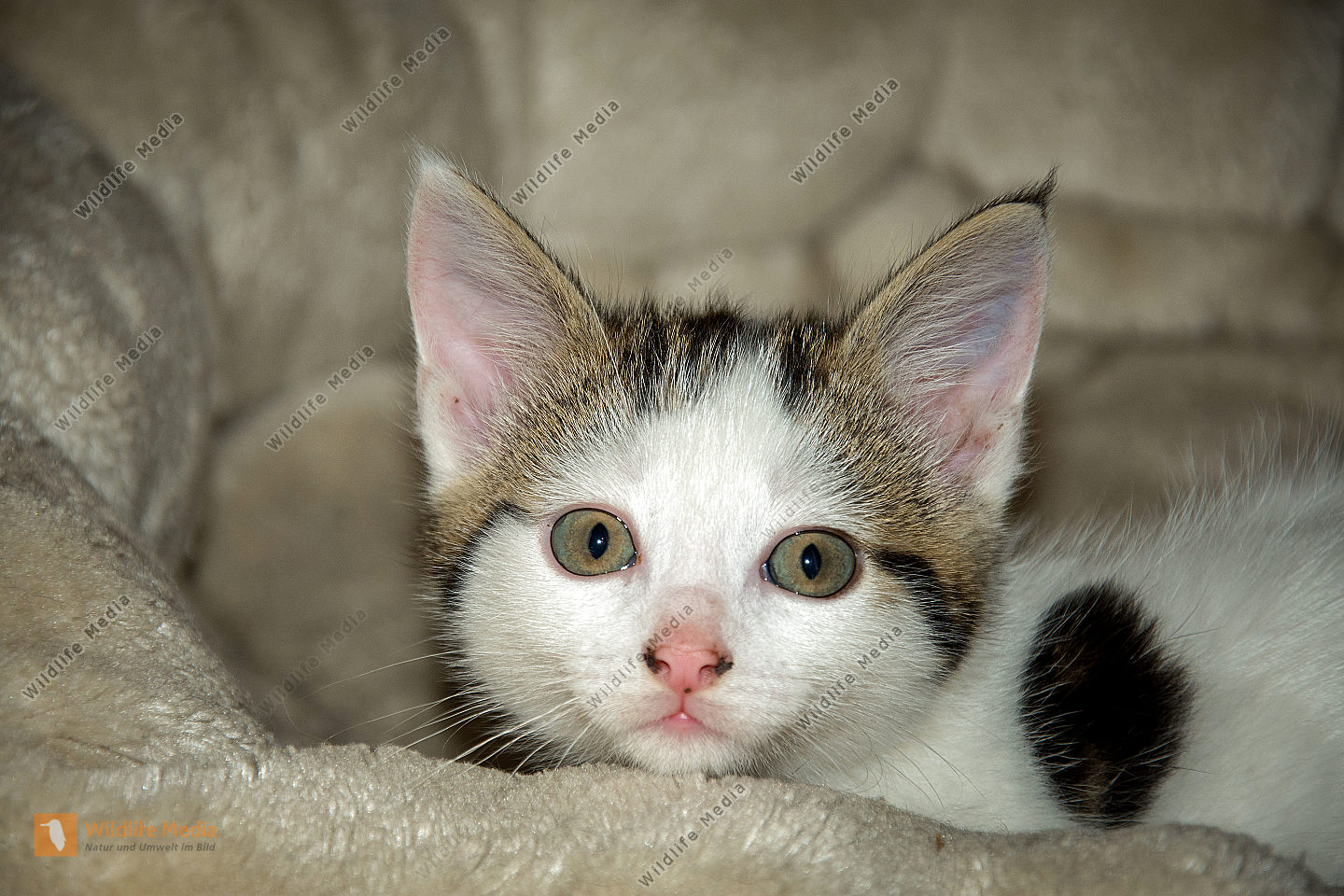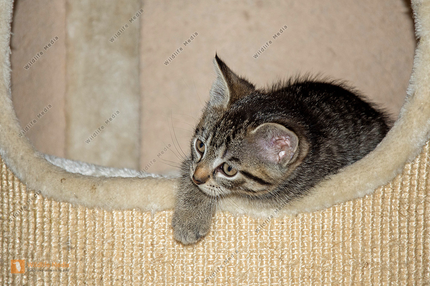 Junge Hauskatze Felis silvestris catus auf Baumstamm