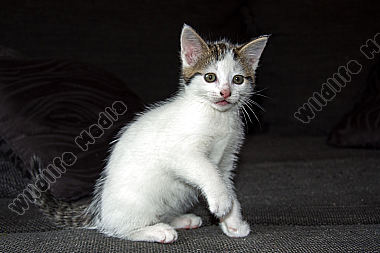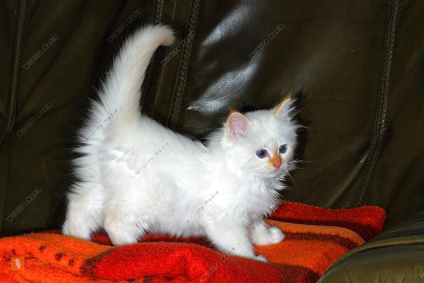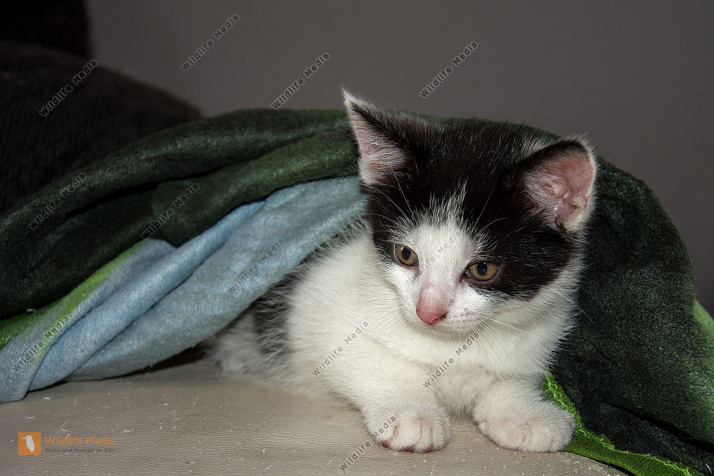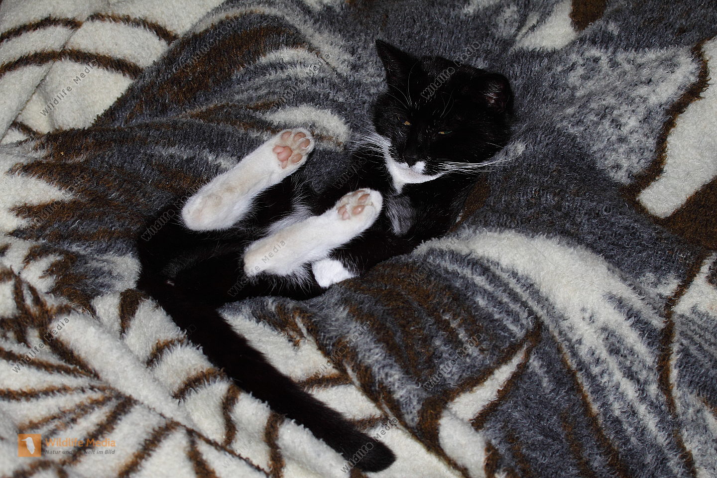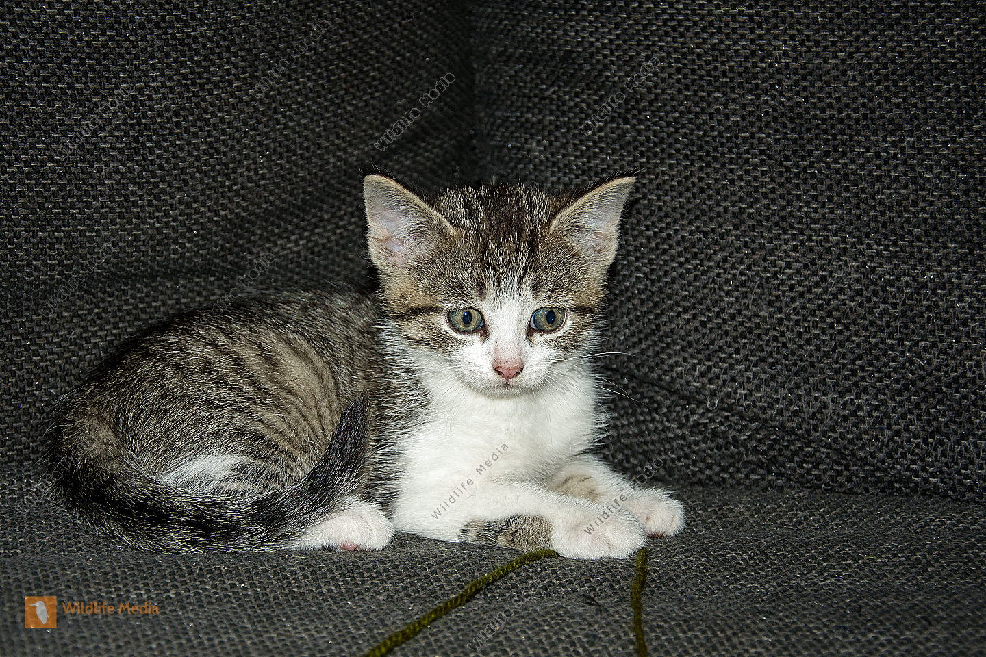Junge Hauskatze Felis silvestris catus auf Baumstamm