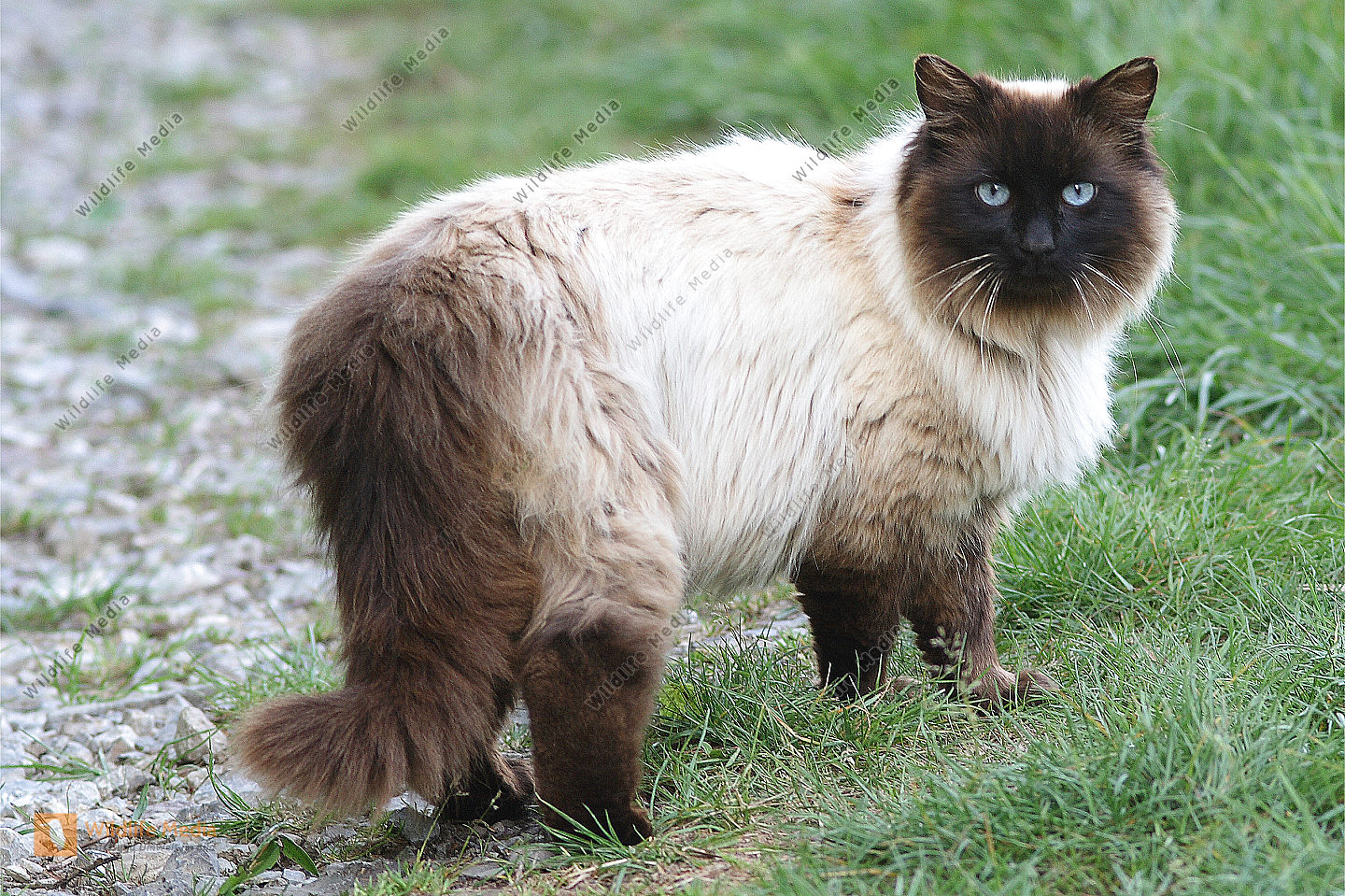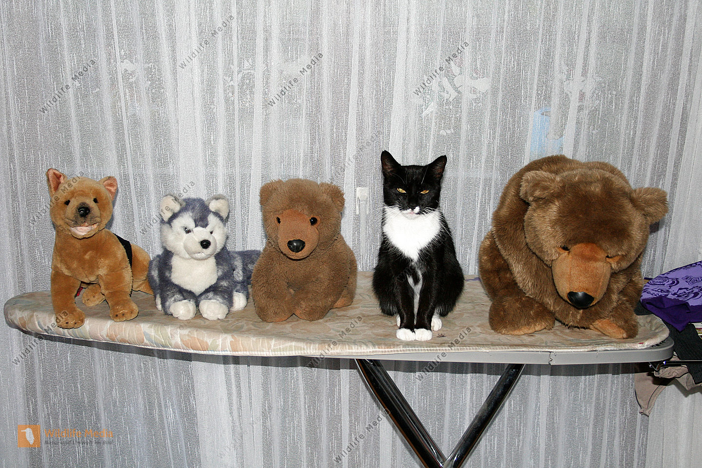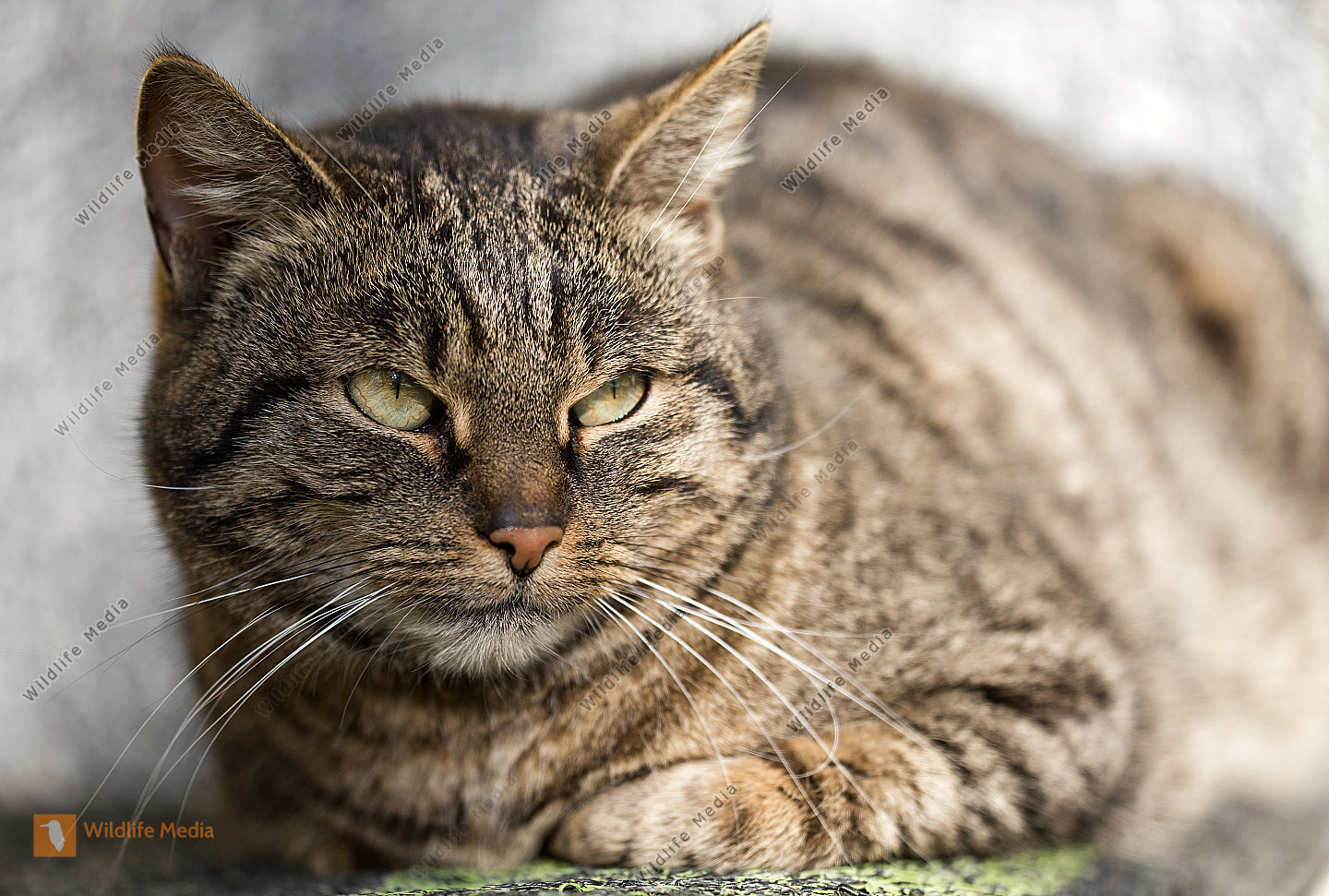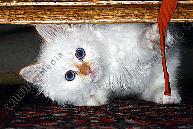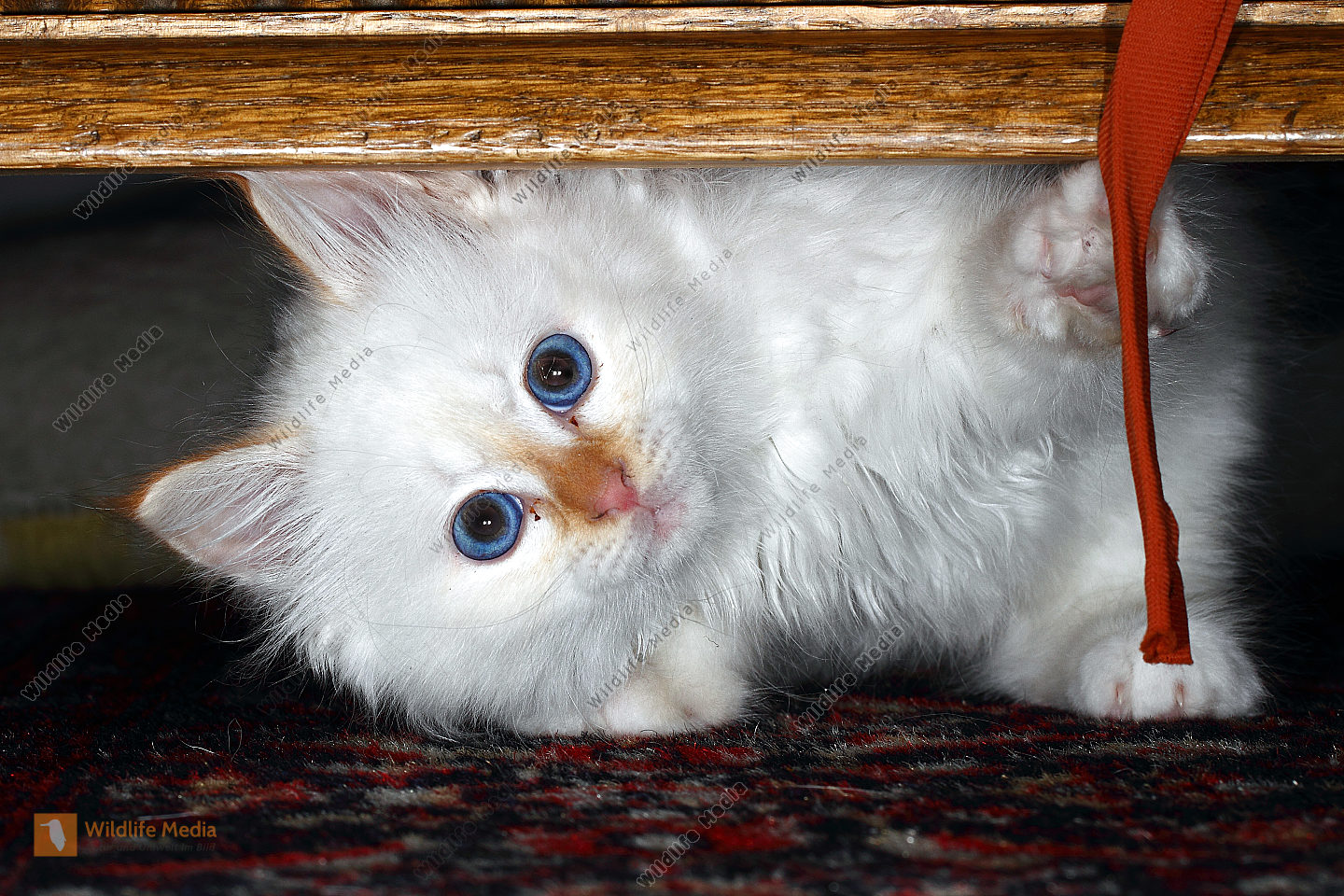 Junge Hauskatze Felis silvestris catus auf Baumstamm