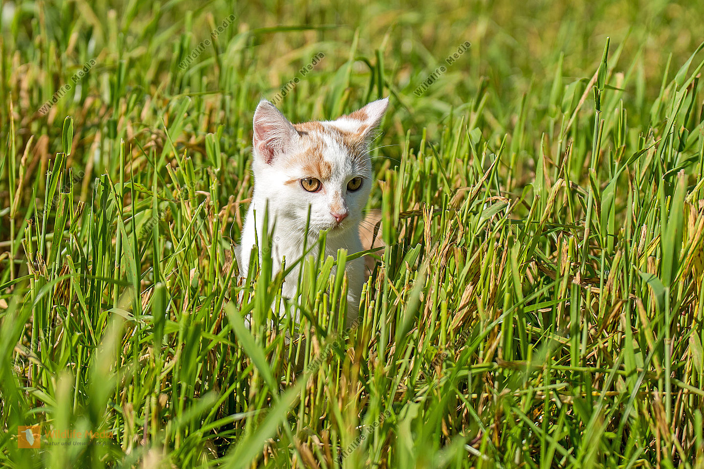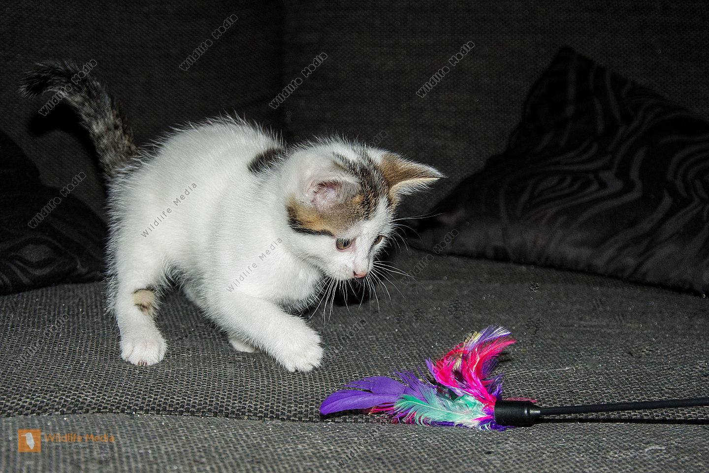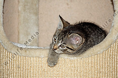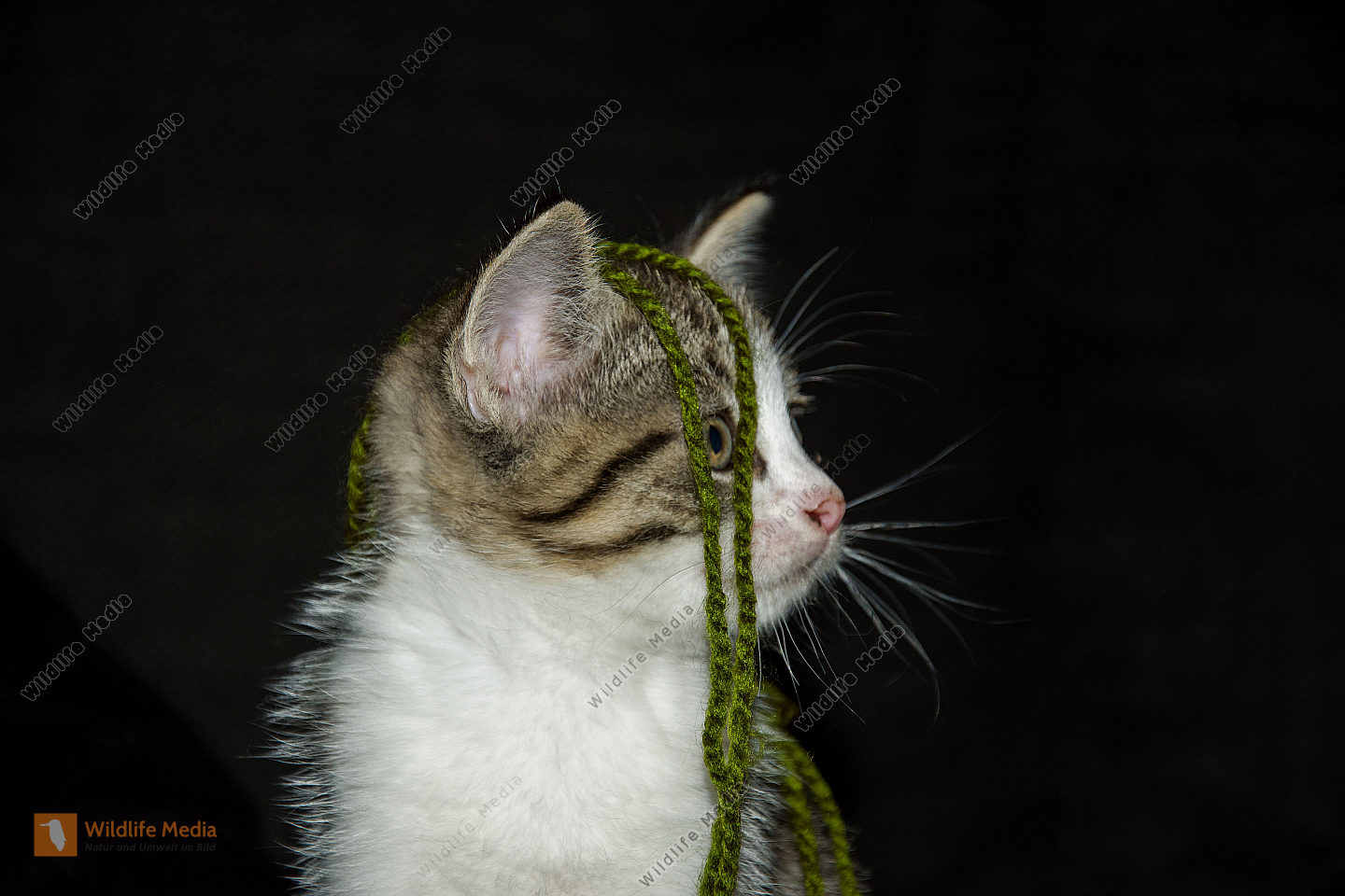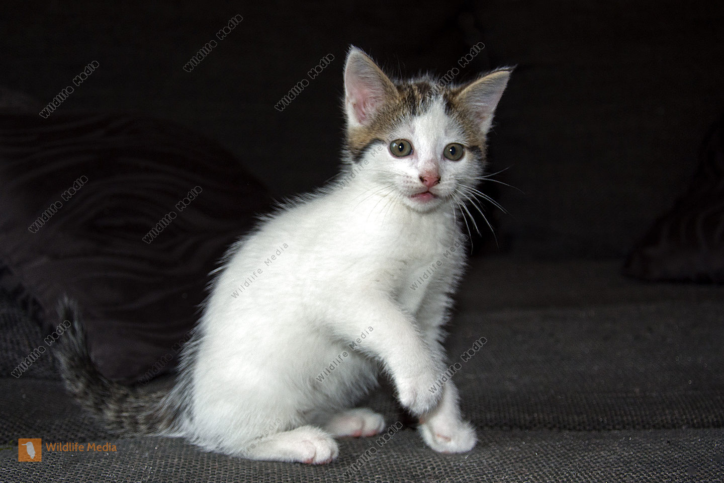 Junge Hauskatze (Felis silvestris f. catus) auf einem Ast