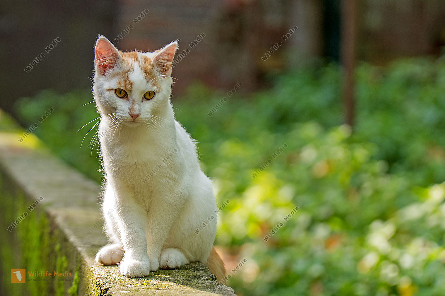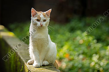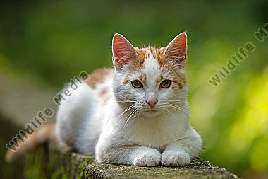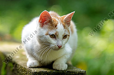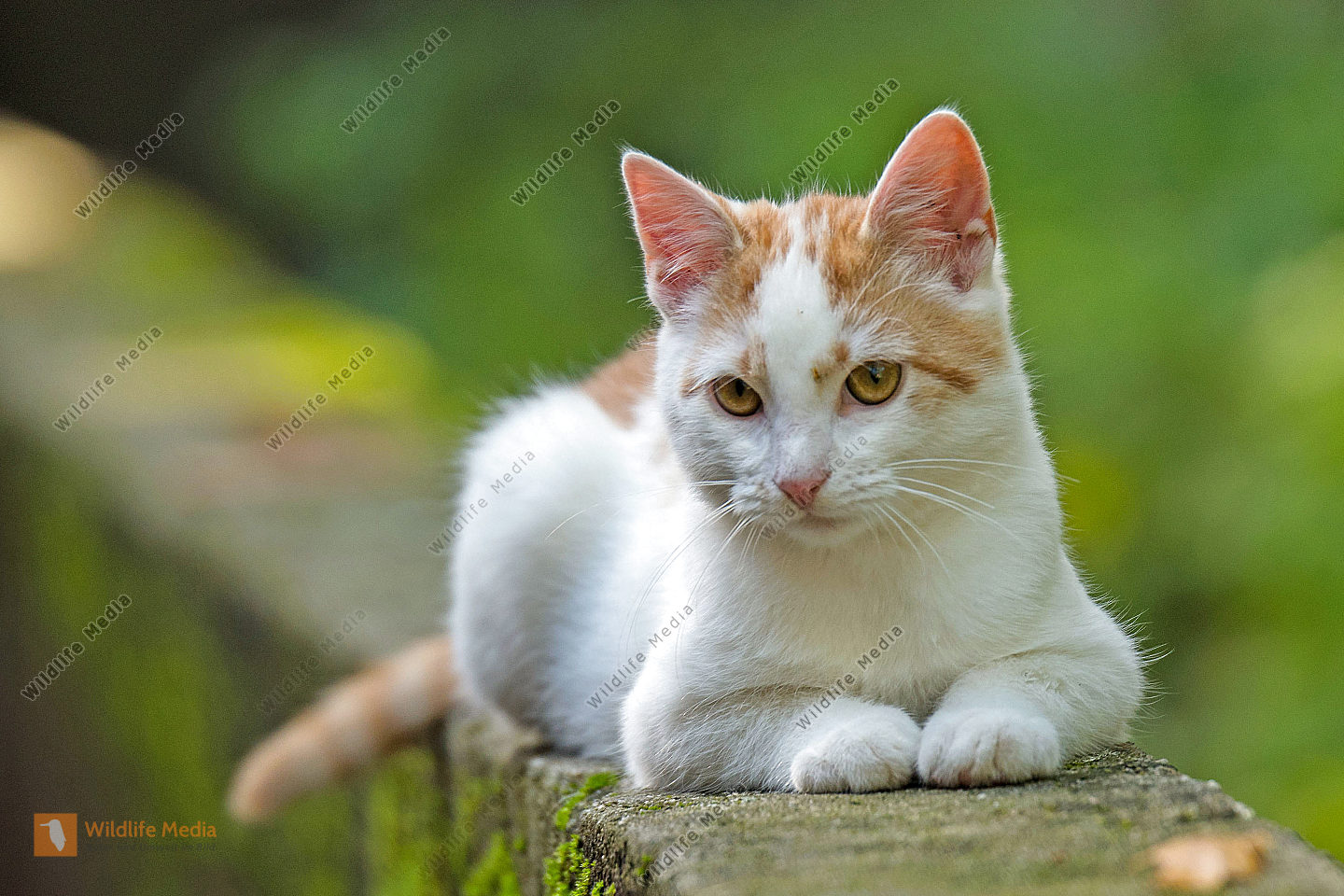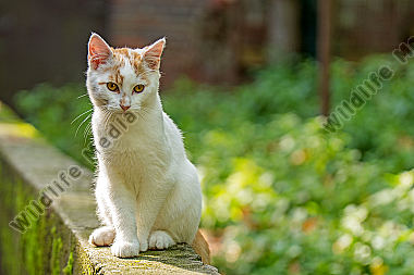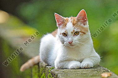 Hauskatze Felis silvestris catus auf dem Gartenzaun