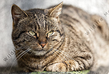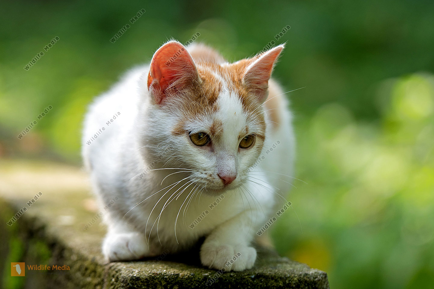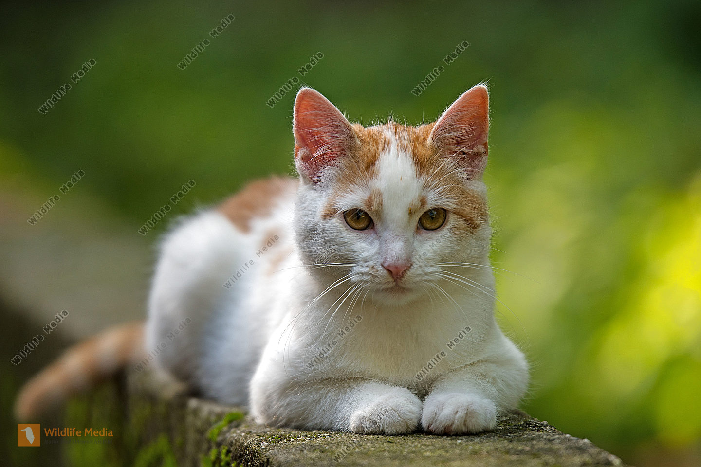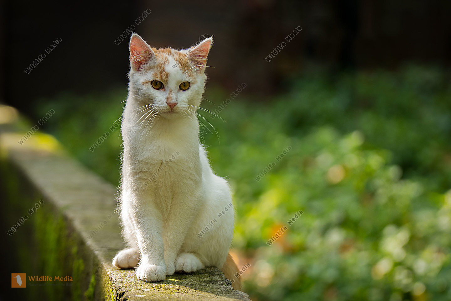 Hauskatze Felis silvestris catus auf dem Gartenzaun