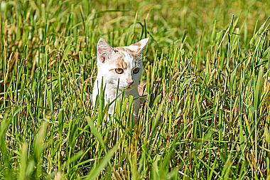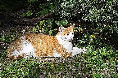 Hauskatze (Felis silvestris f. catus) im Apfelbaum