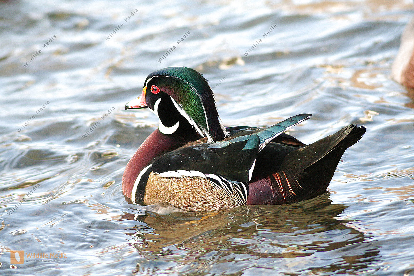 Ein Brautenten-Erpel auf dem Altarm der Saar im Stadtpark von Saarlouis.