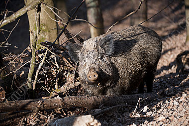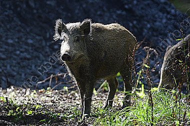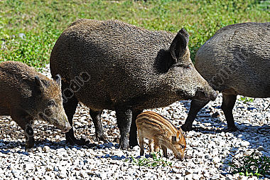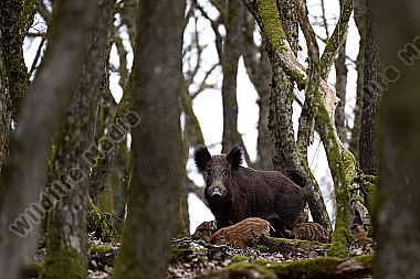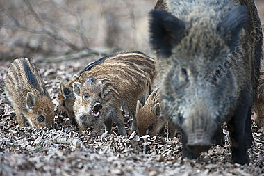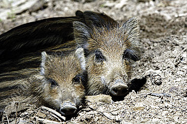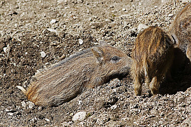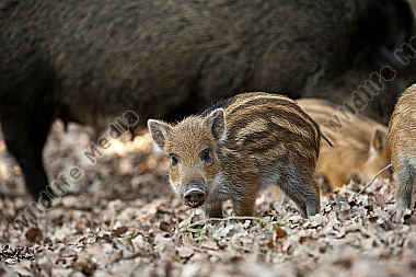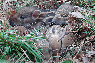 Zoom Wildschwein Sus scrofa Jungtiere im Kessel Tarnung