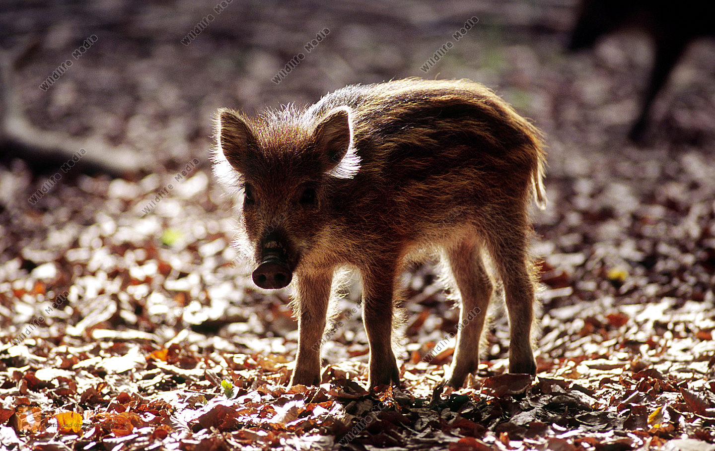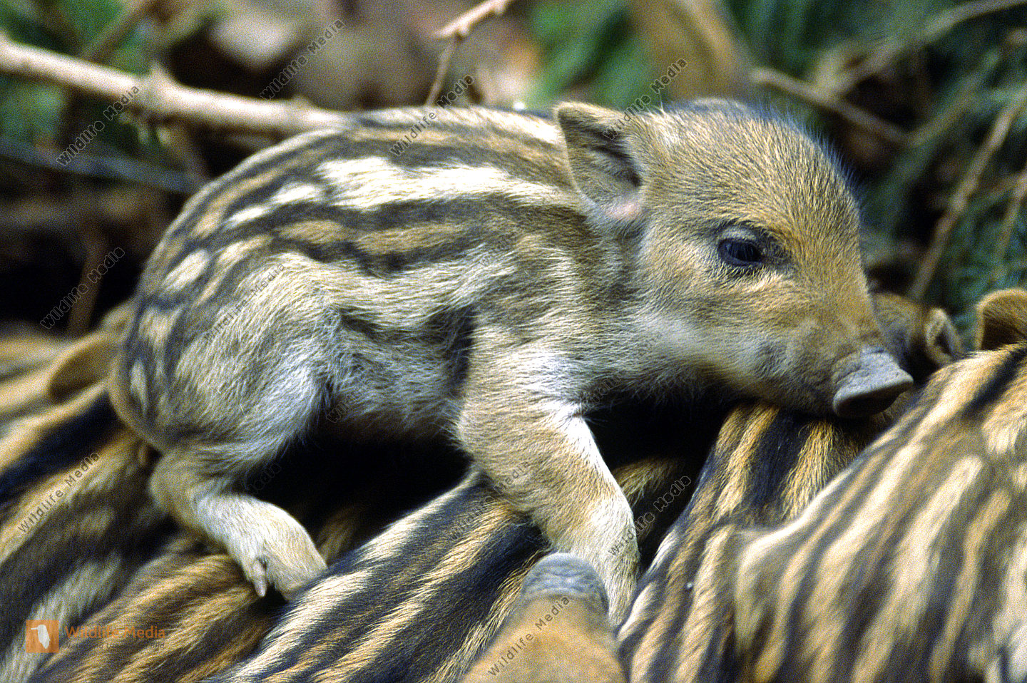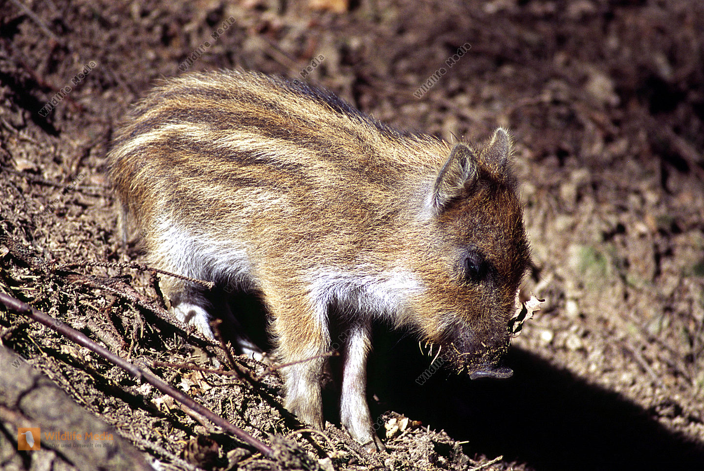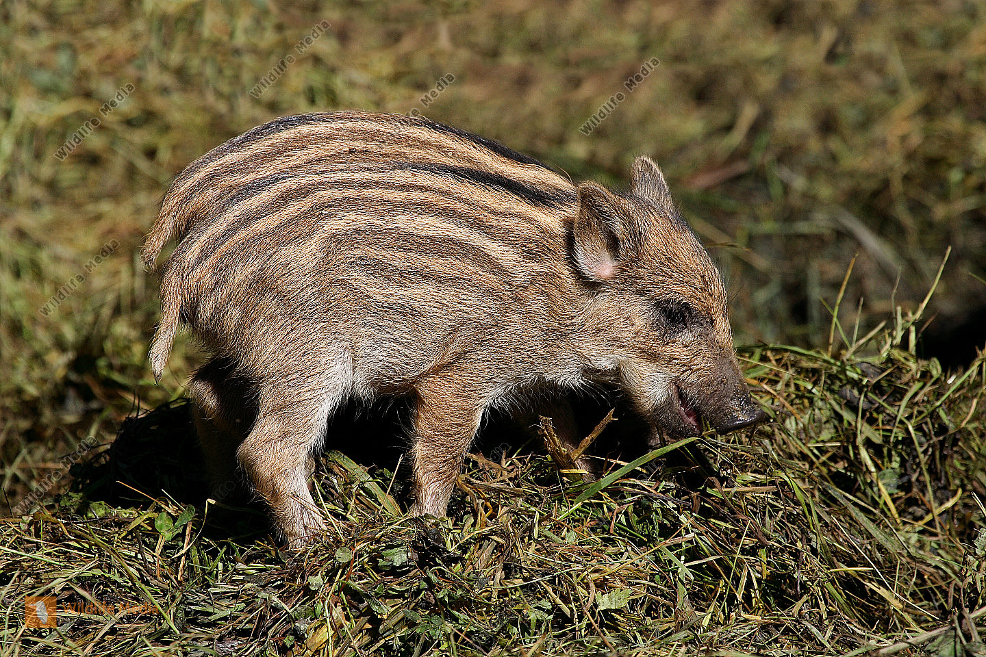 Junges Wildschwein Sus scrofa Frischling mit Klettengewächs