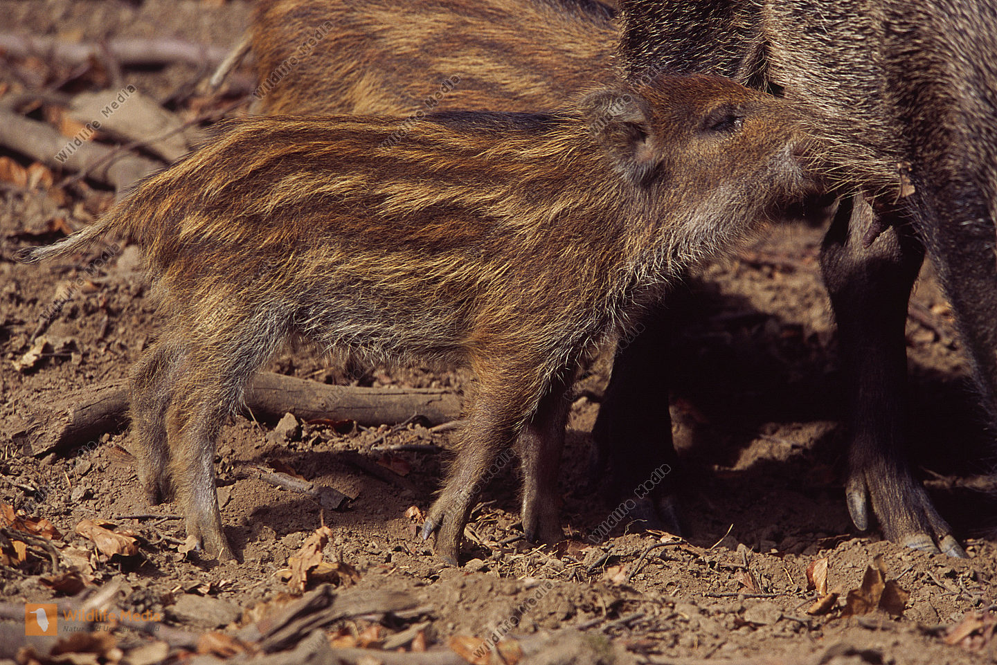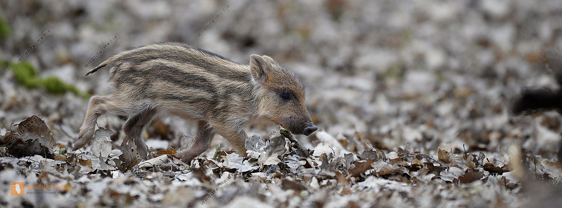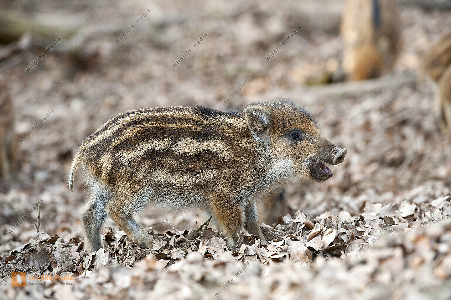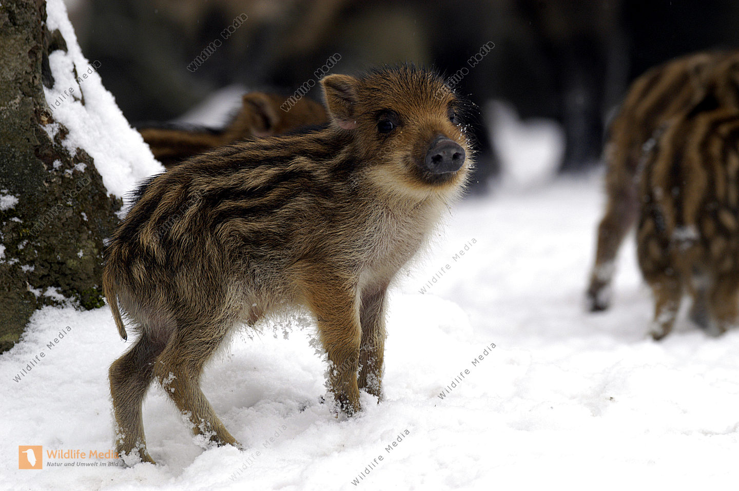 Junges Wildschwein Sus scrofa Frischling mit Klettengewächs