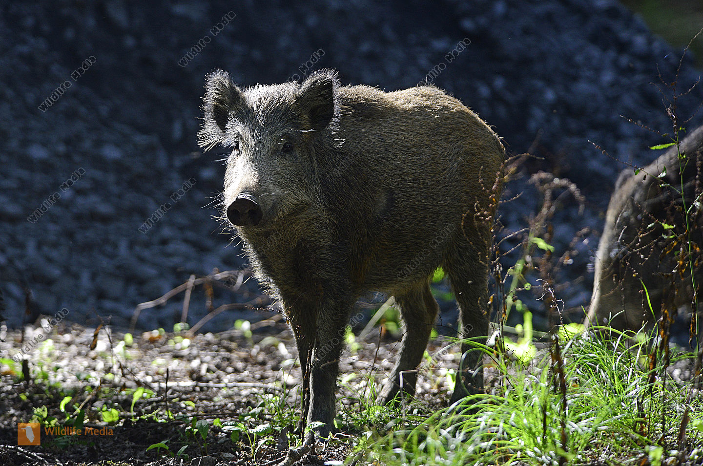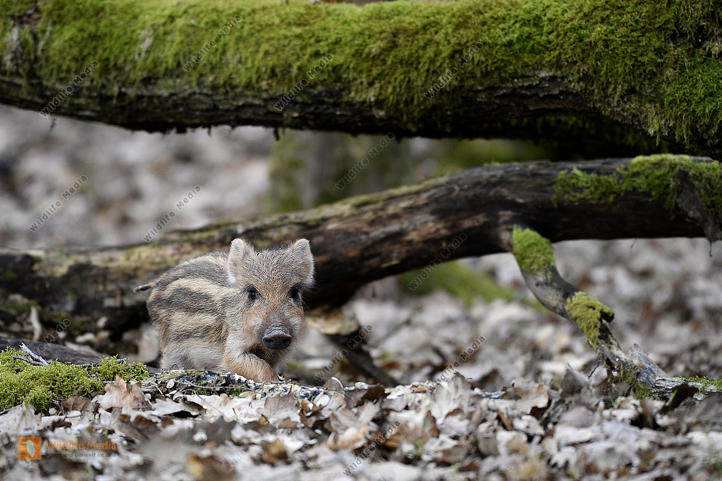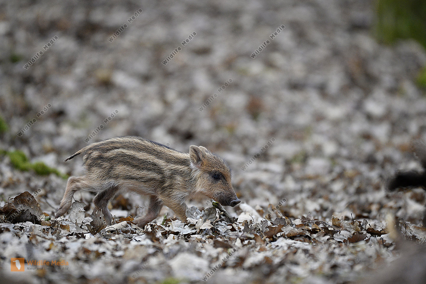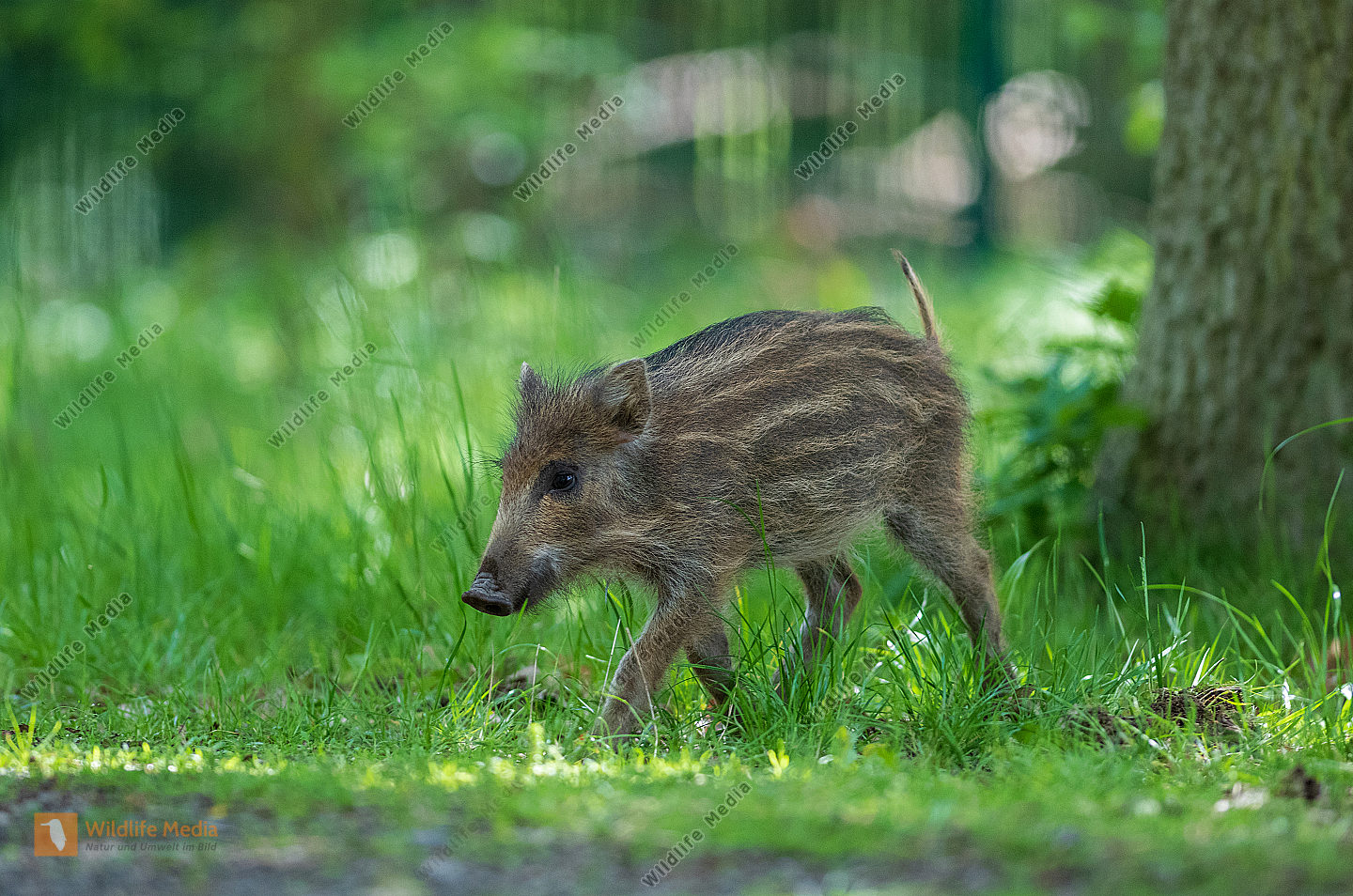 Junges Wildschwein Sus scrofa Frischling mit Klettengewächs