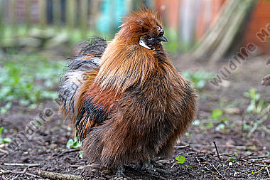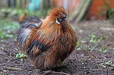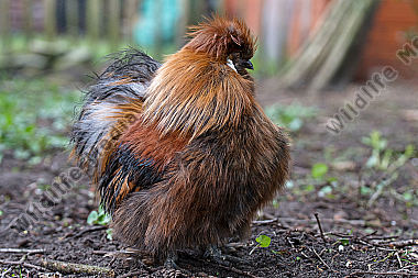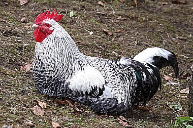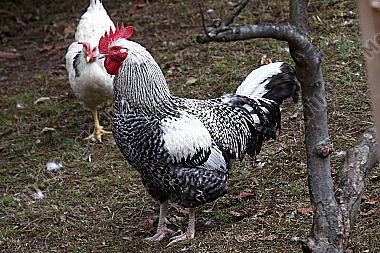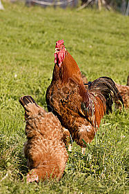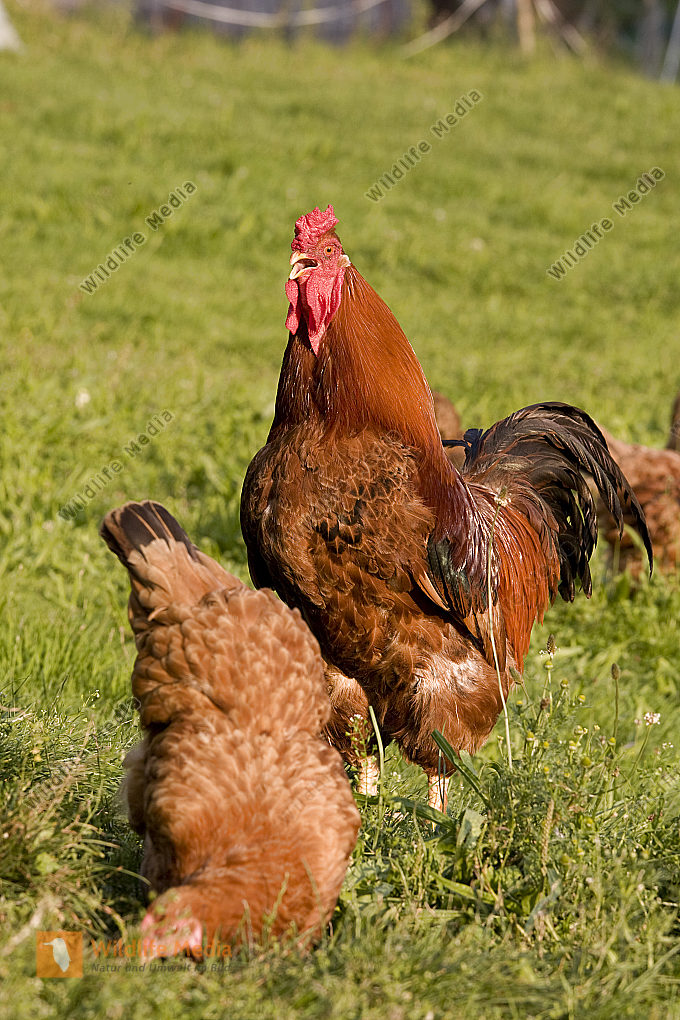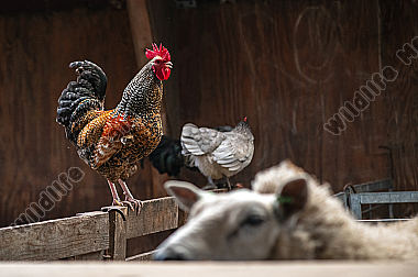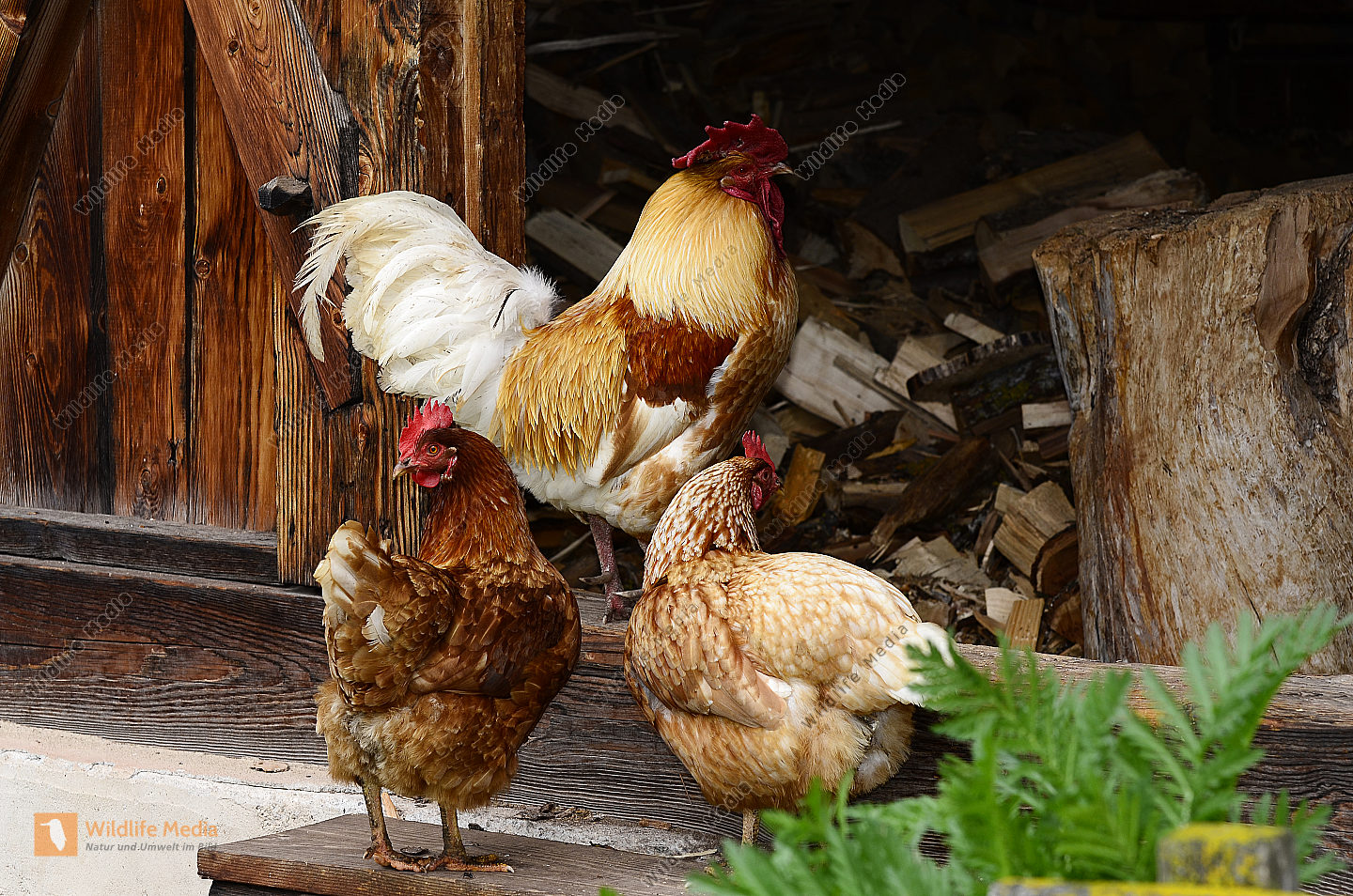 Hahn und Hühner Gallus gallus domesticus im Schafstall