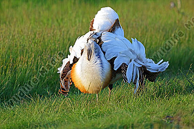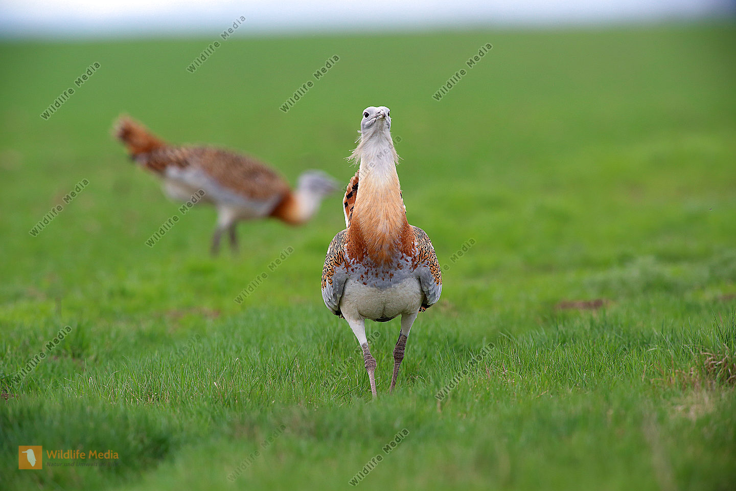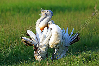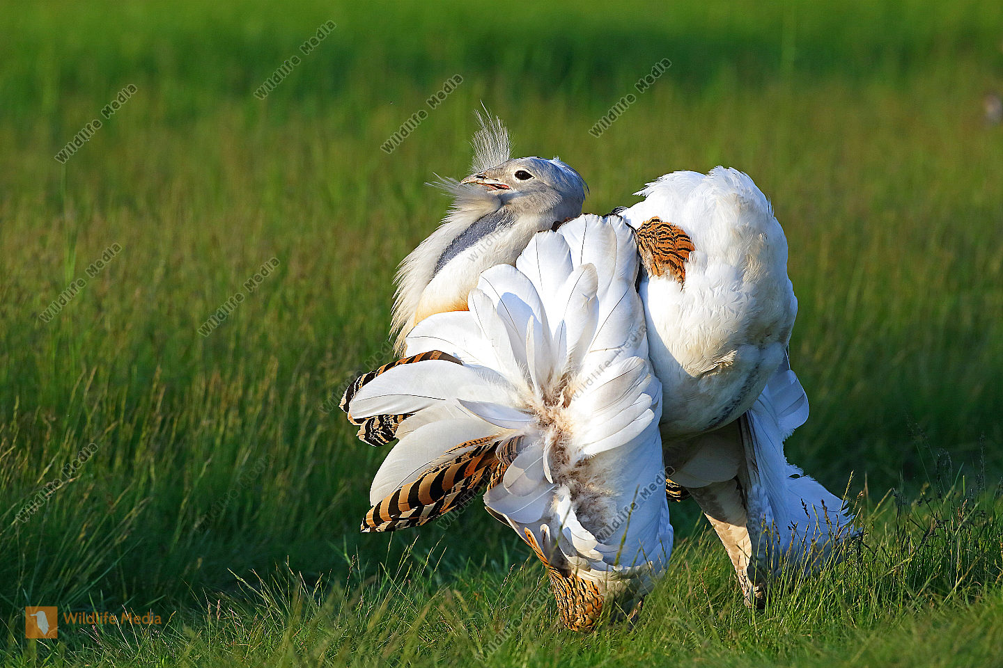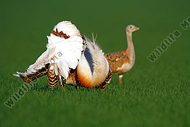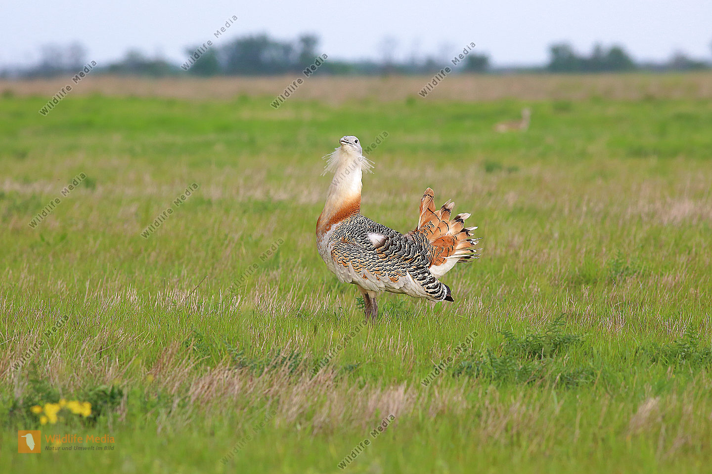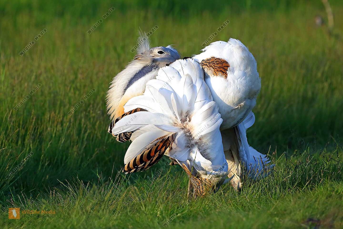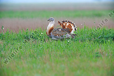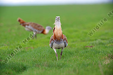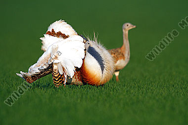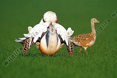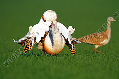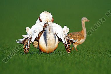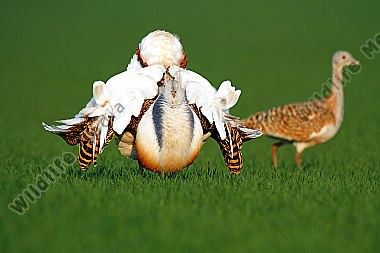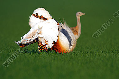 Großtrappe balzender Hahn mit Henne im Hintergrund