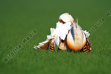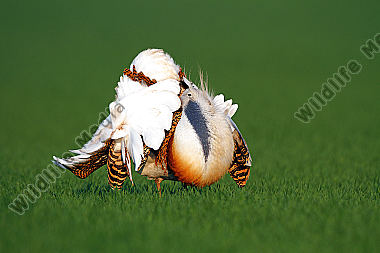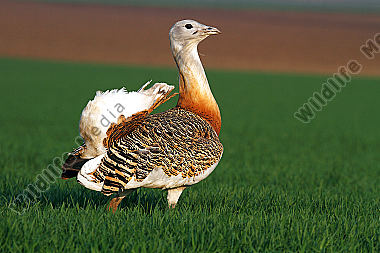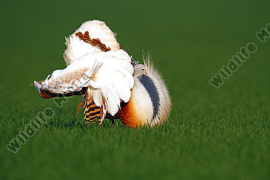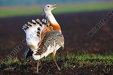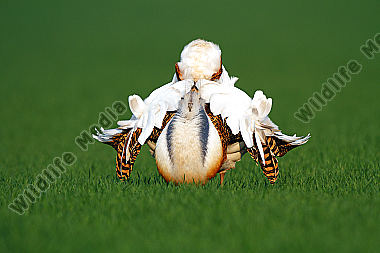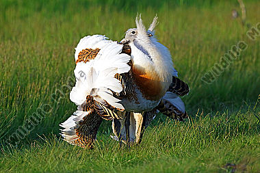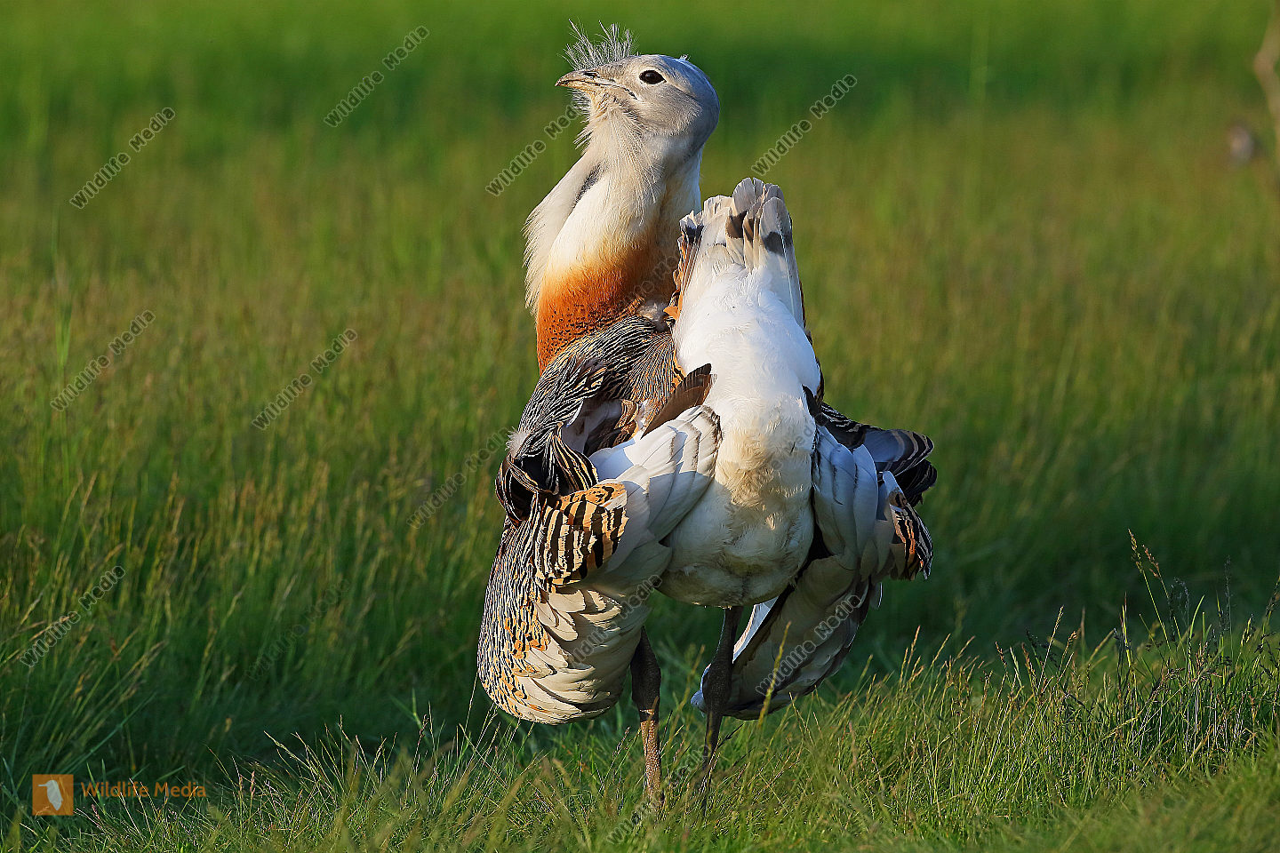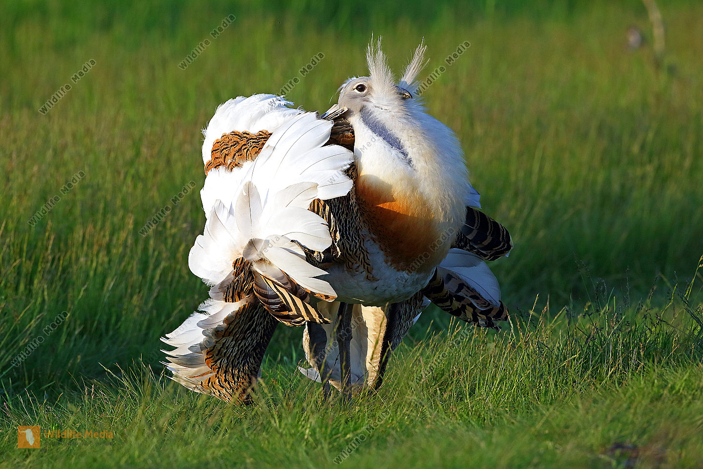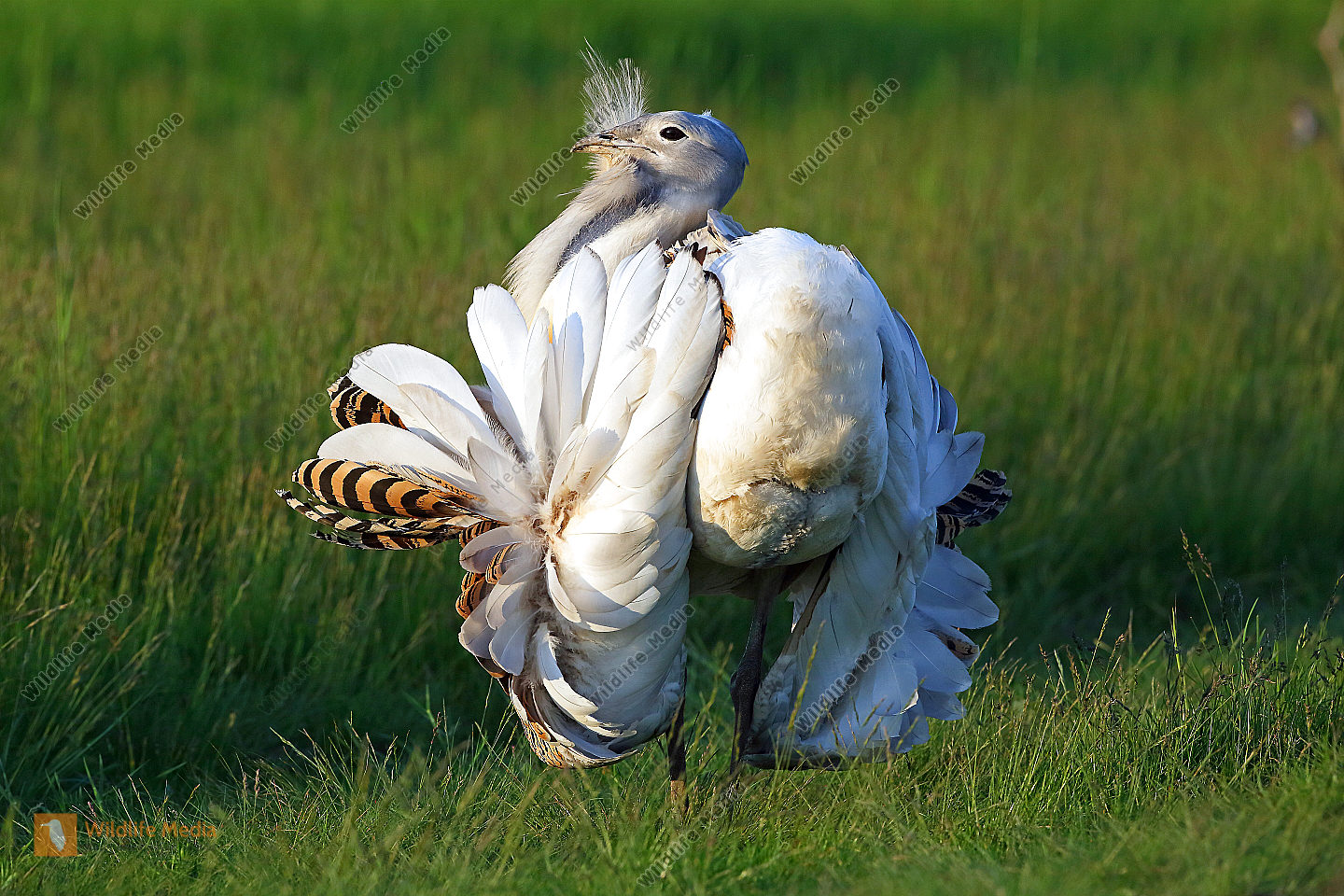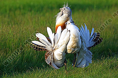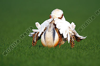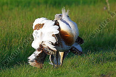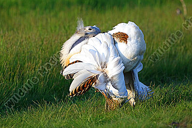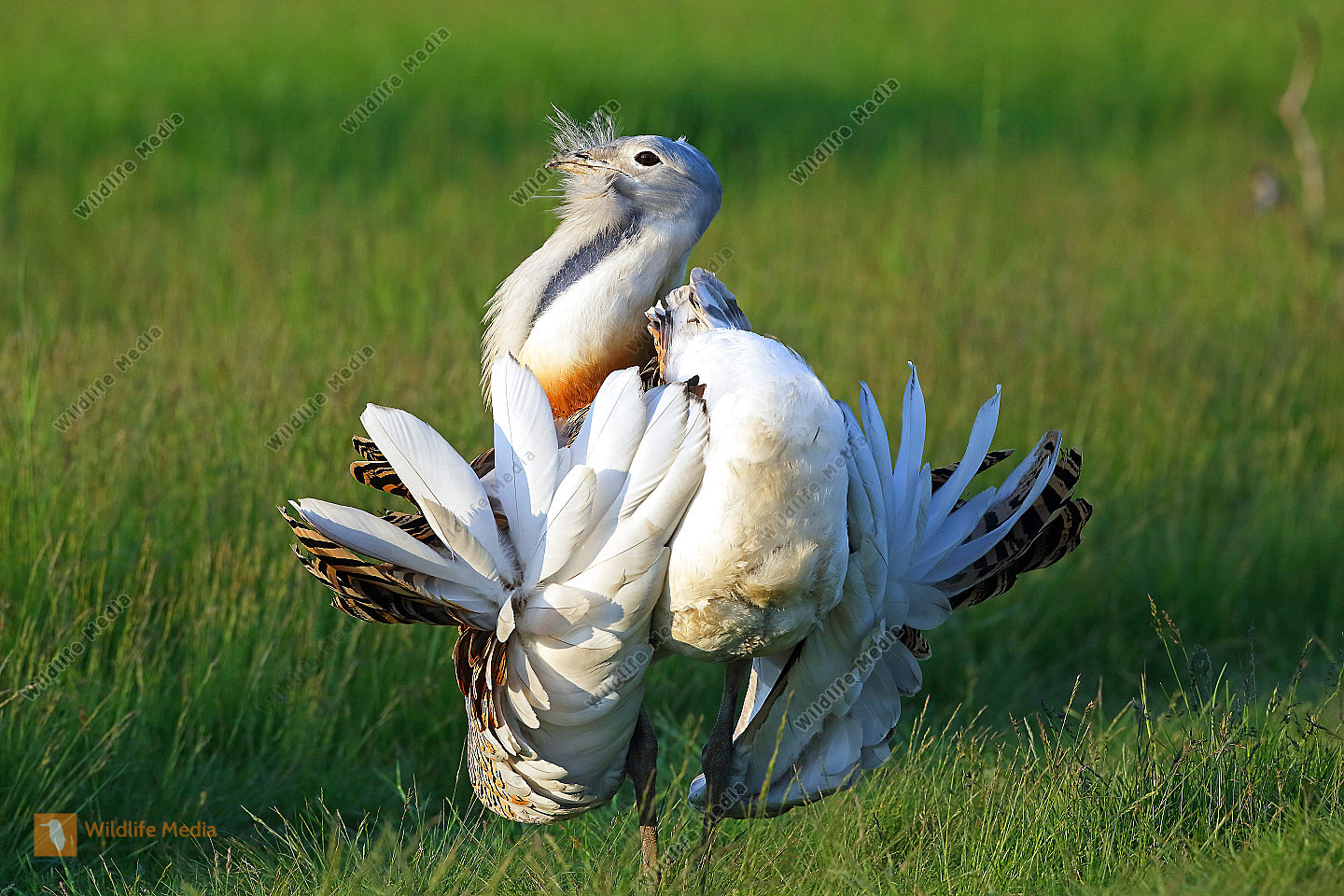 Großtrappe balzender Hahn mit Henne im Hintergrund