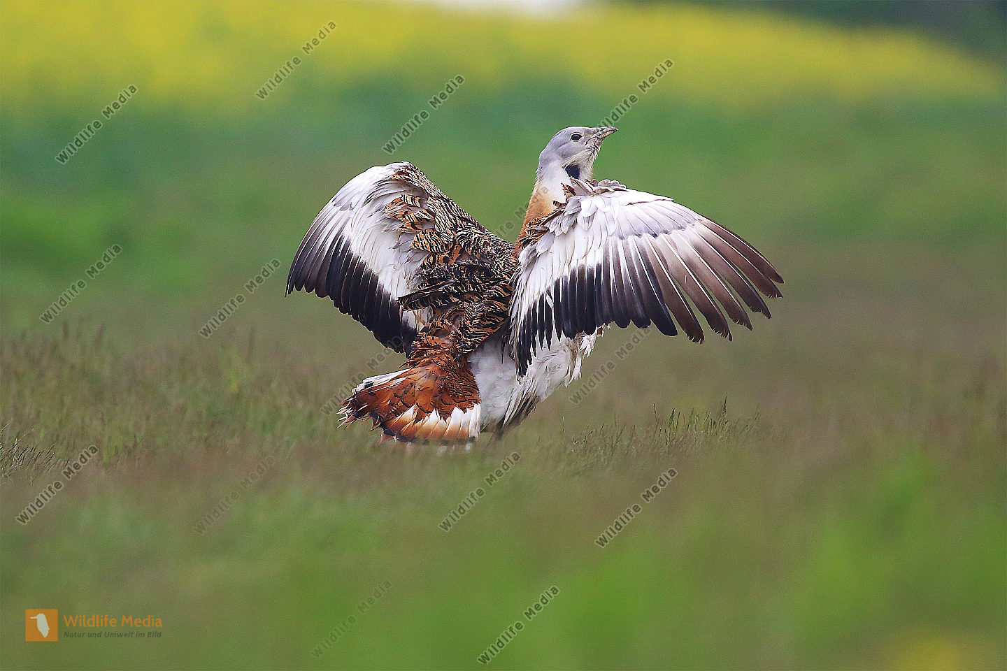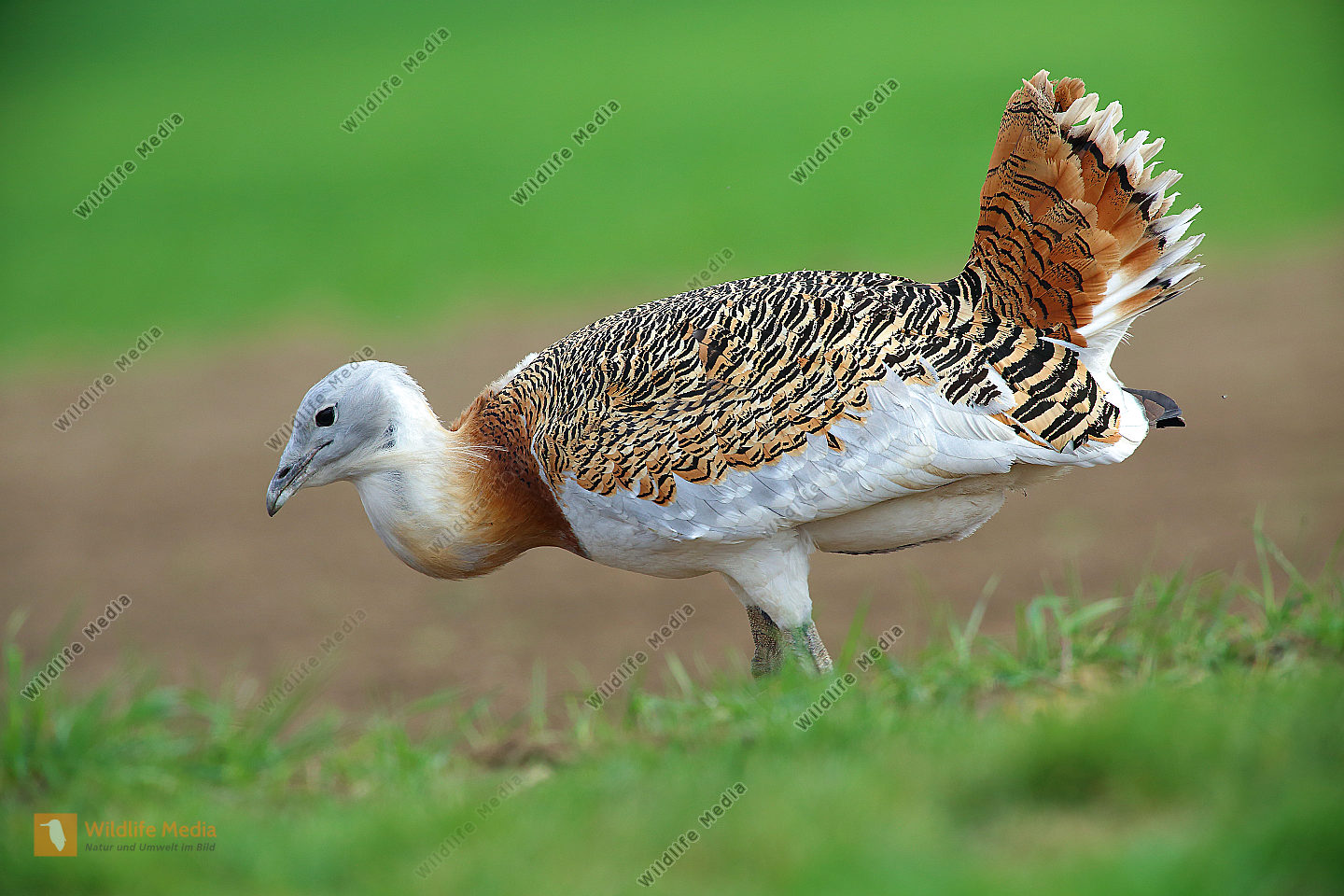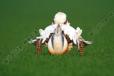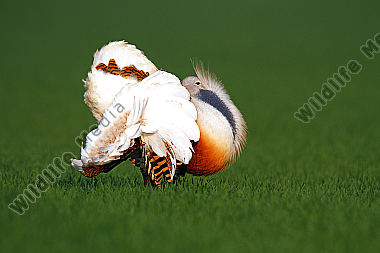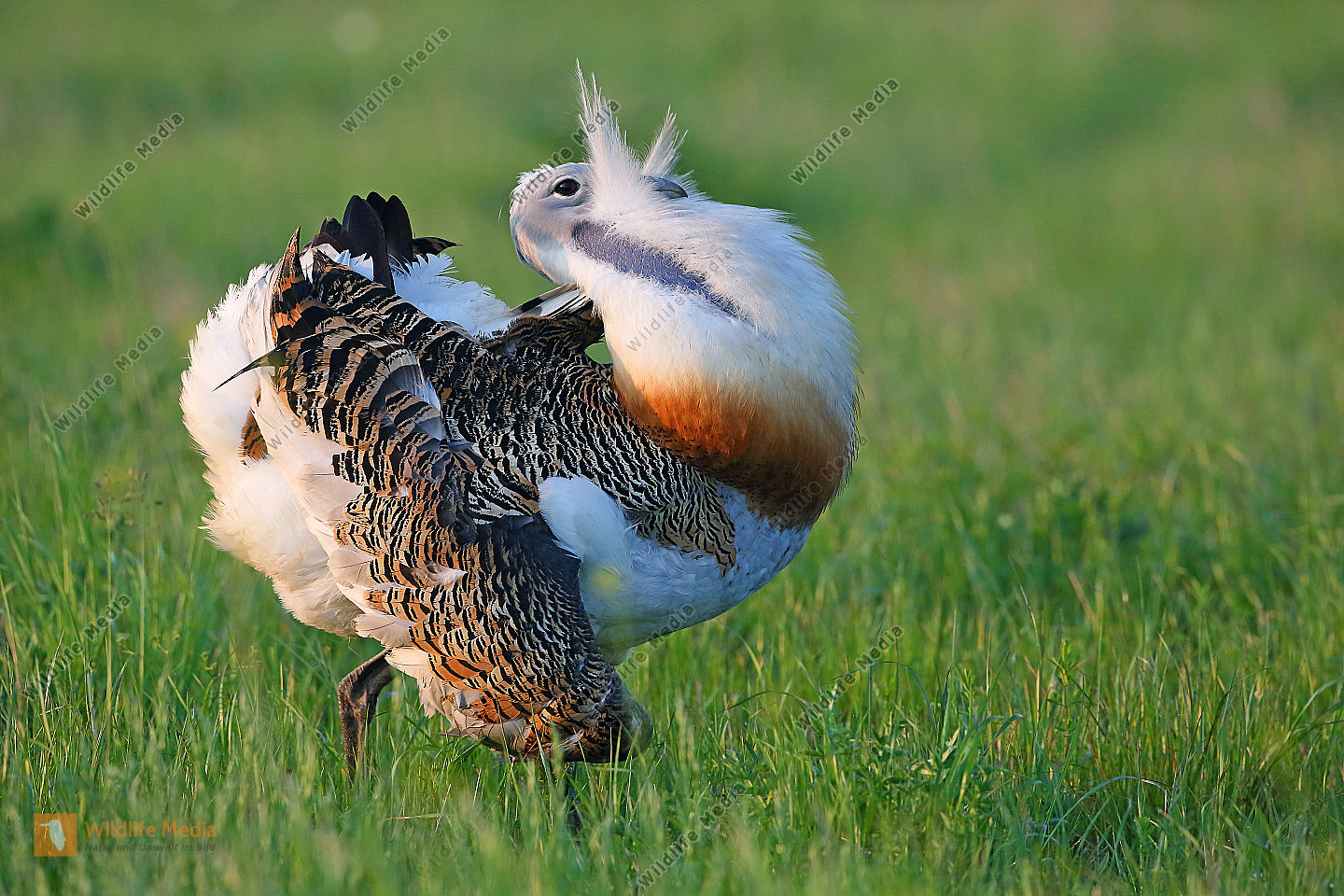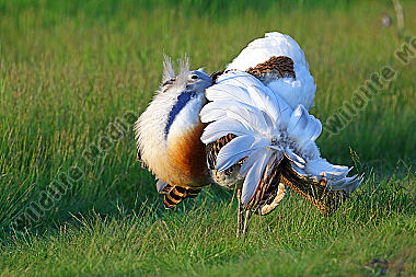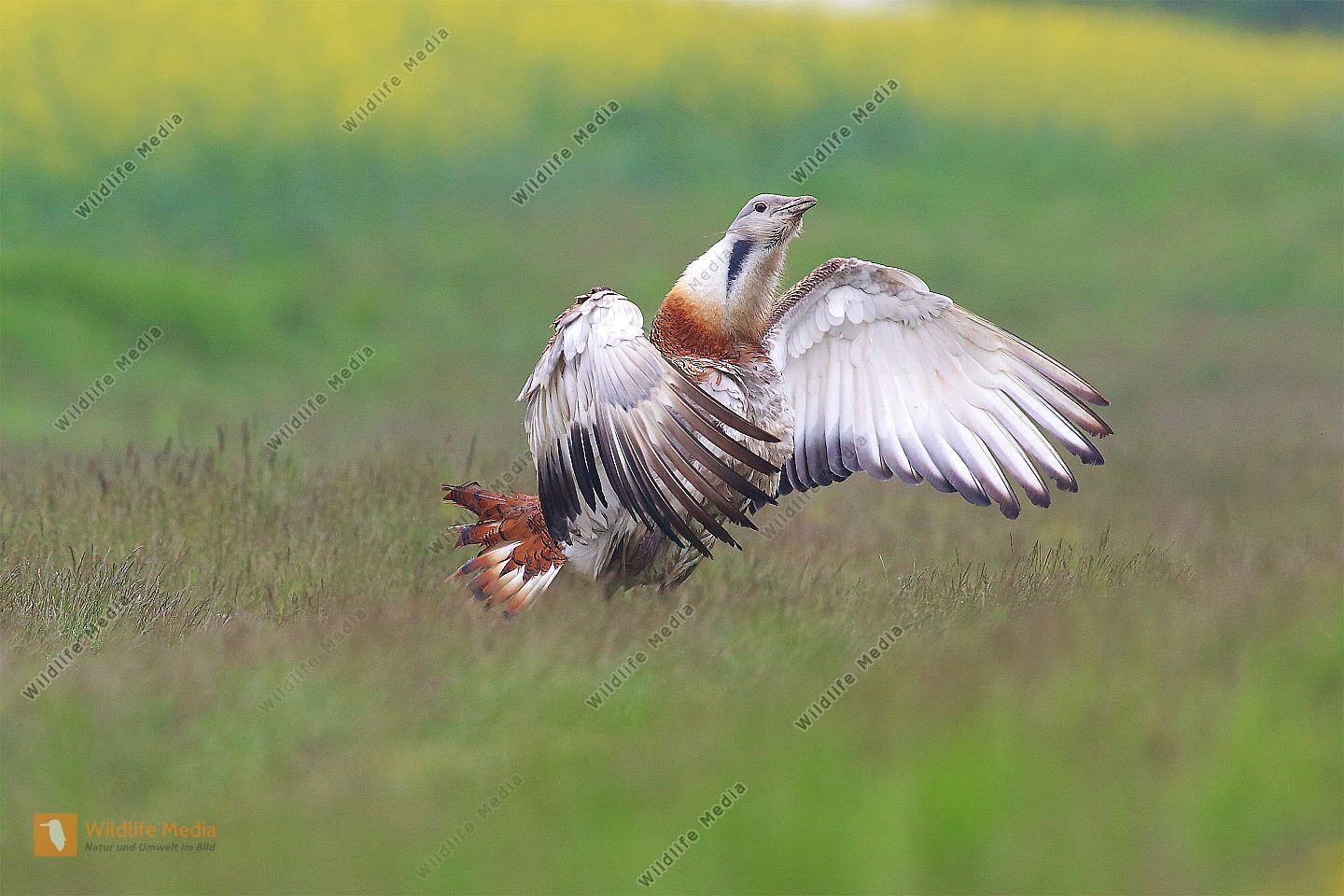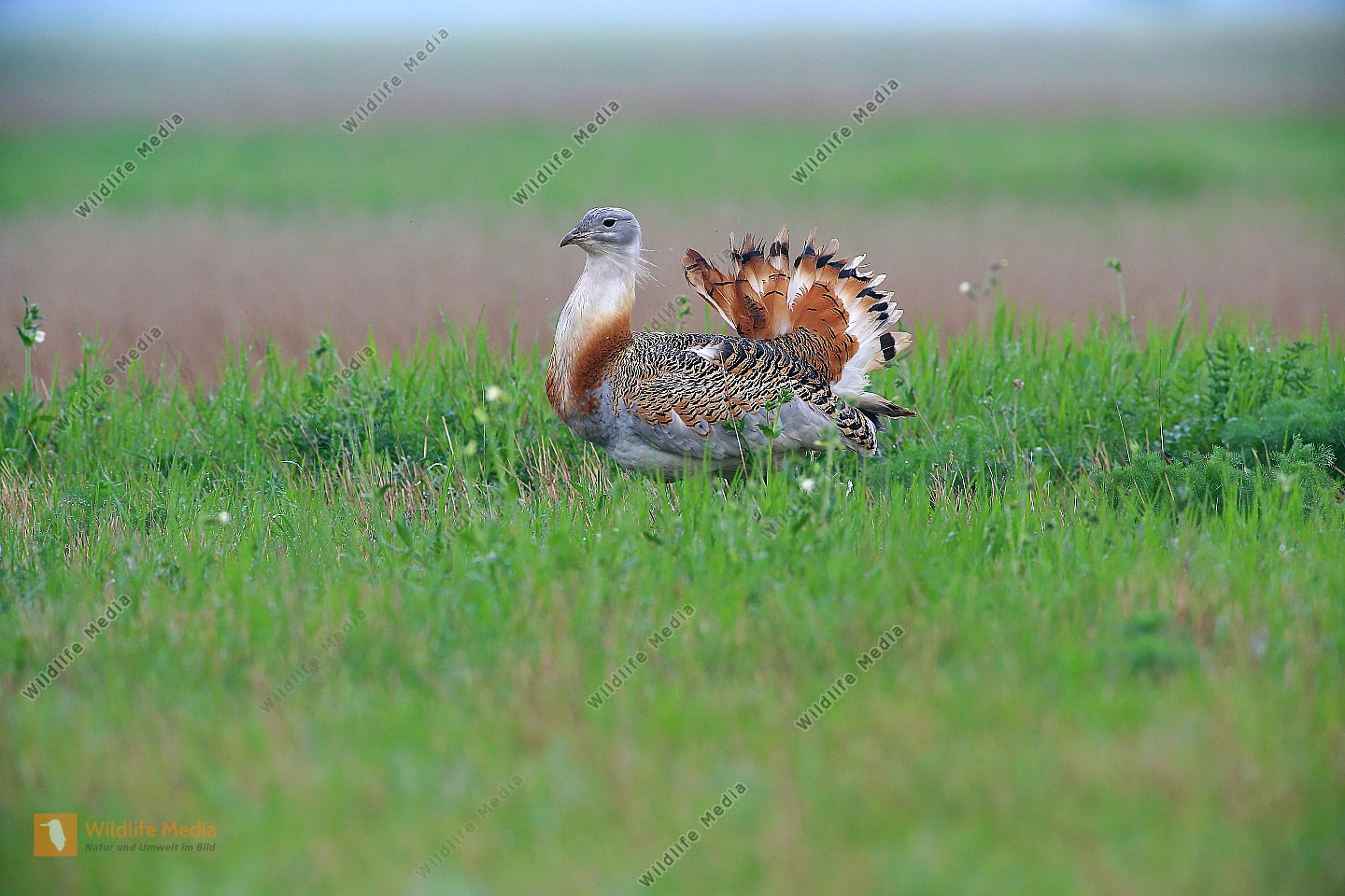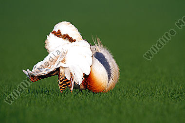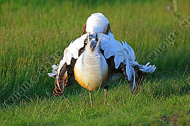 Großtrappe balzender Hahn mit Henne im Hintergrund