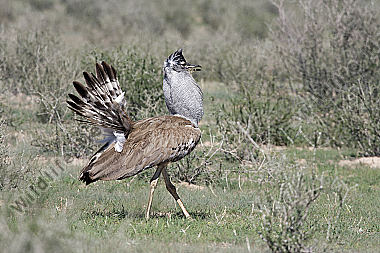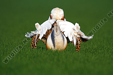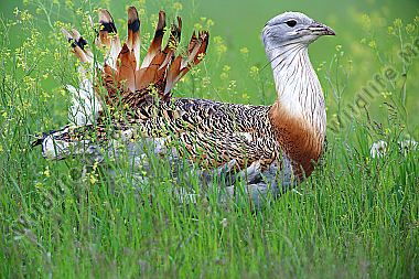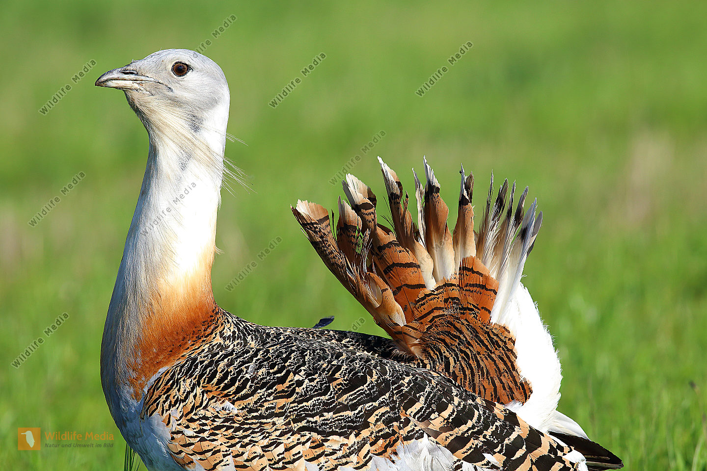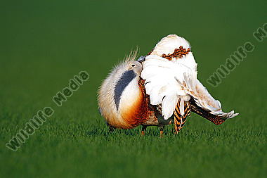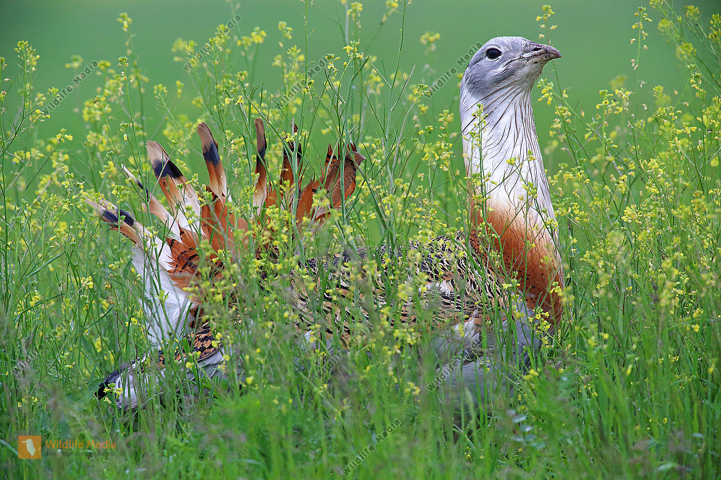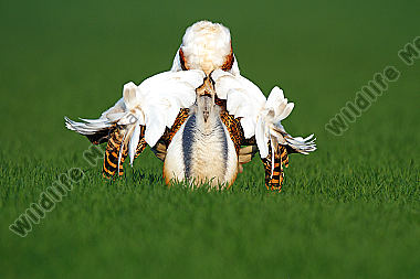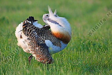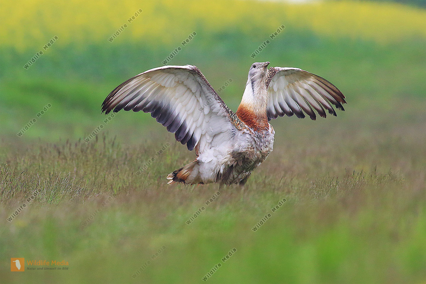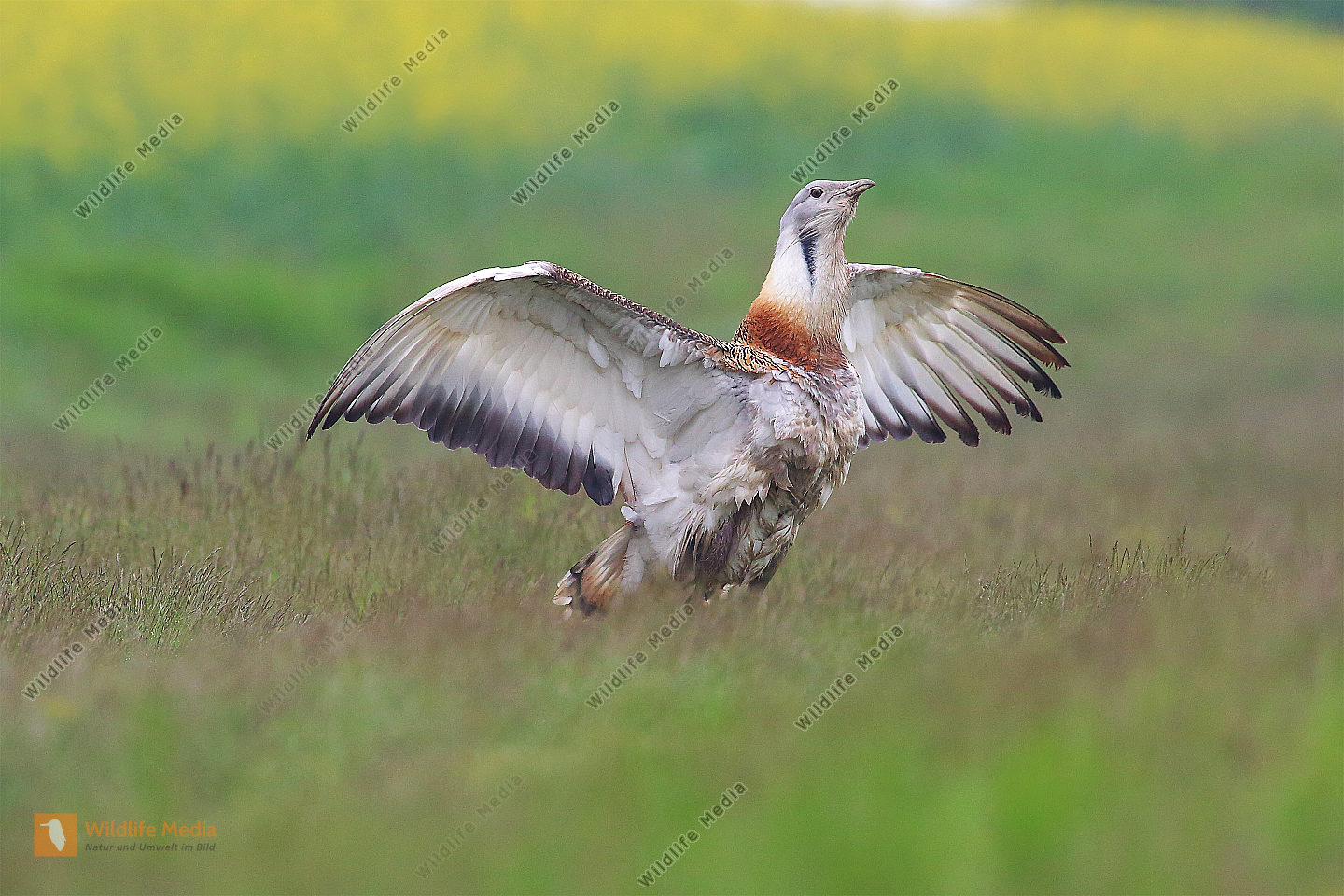 Großtrappe balzender Hahn mit Henne im Hintergrund