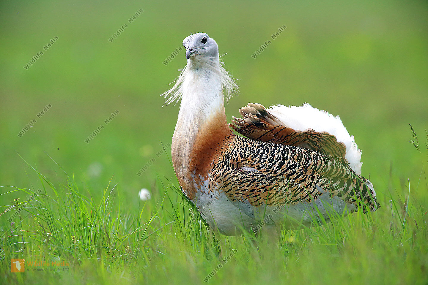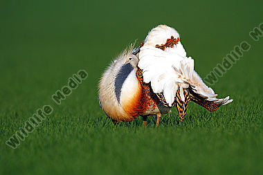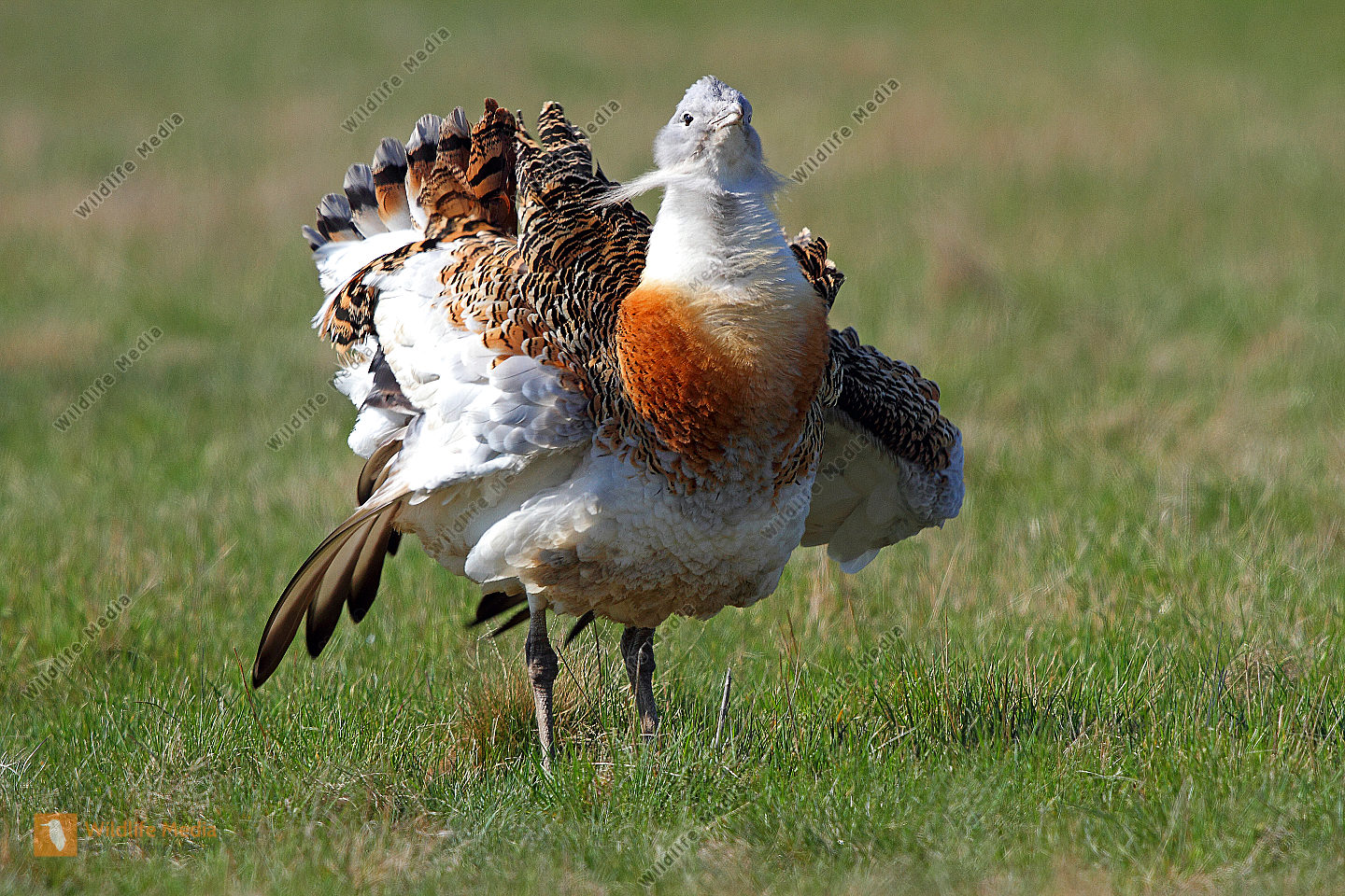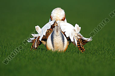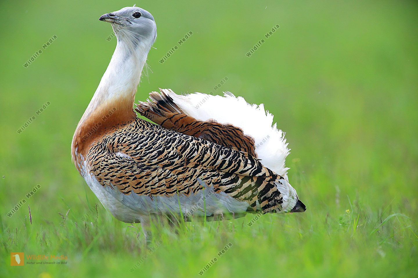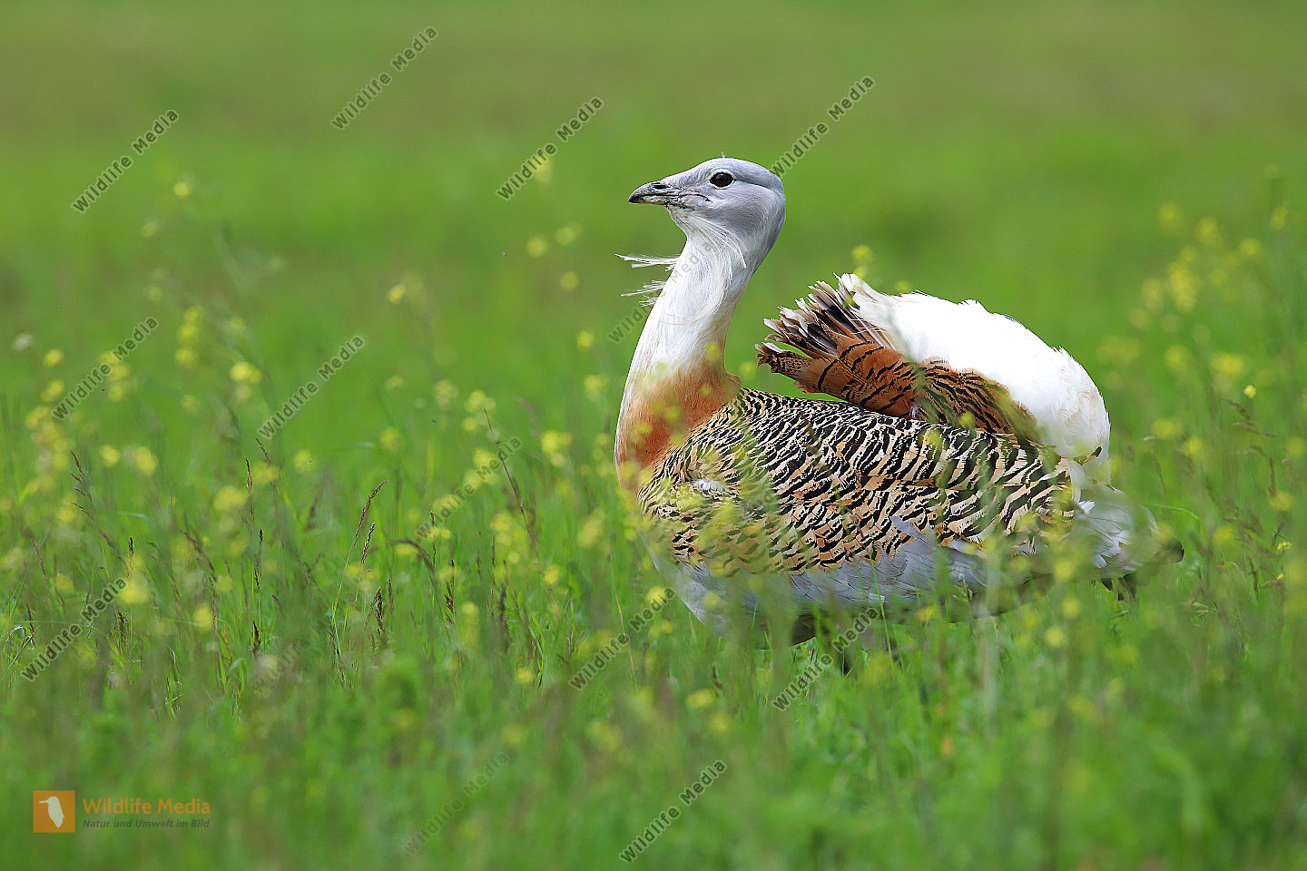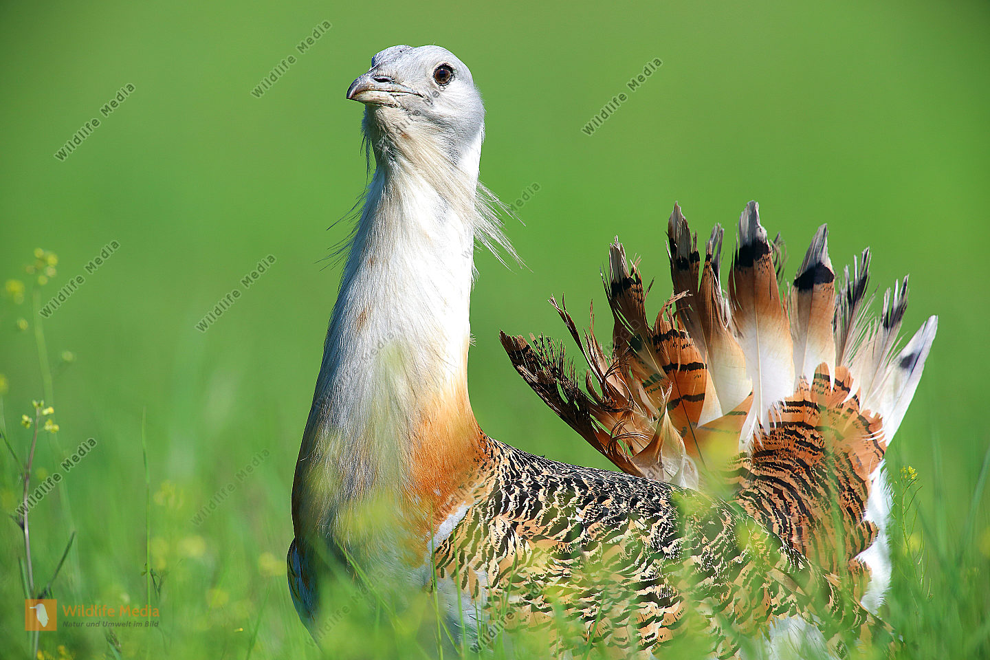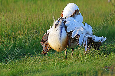 Großtrappe balzender Hahn mit Henne im Hintergrund