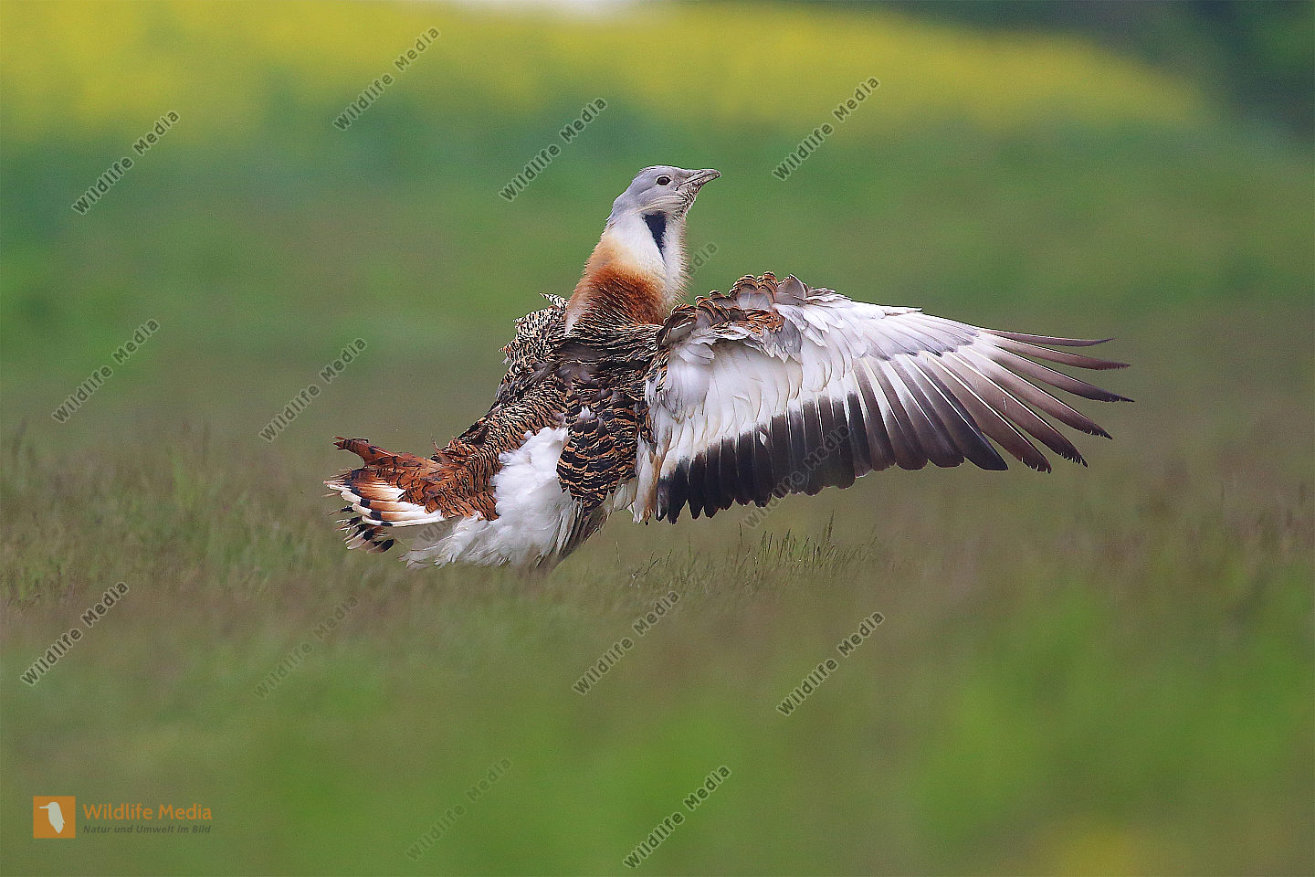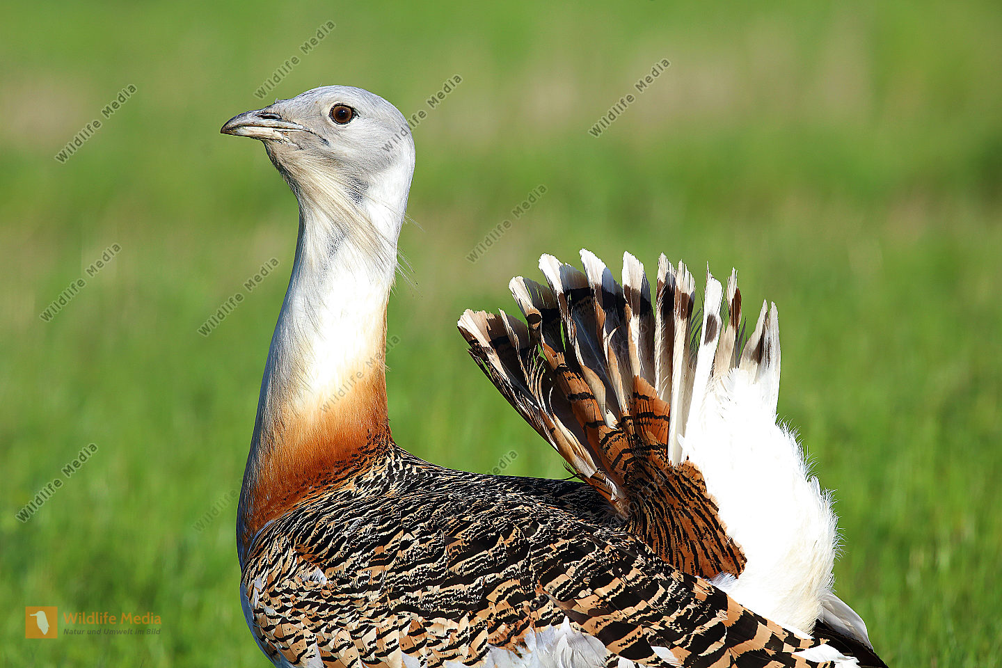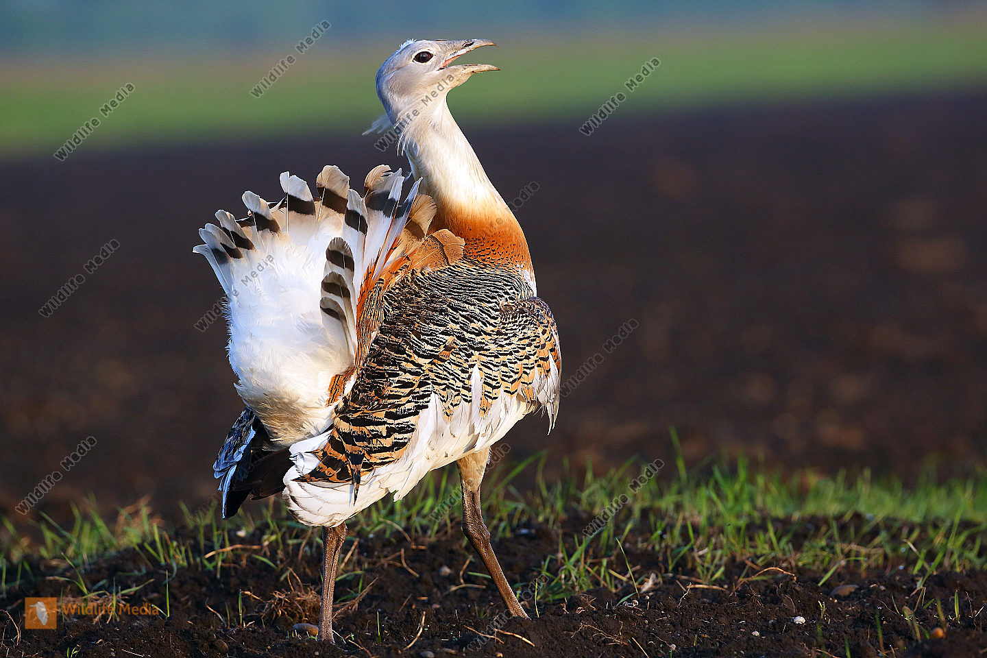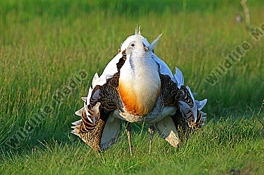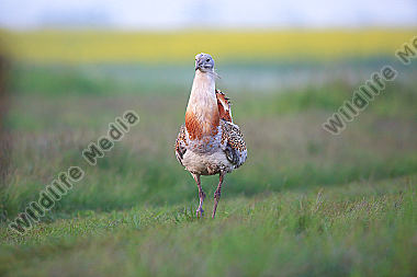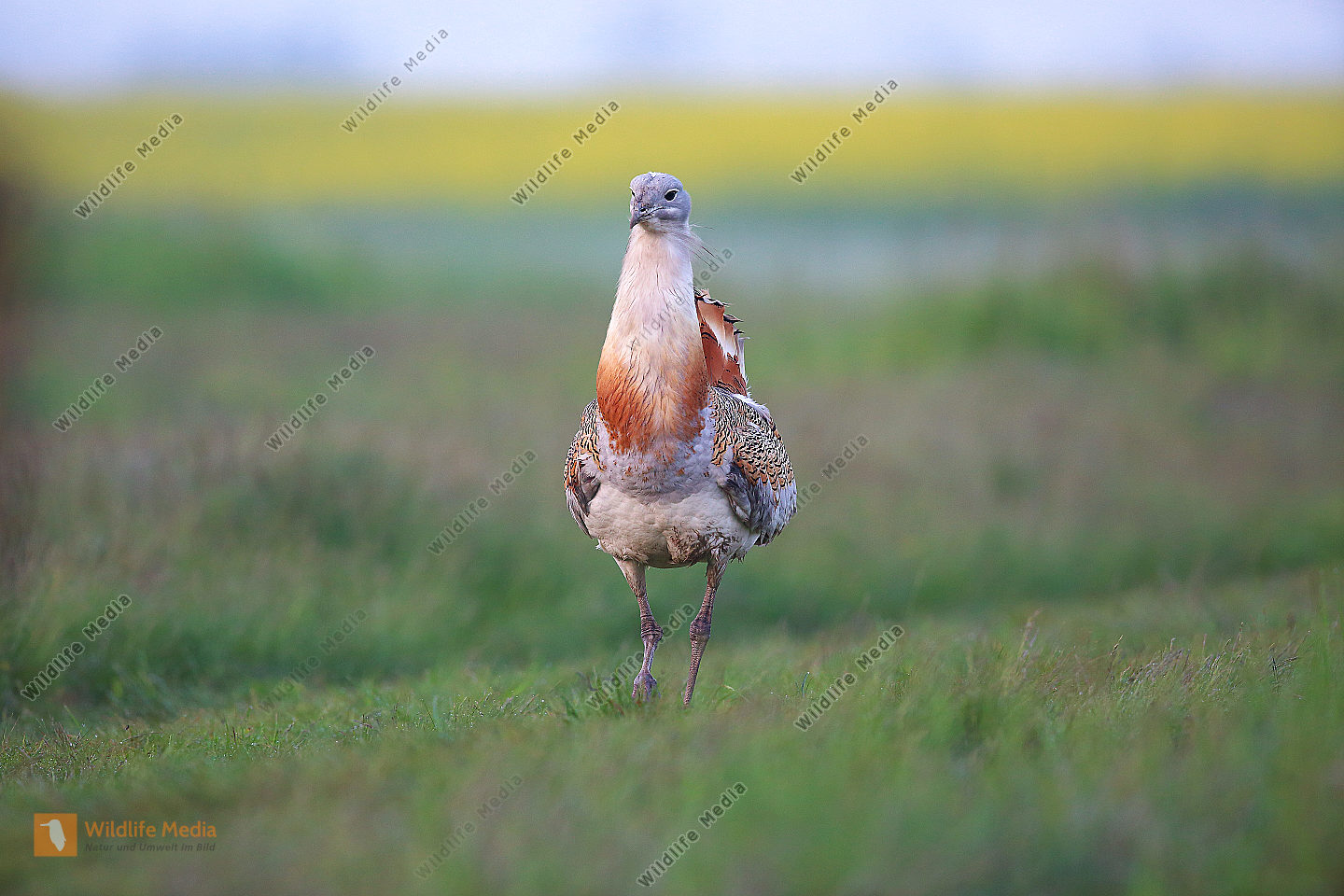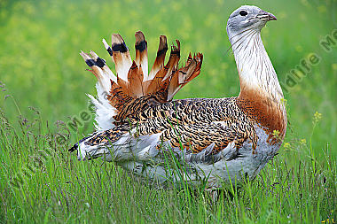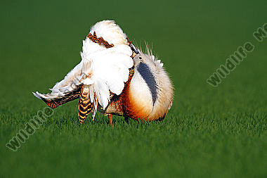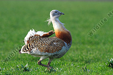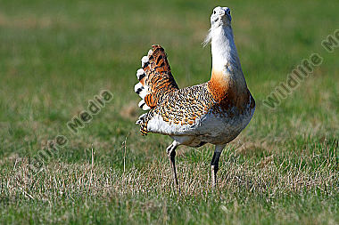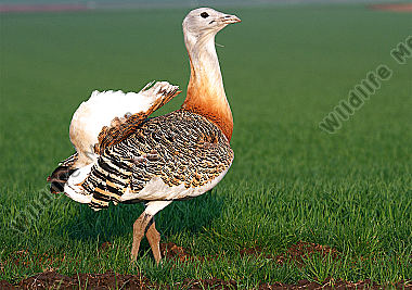 Großtrappe balzender Hahn mit Henne im Hintergrund