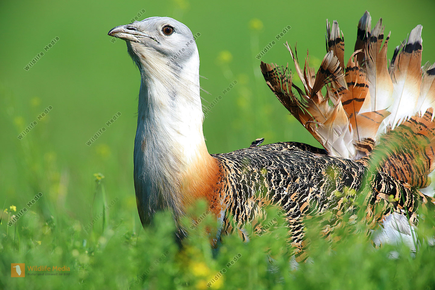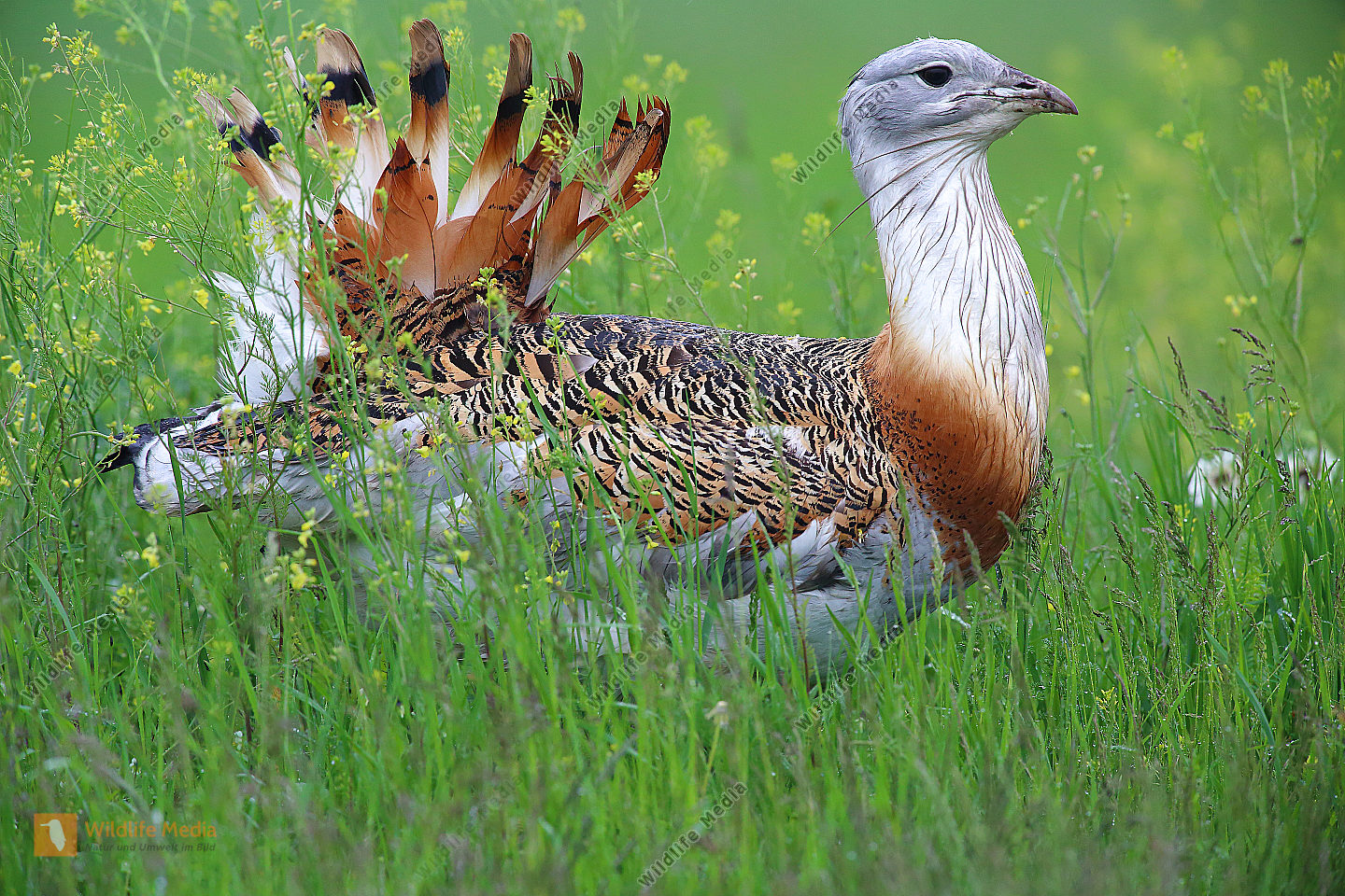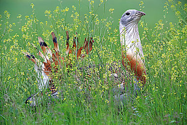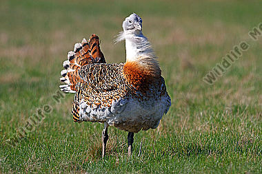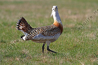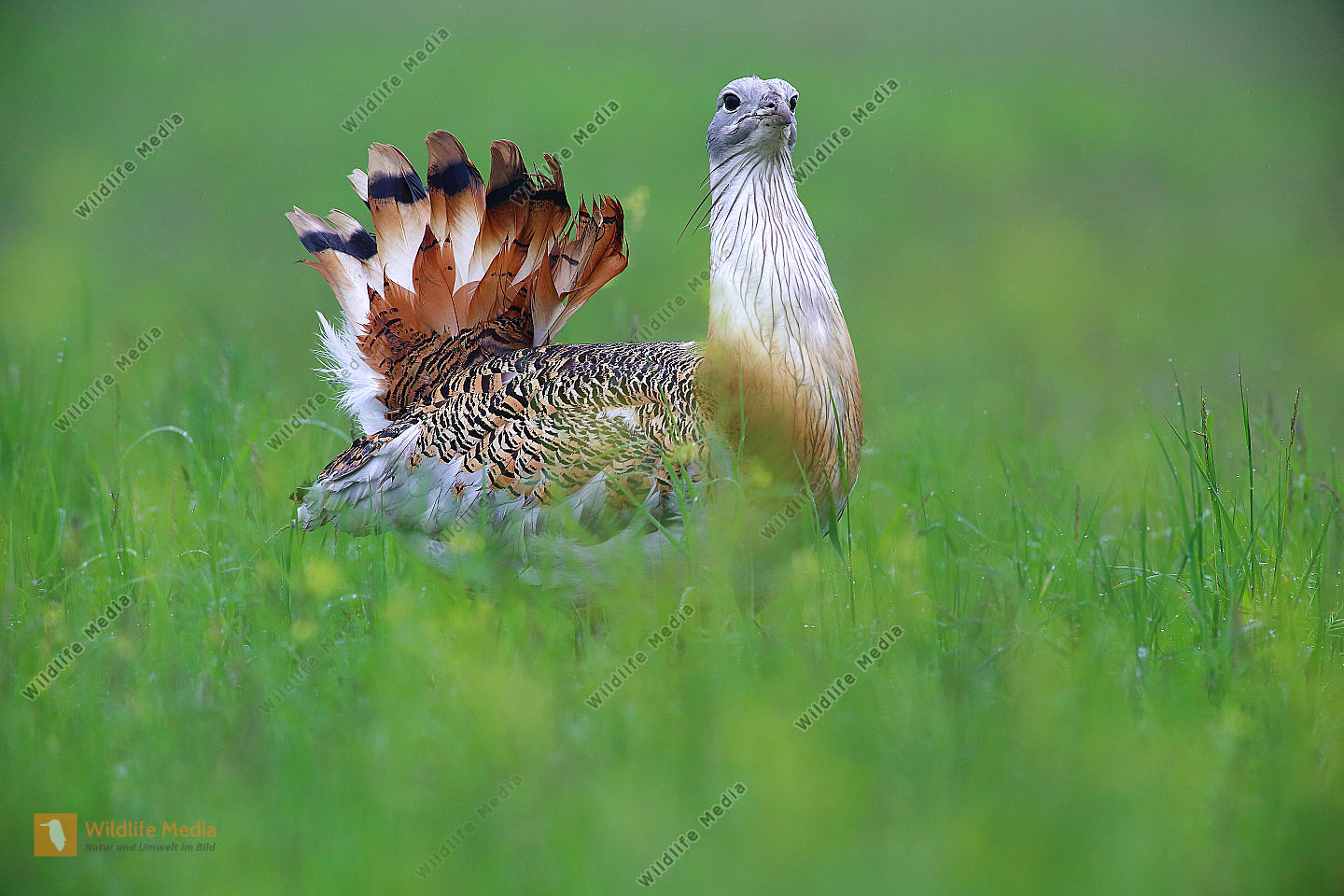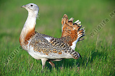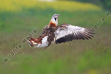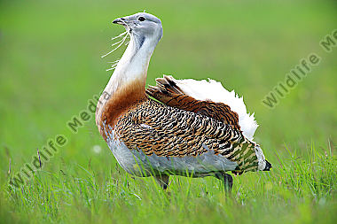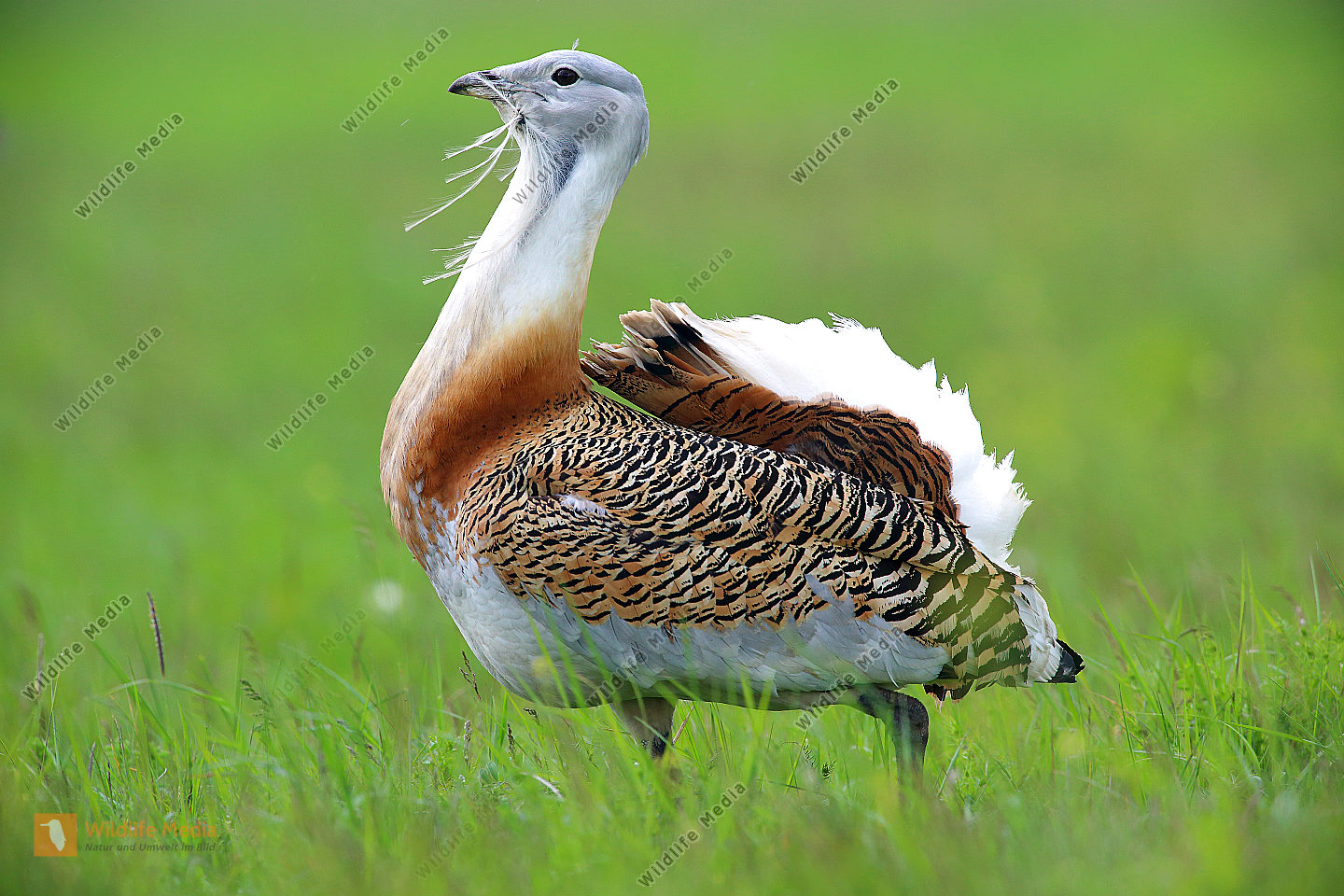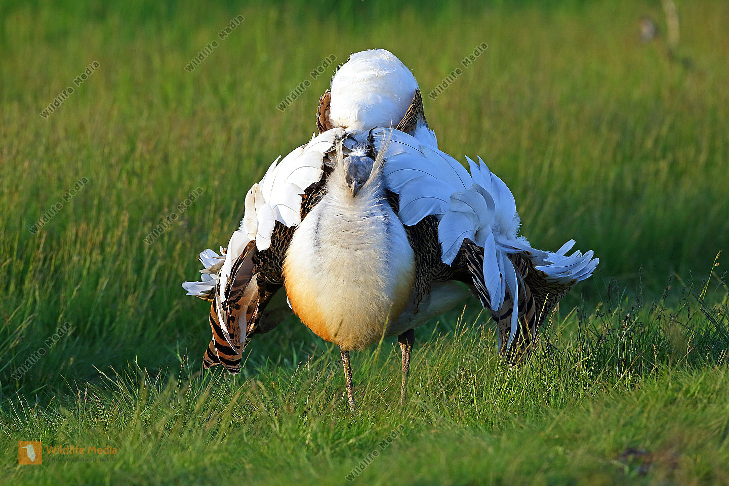 Großtrappe balzender Hahn mit Henne im Hintergrund