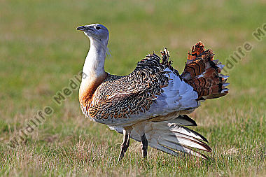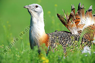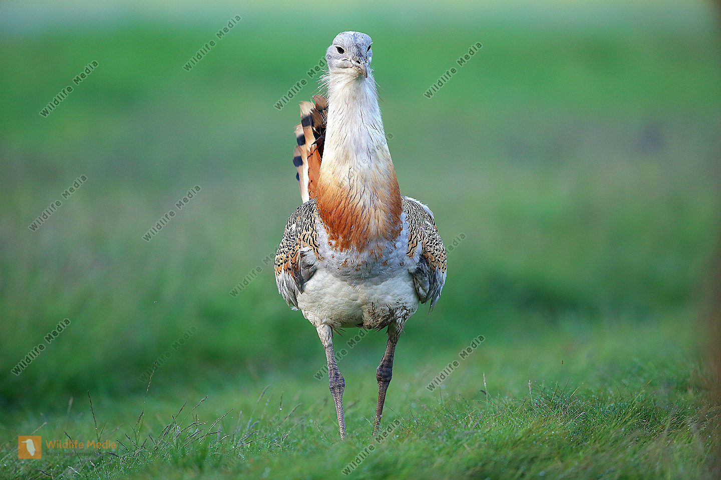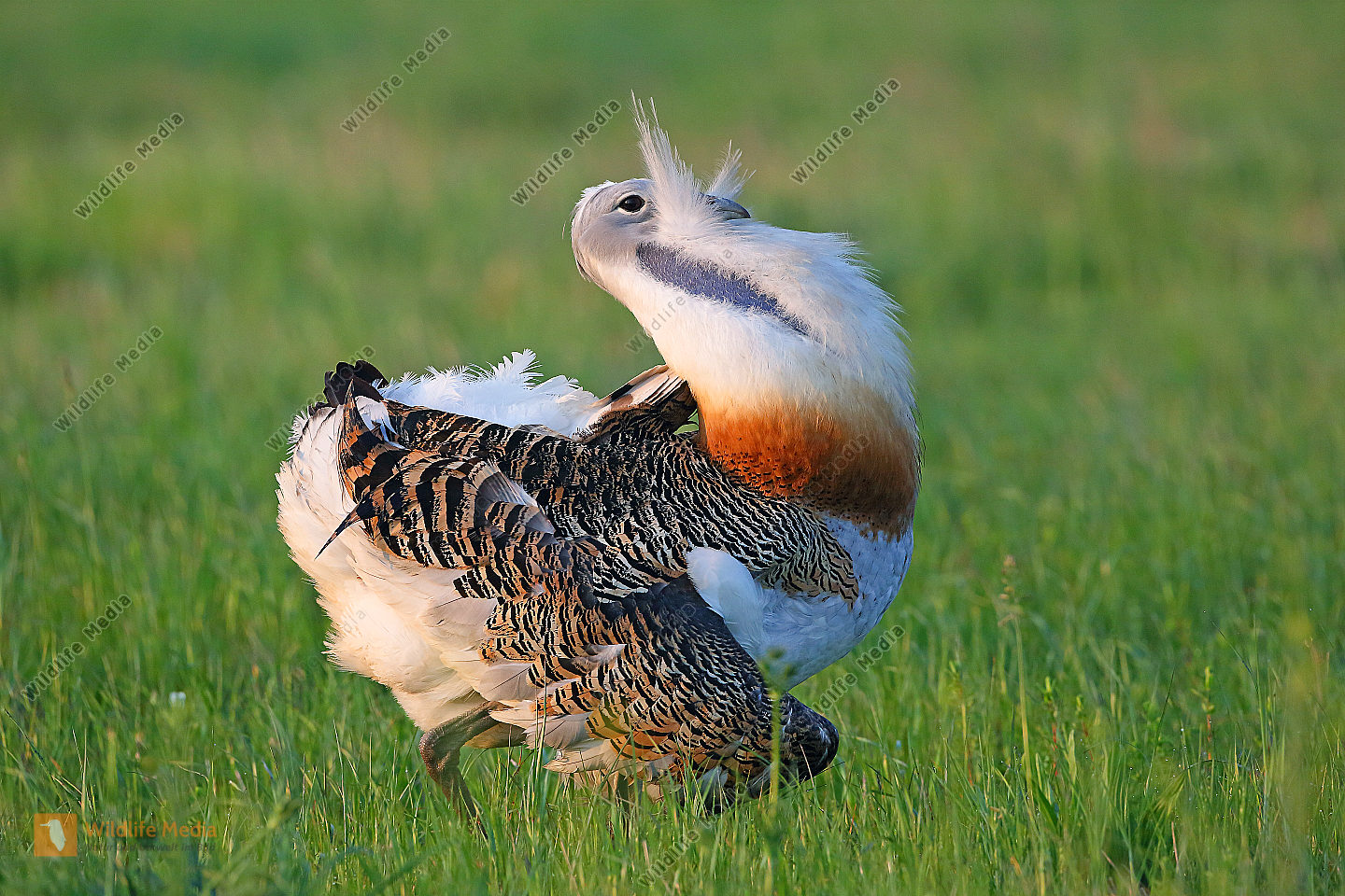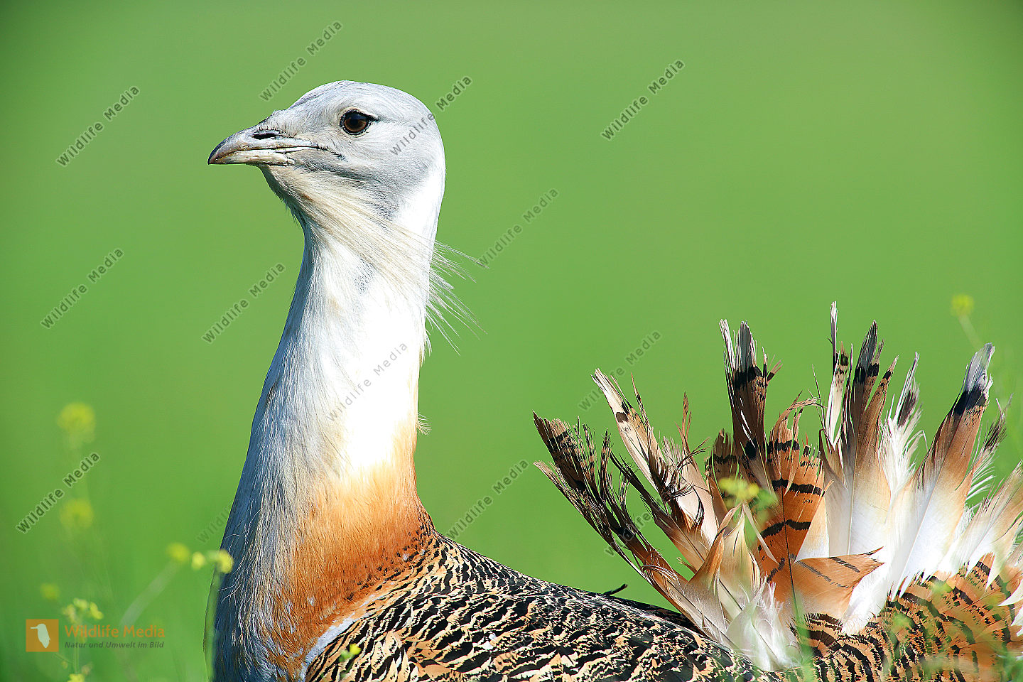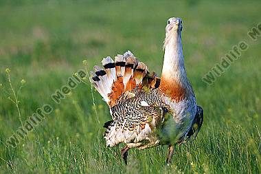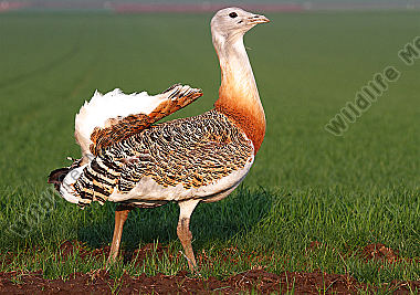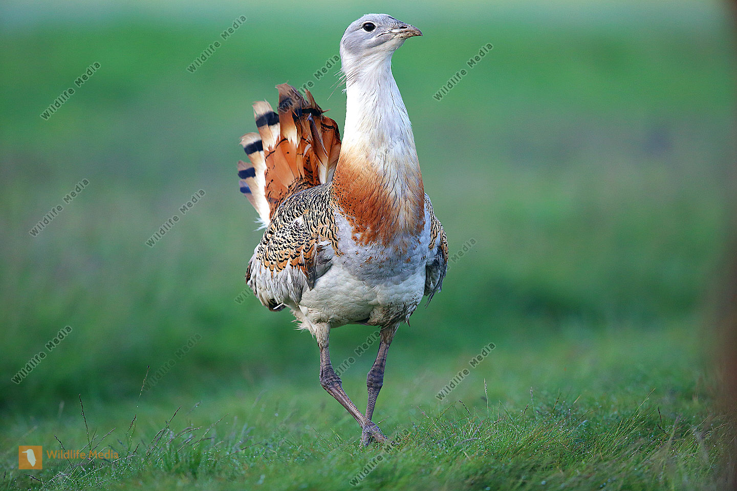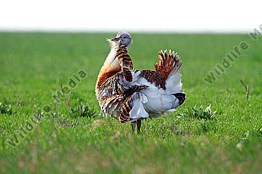 Großtrappe balzender Hahn mit Henne im Hintergrund