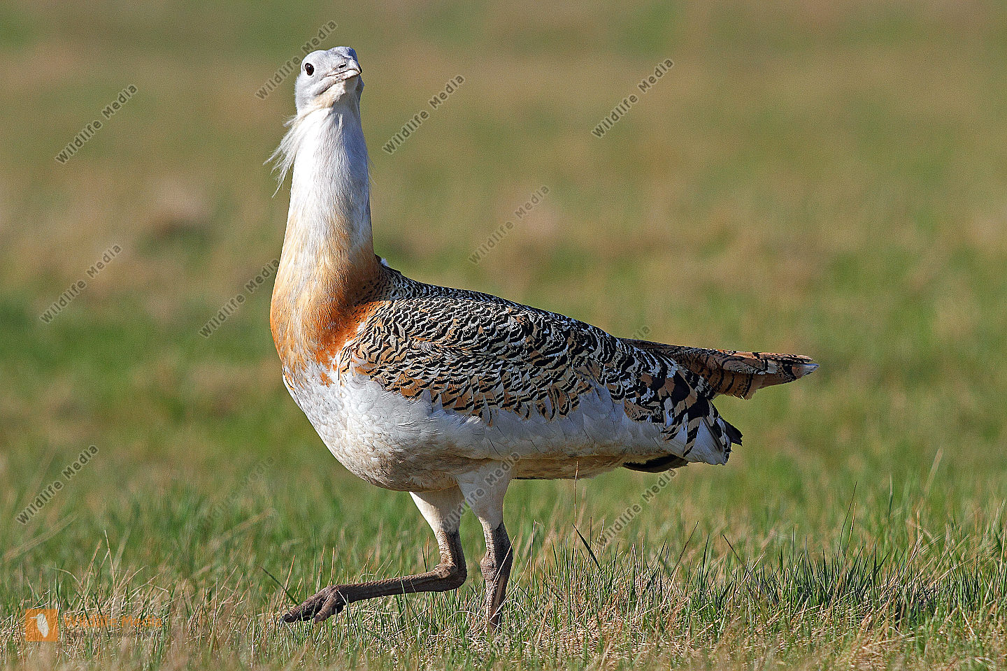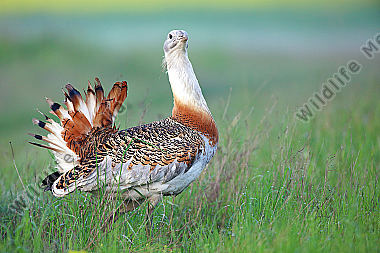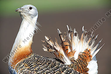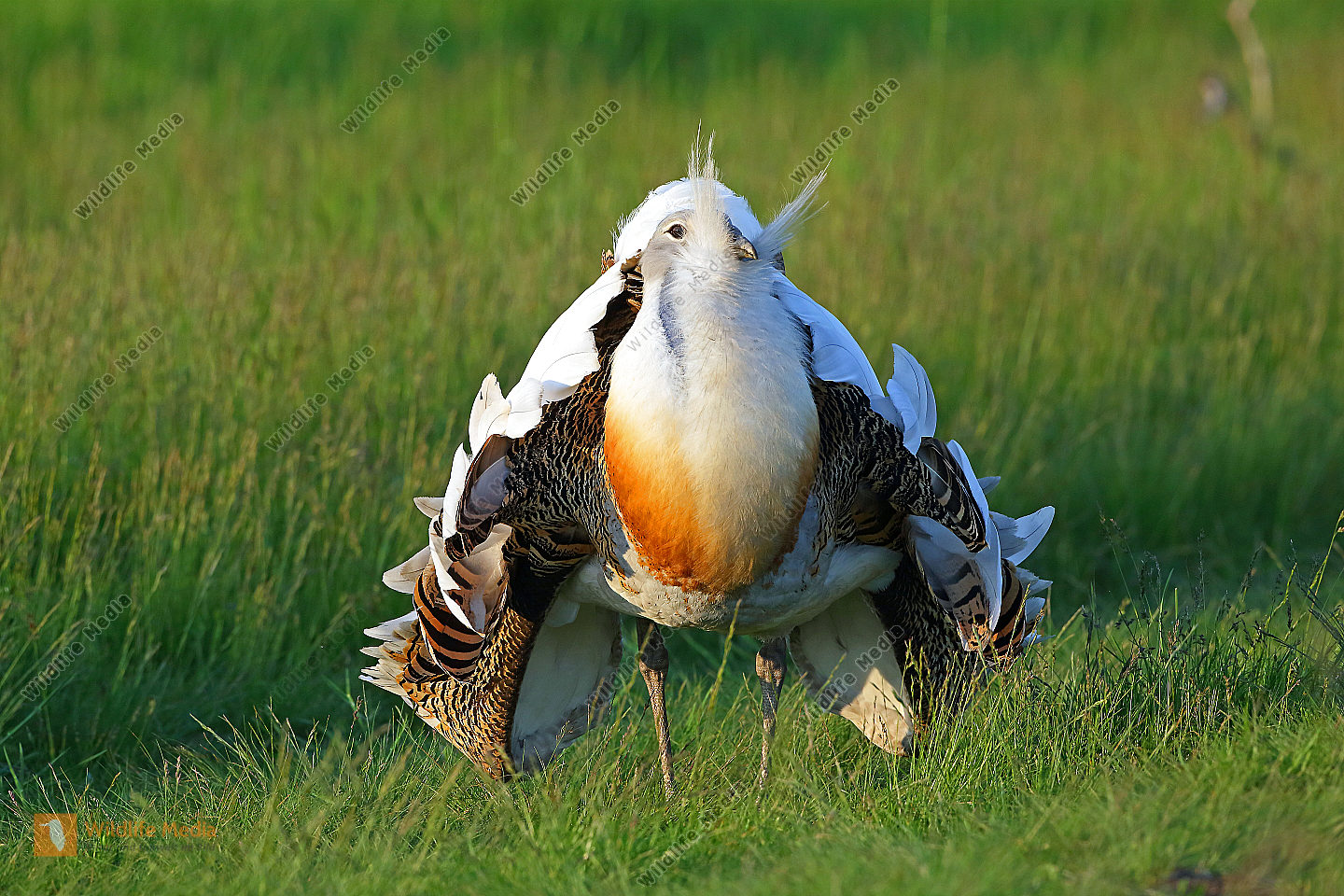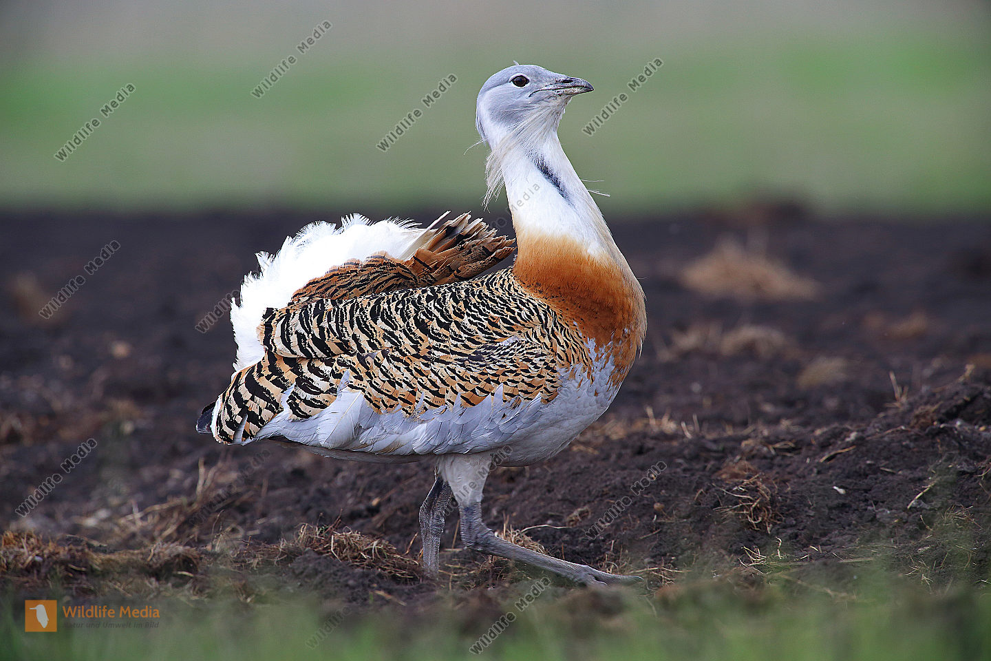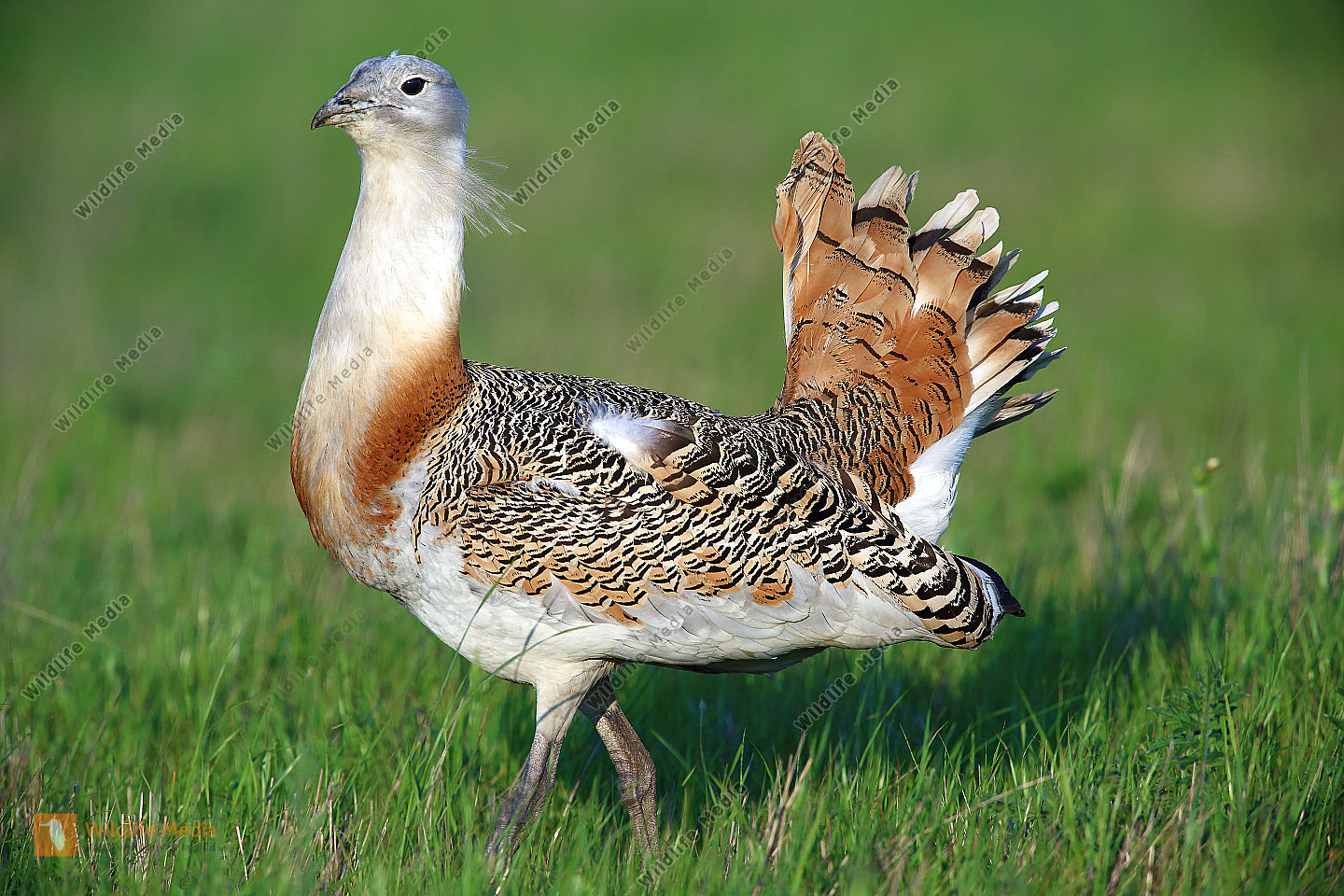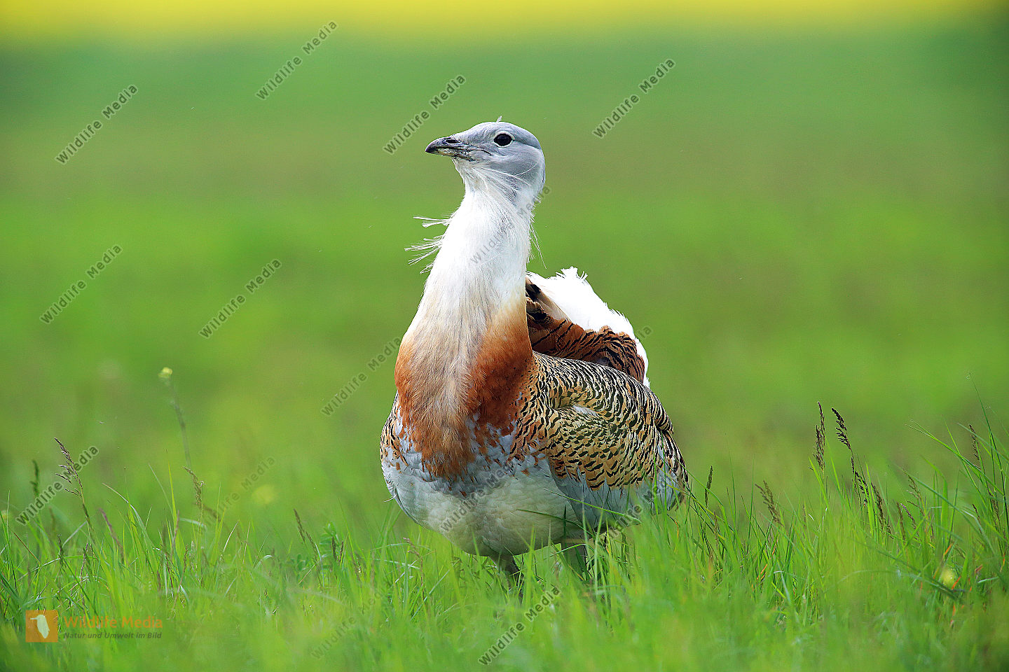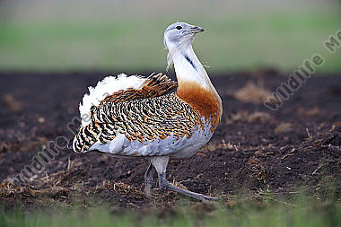Großtrappe balzender Hahn mit Henne im Hintergrund