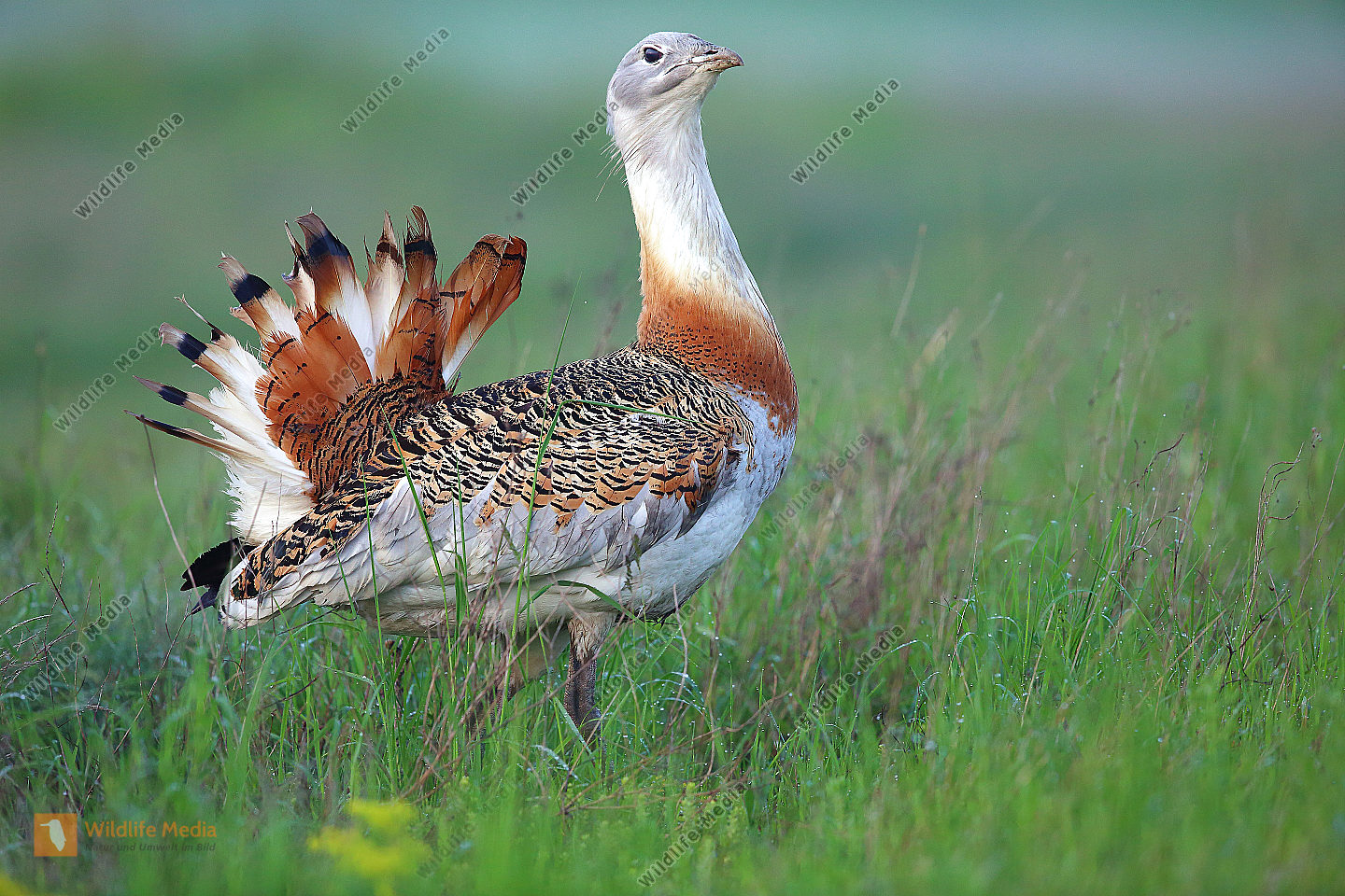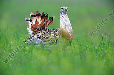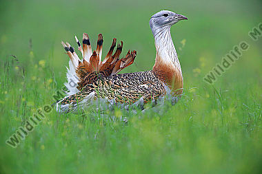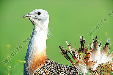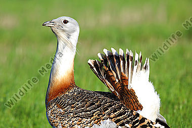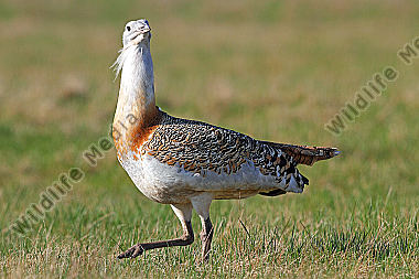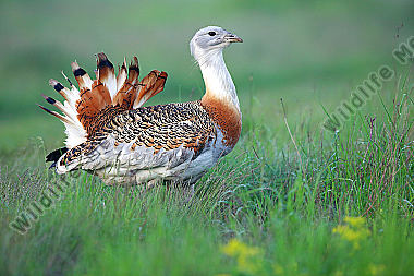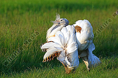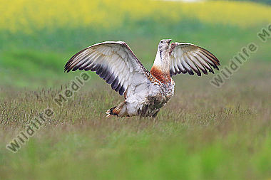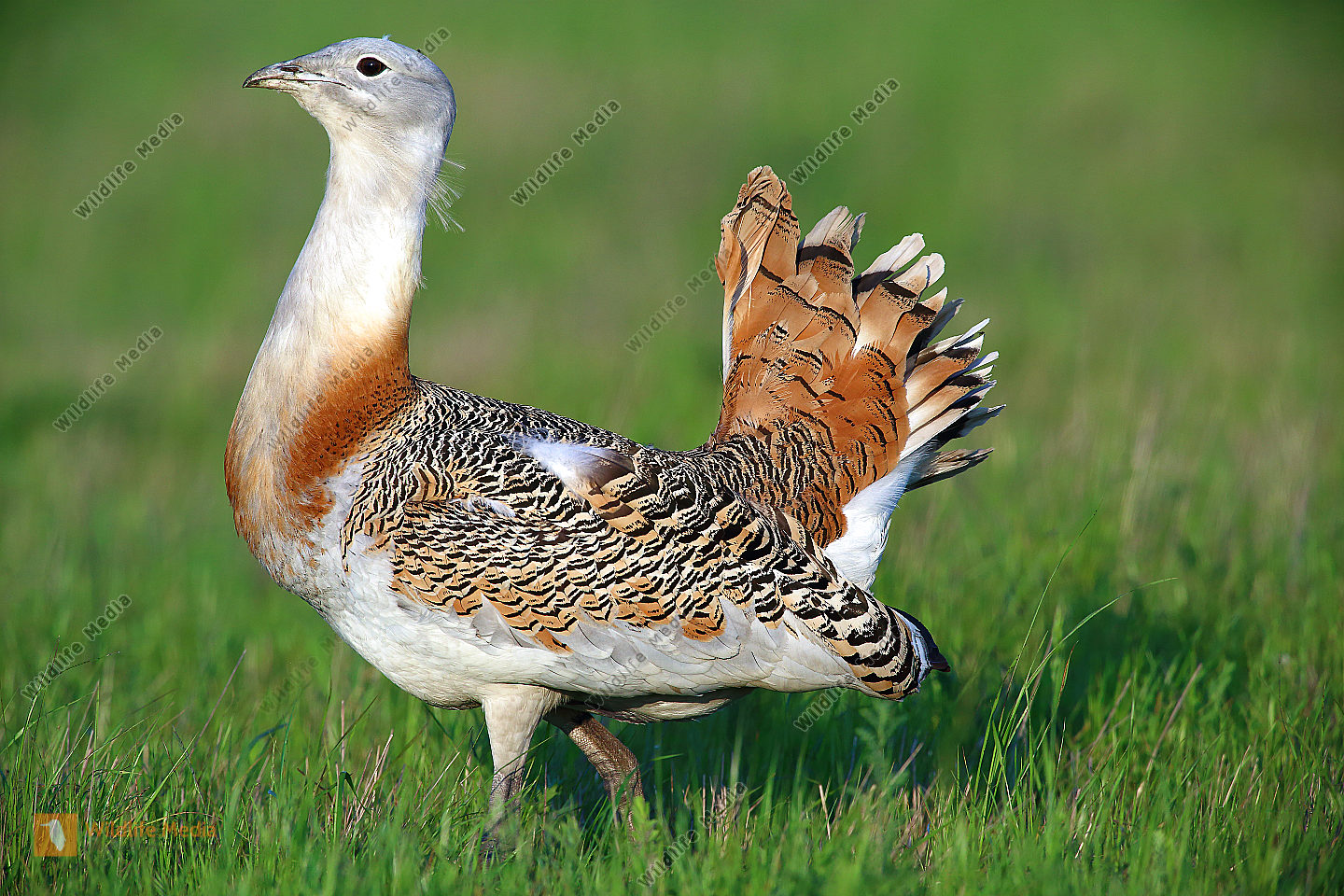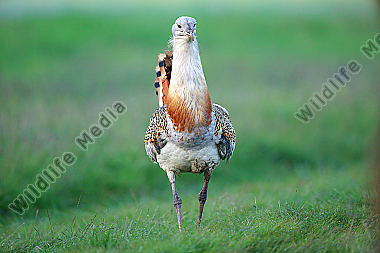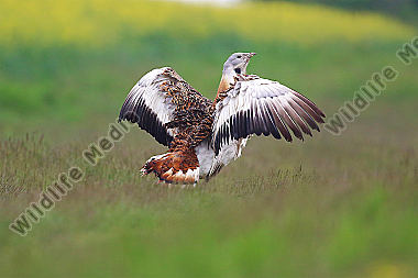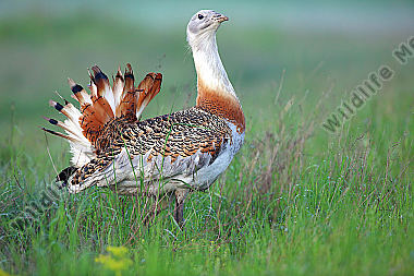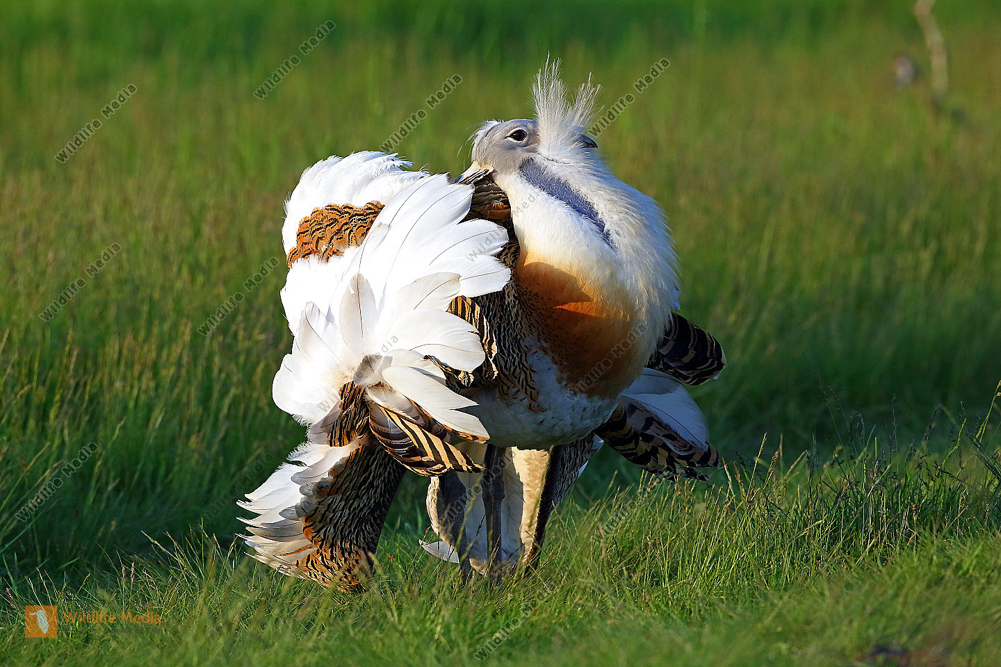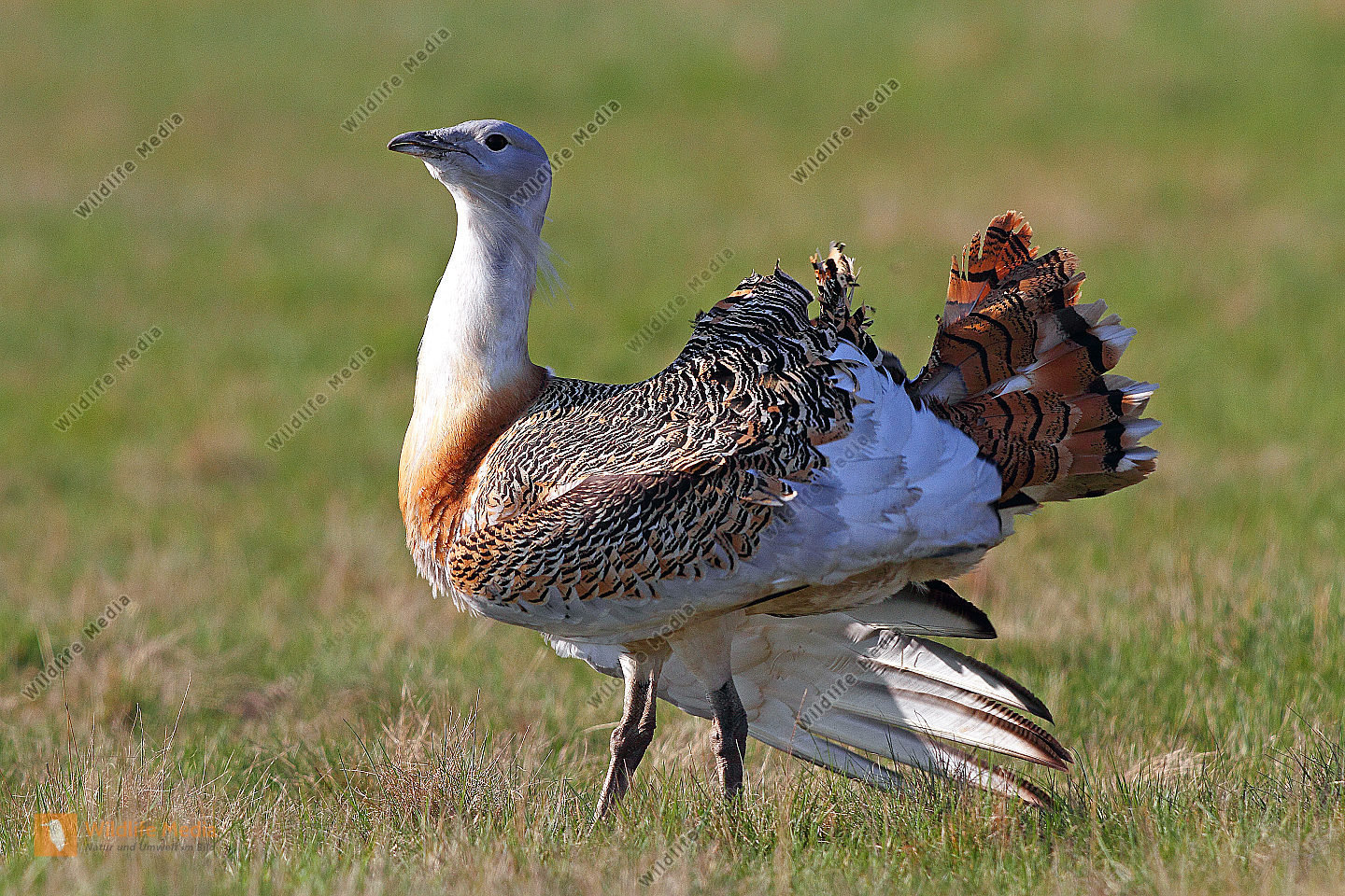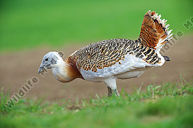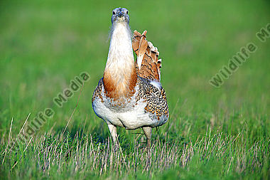 Großtrappe balzender Hahn mit Henne im Hintergrund