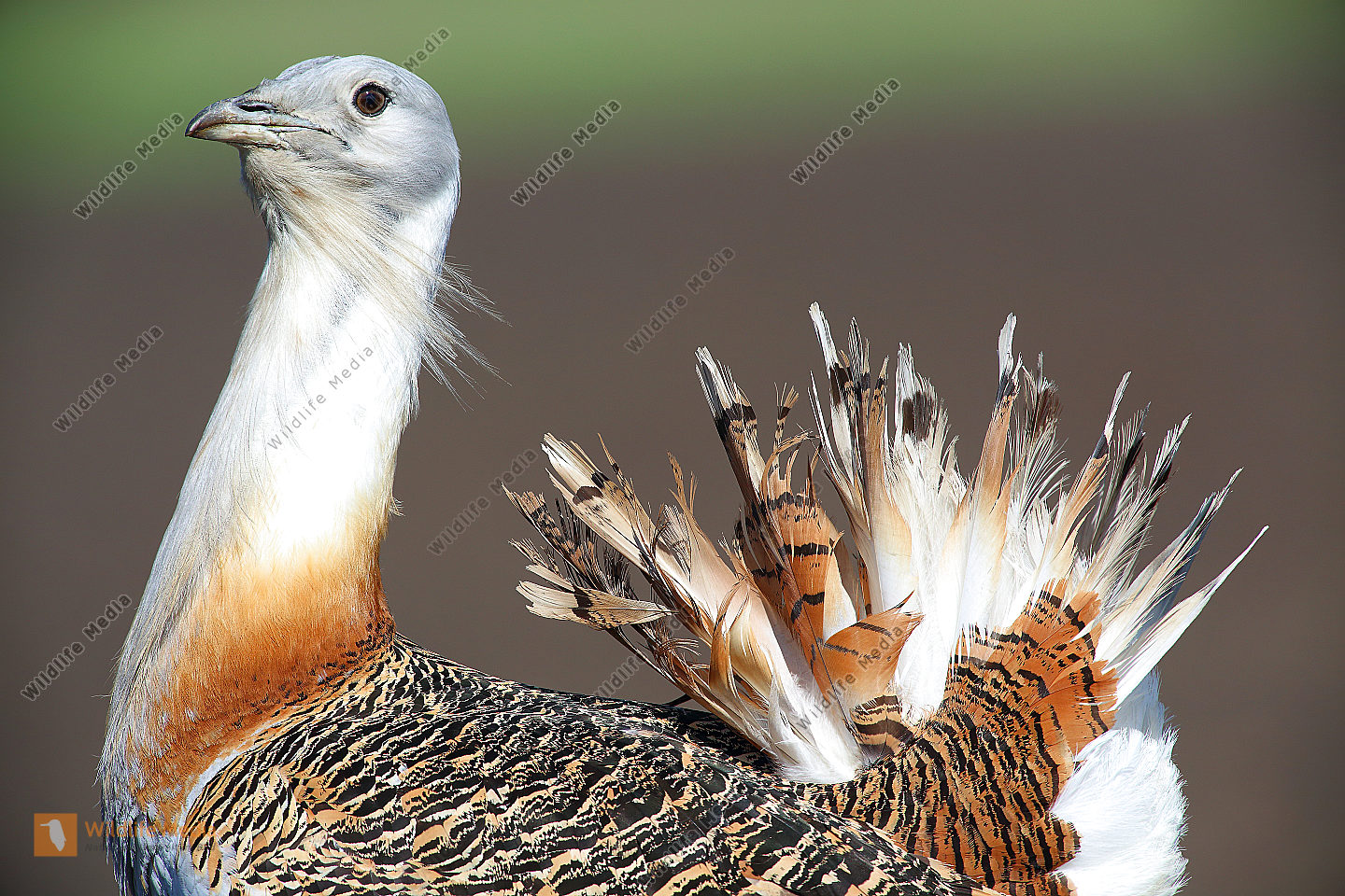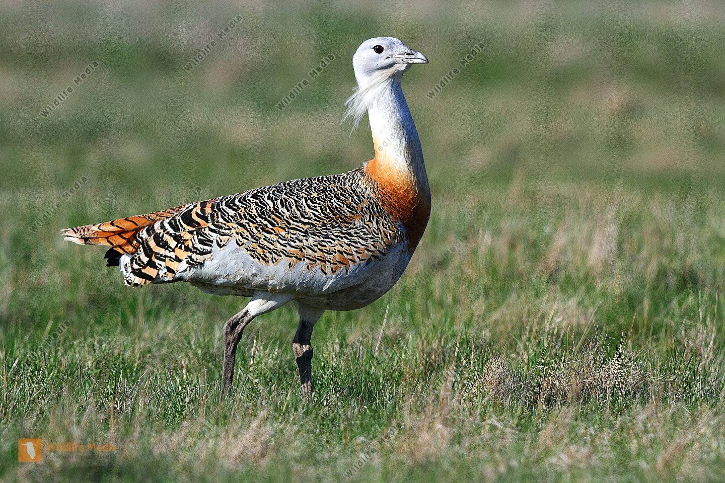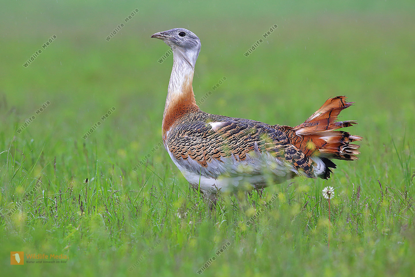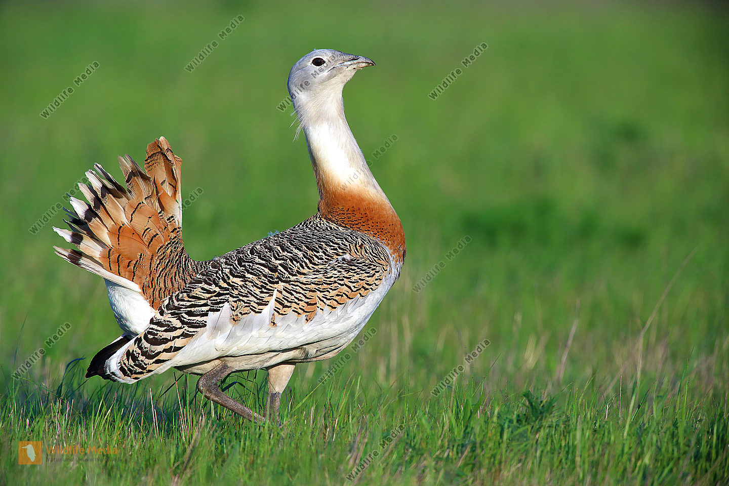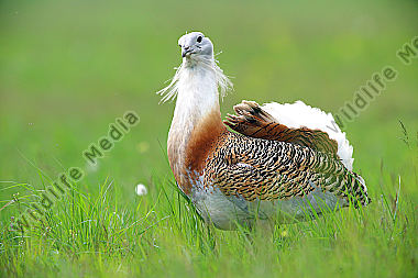 Großtrappe balzender Hahn mit Henne im Hintergrund
