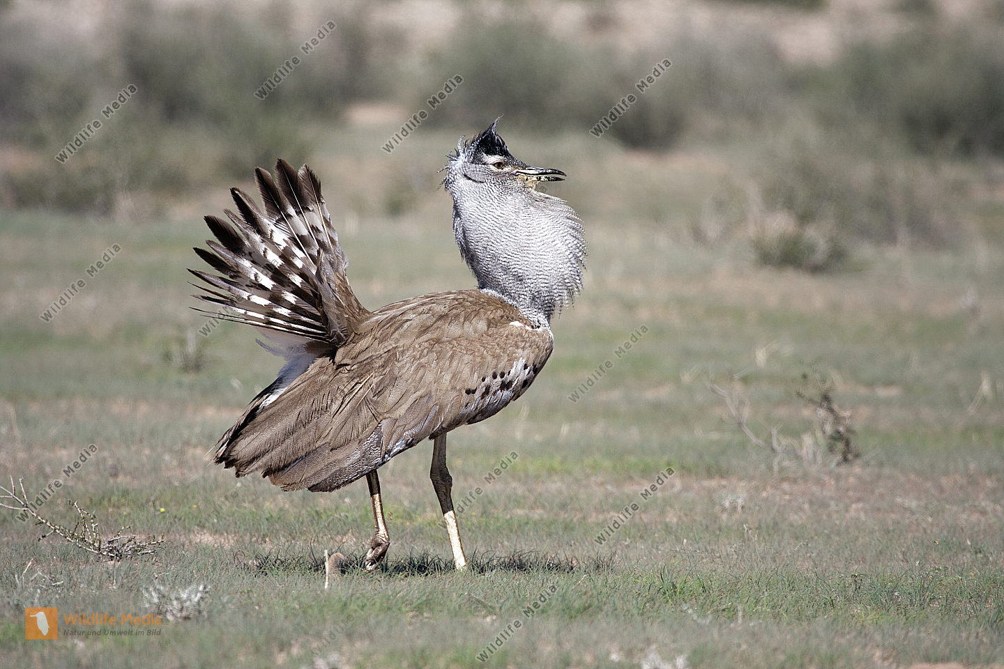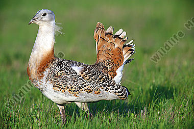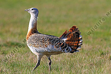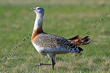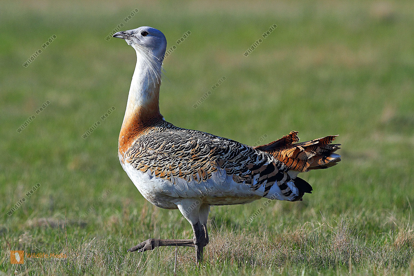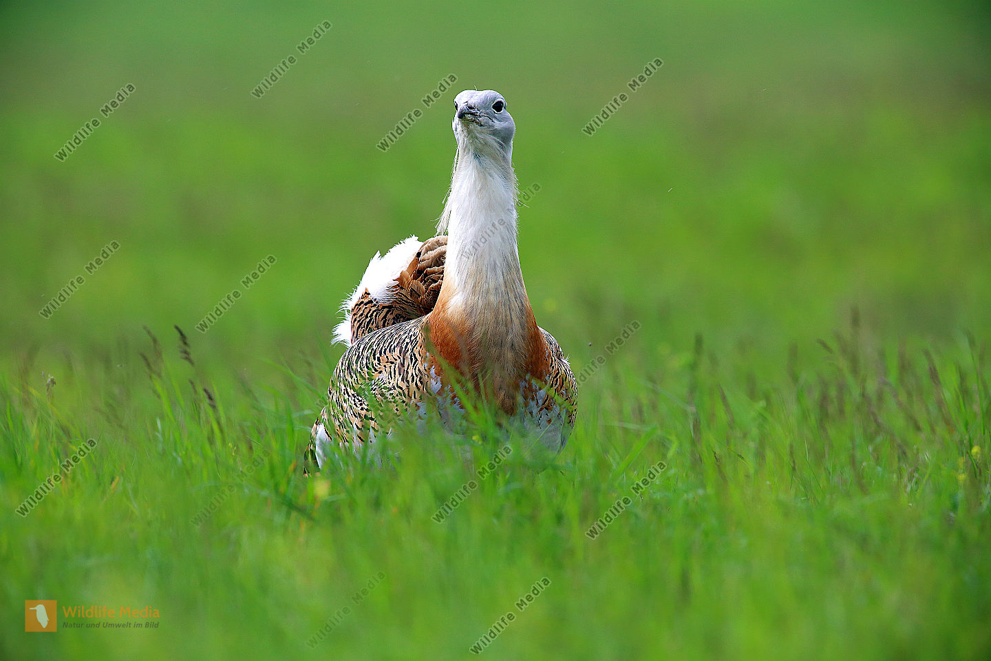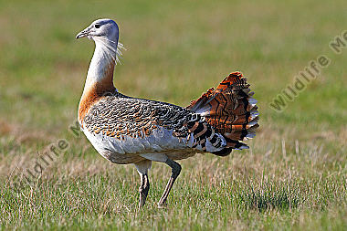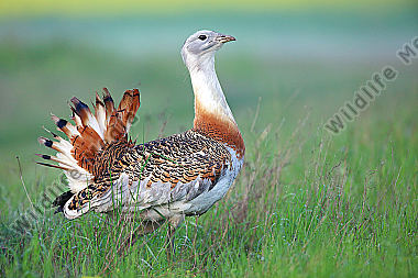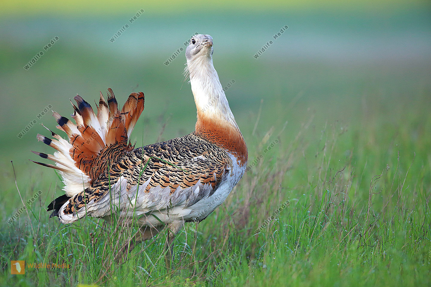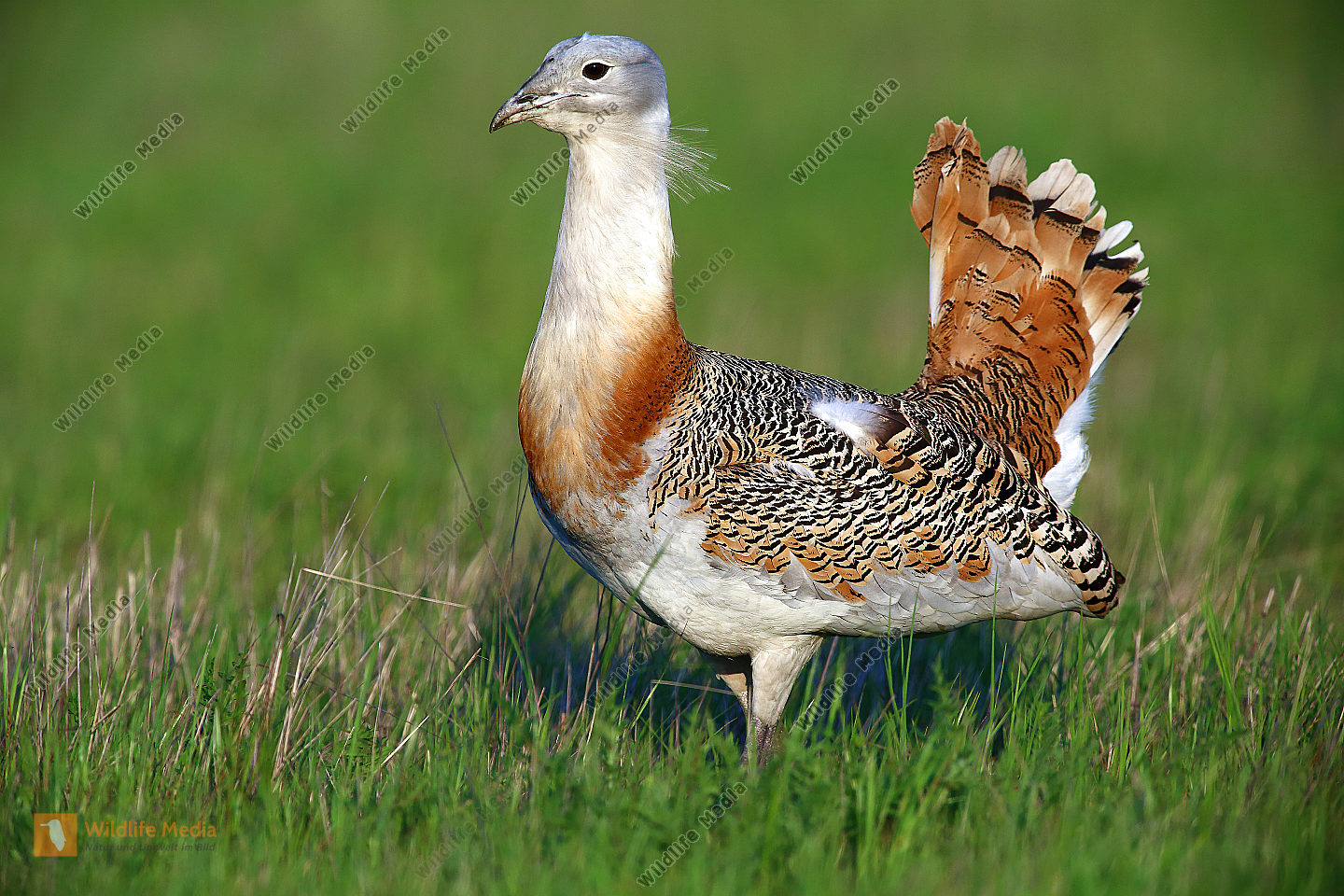 Großtrappe balzender Hahn mit Henne im Hintergrund