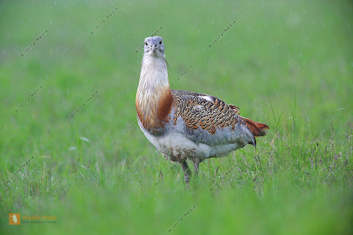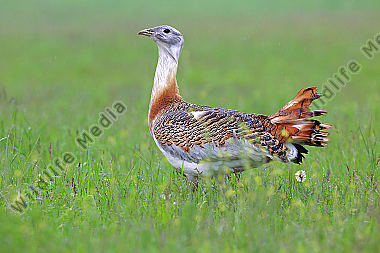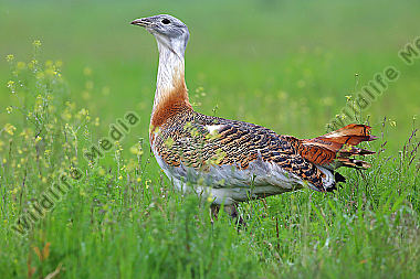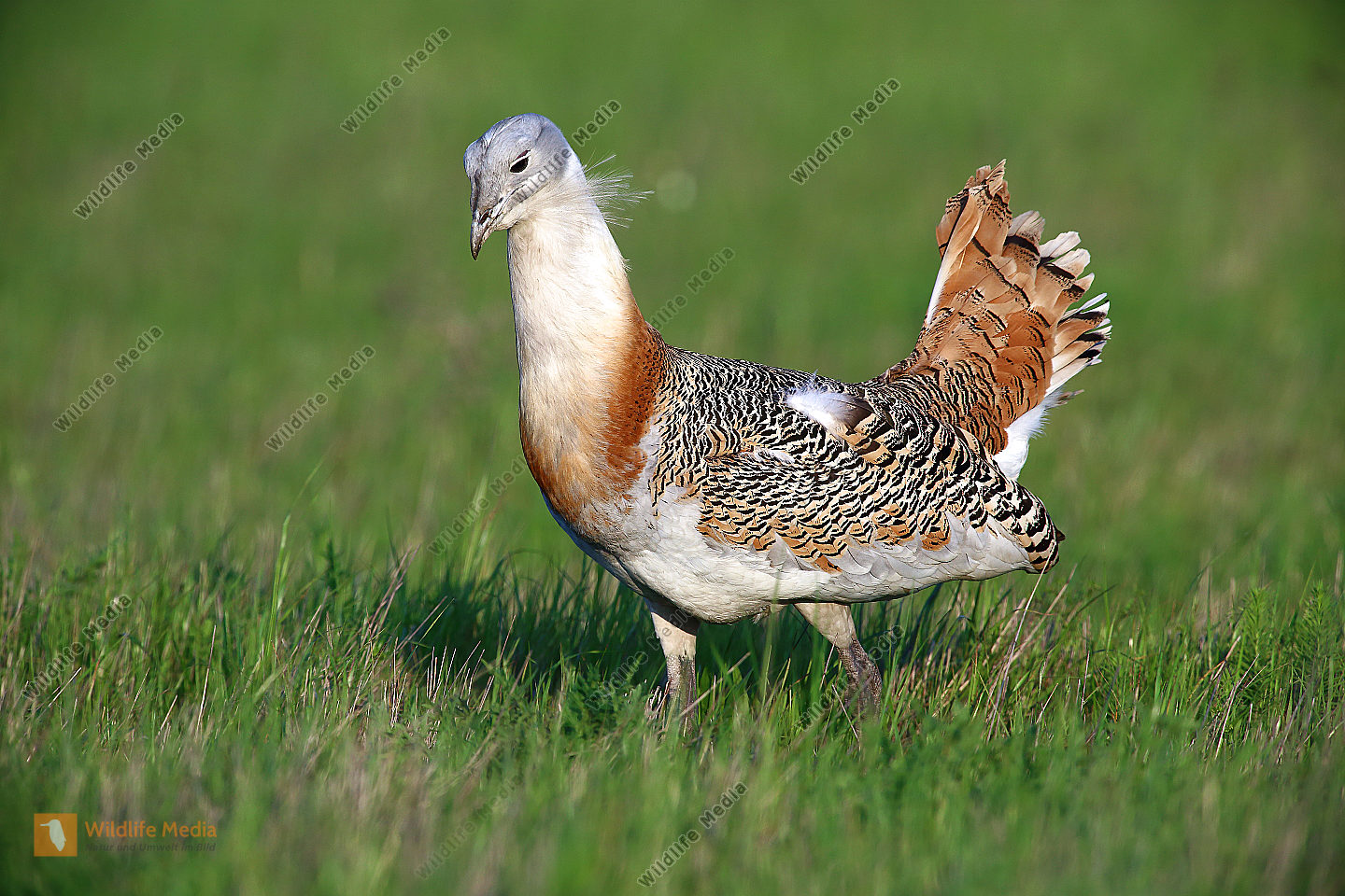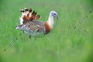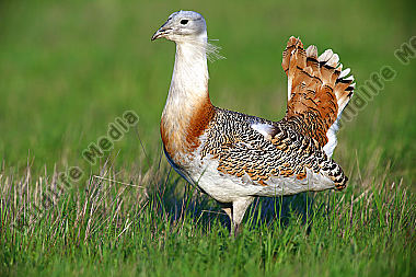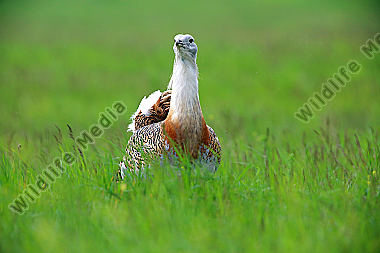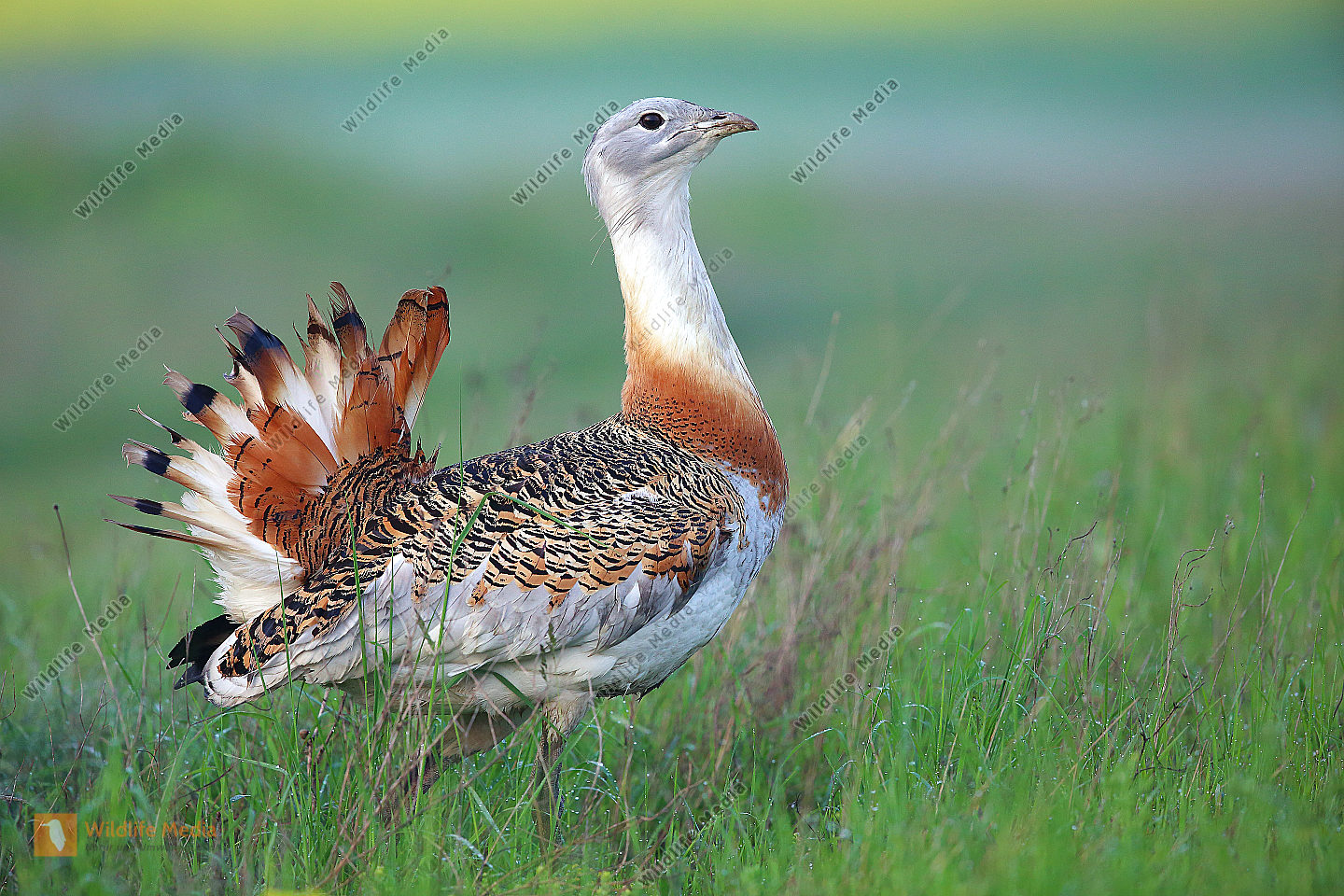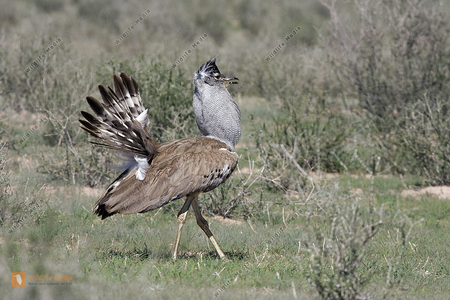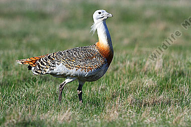 Großtrappe balzender Hahn mit Henne im Hintergrund