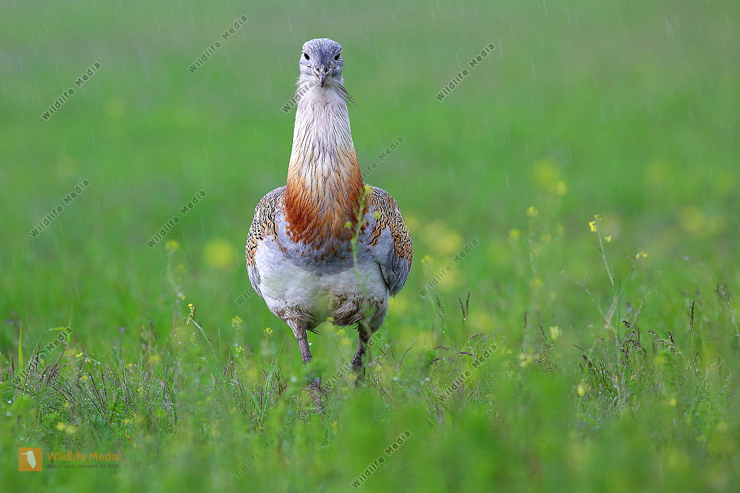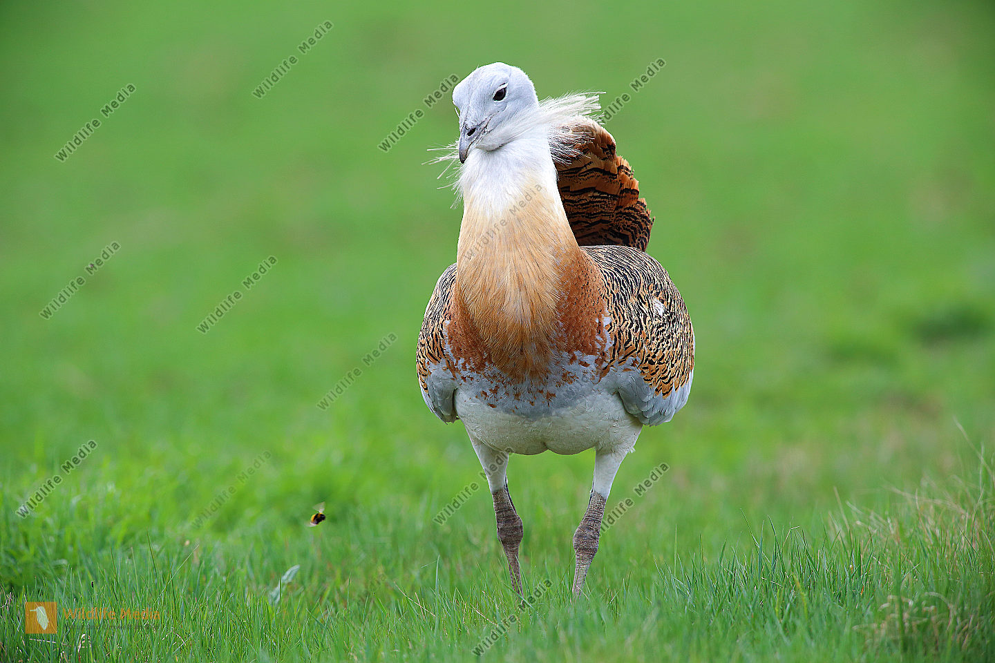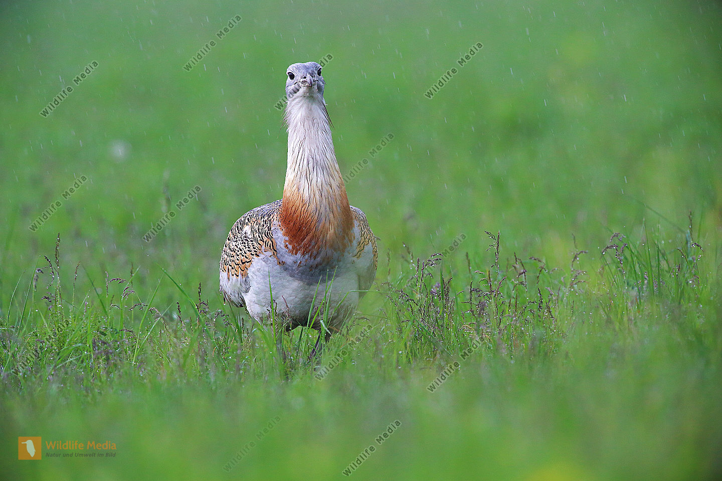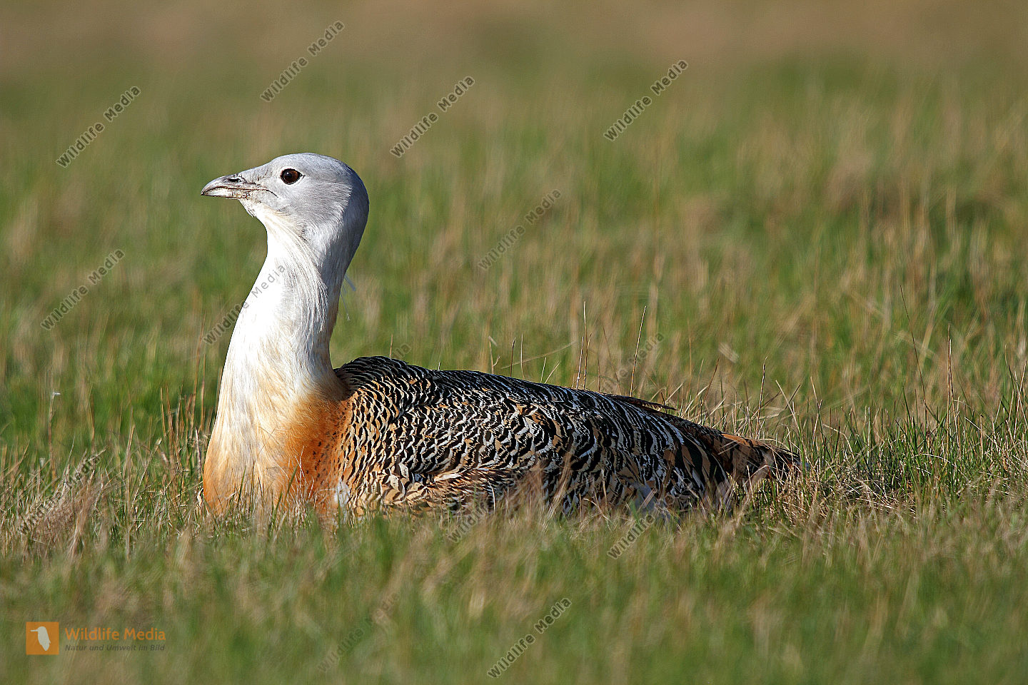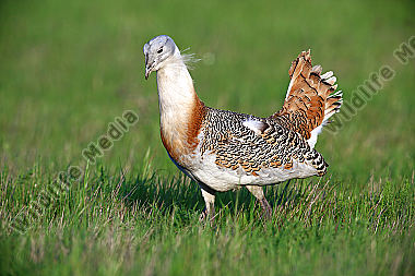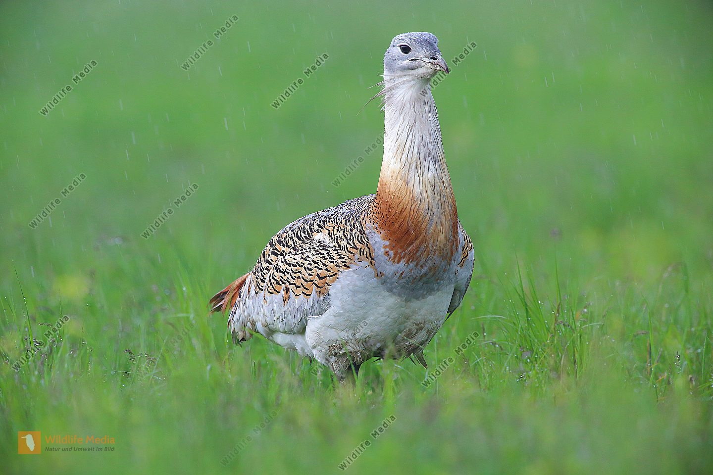 Großtrappe balzender Hahn mit Henne im Hintergrund
