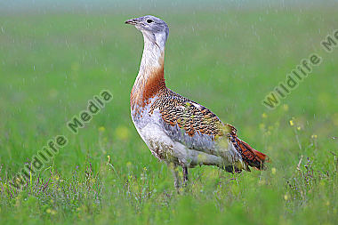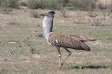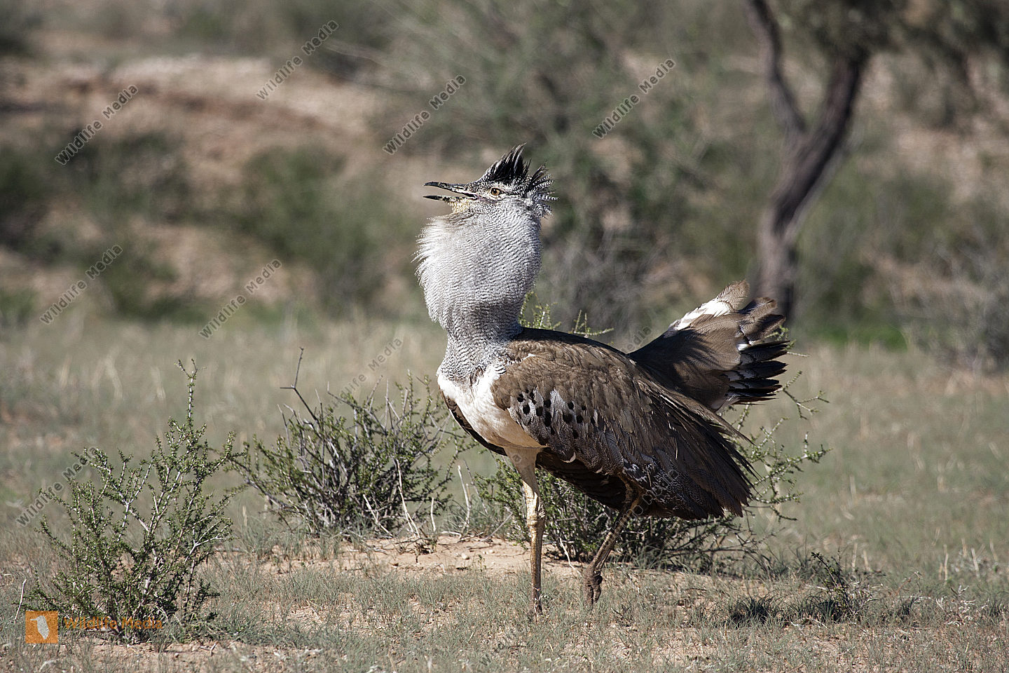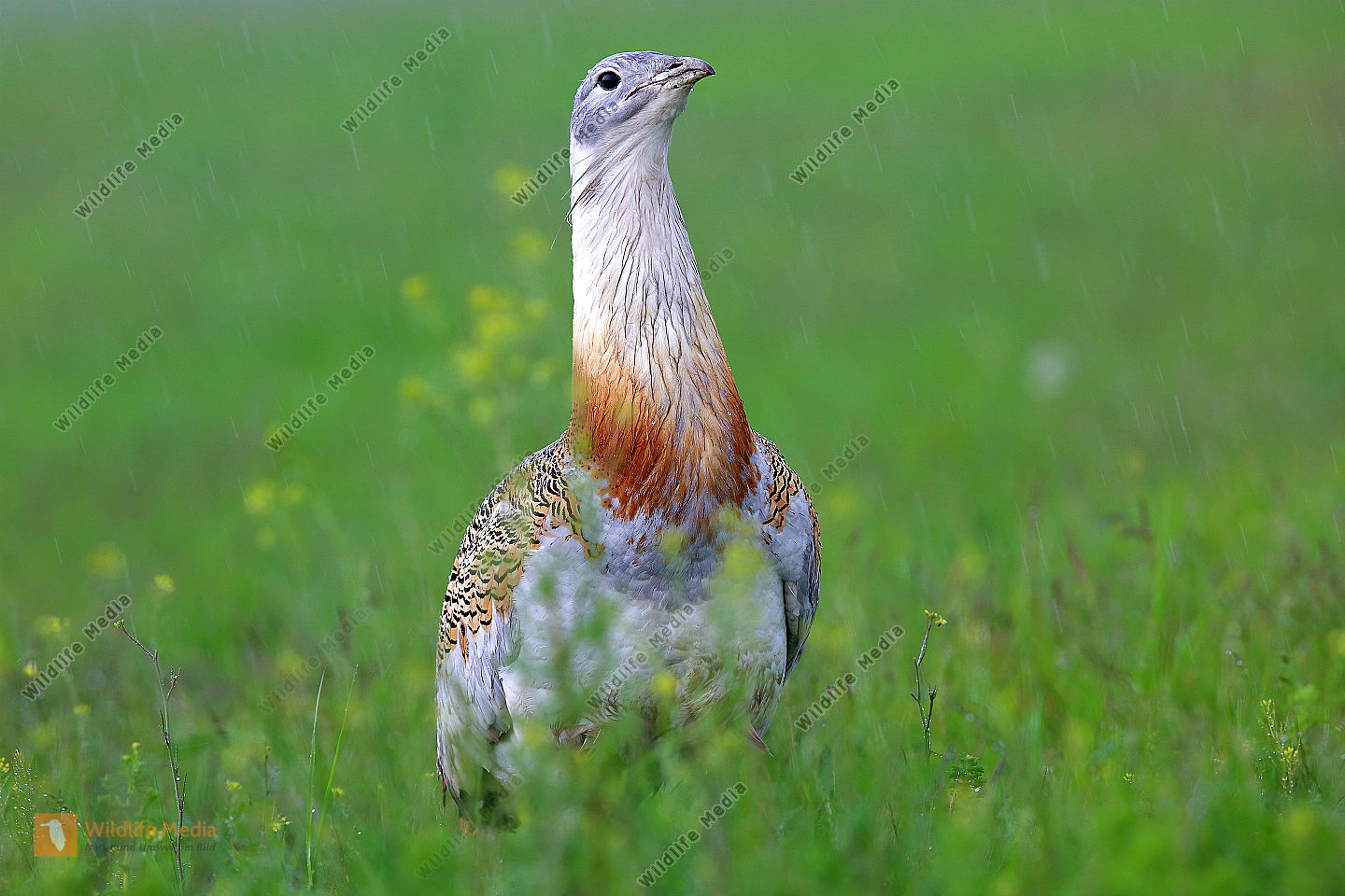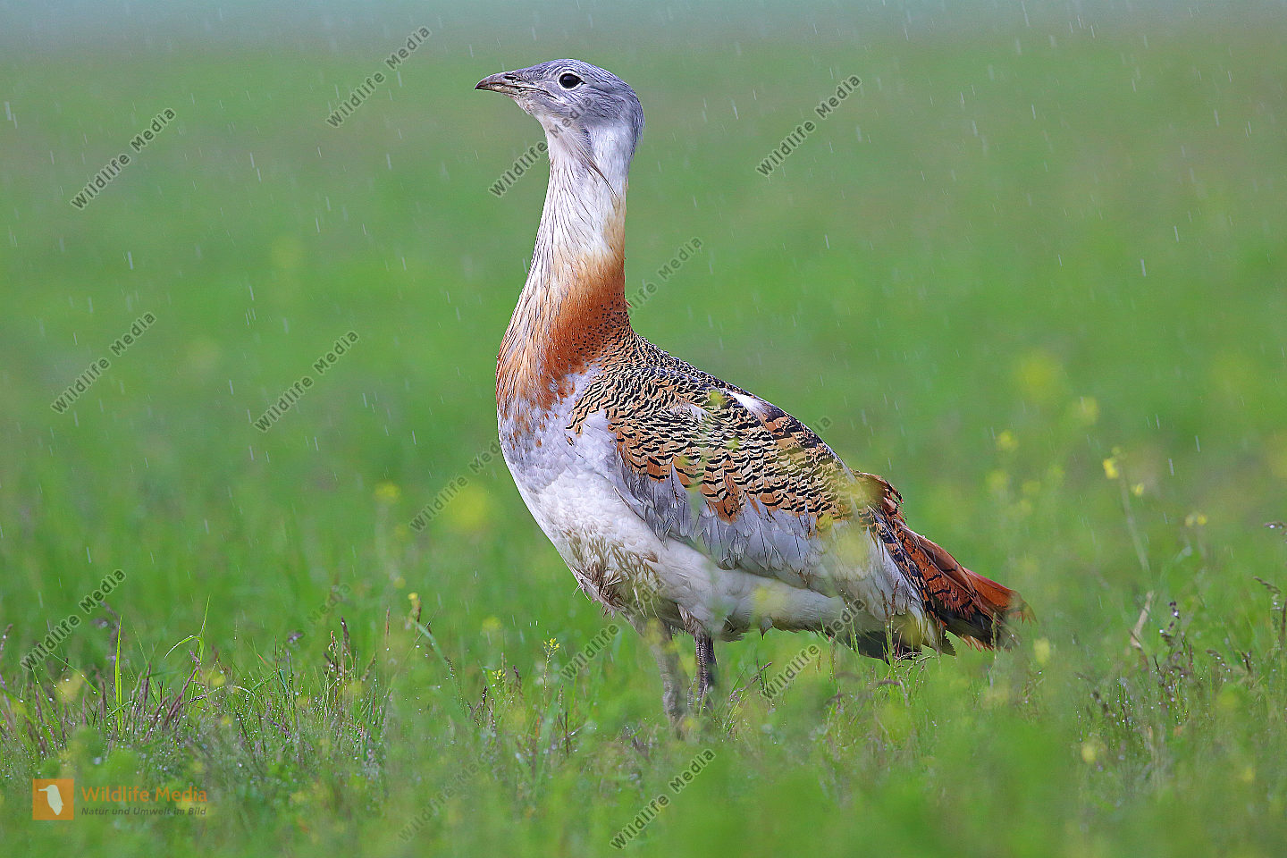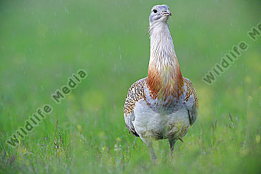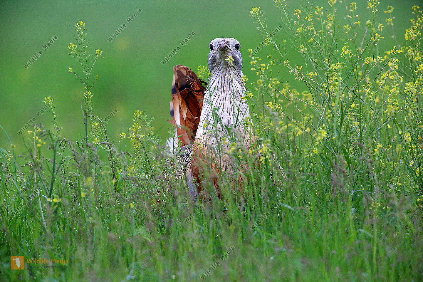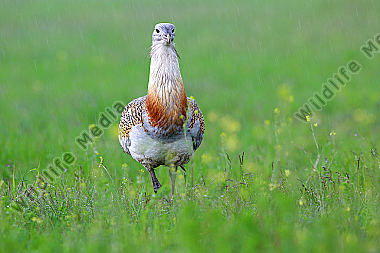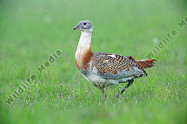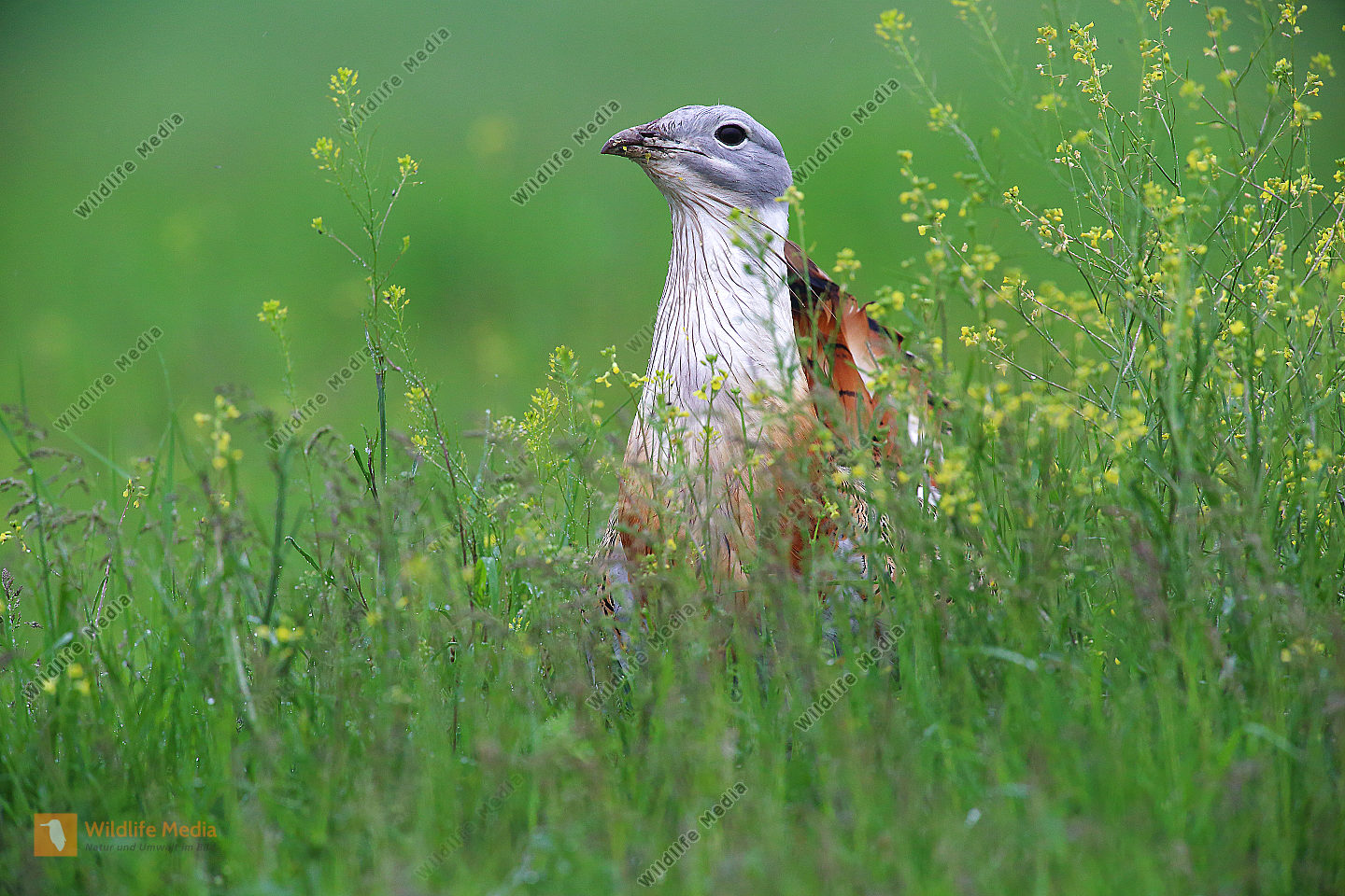 Großtrappe balzender Hahn mit Henne im Hintergrund