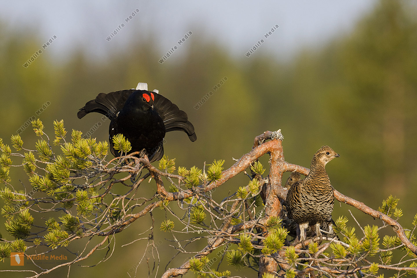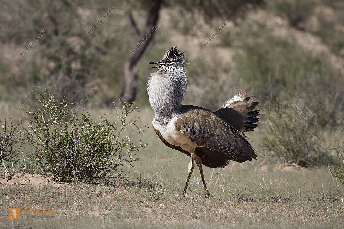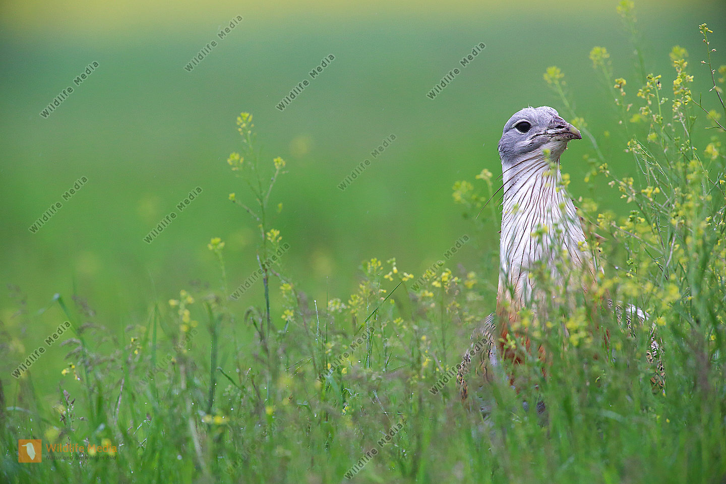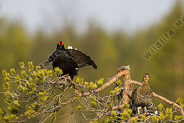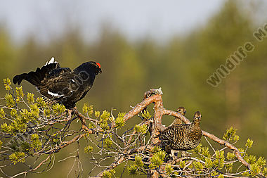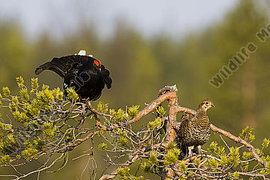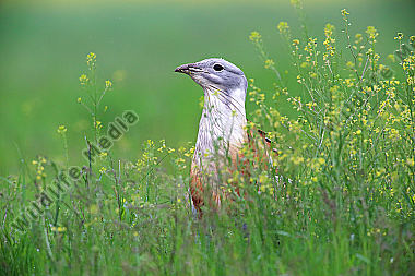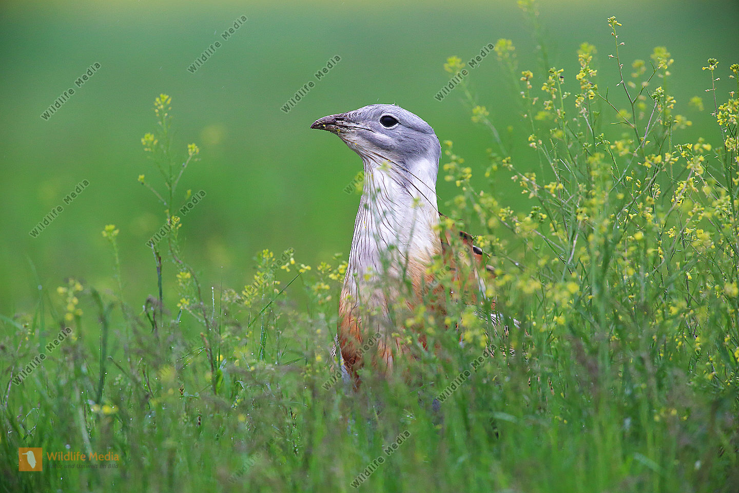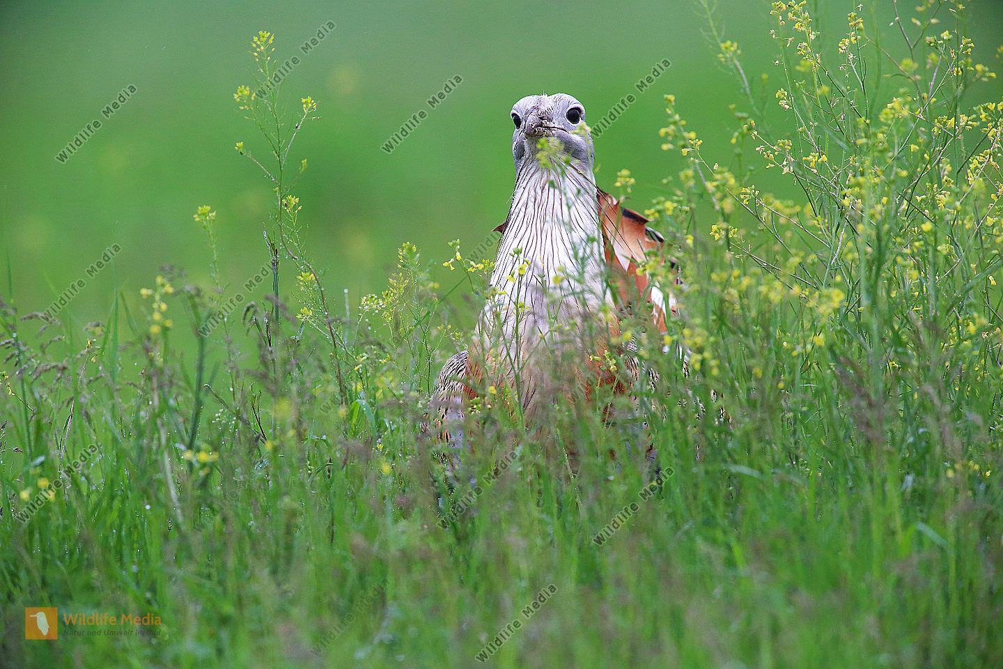 Großtrappe balzender Hahn mit Henne im Hintergrund
