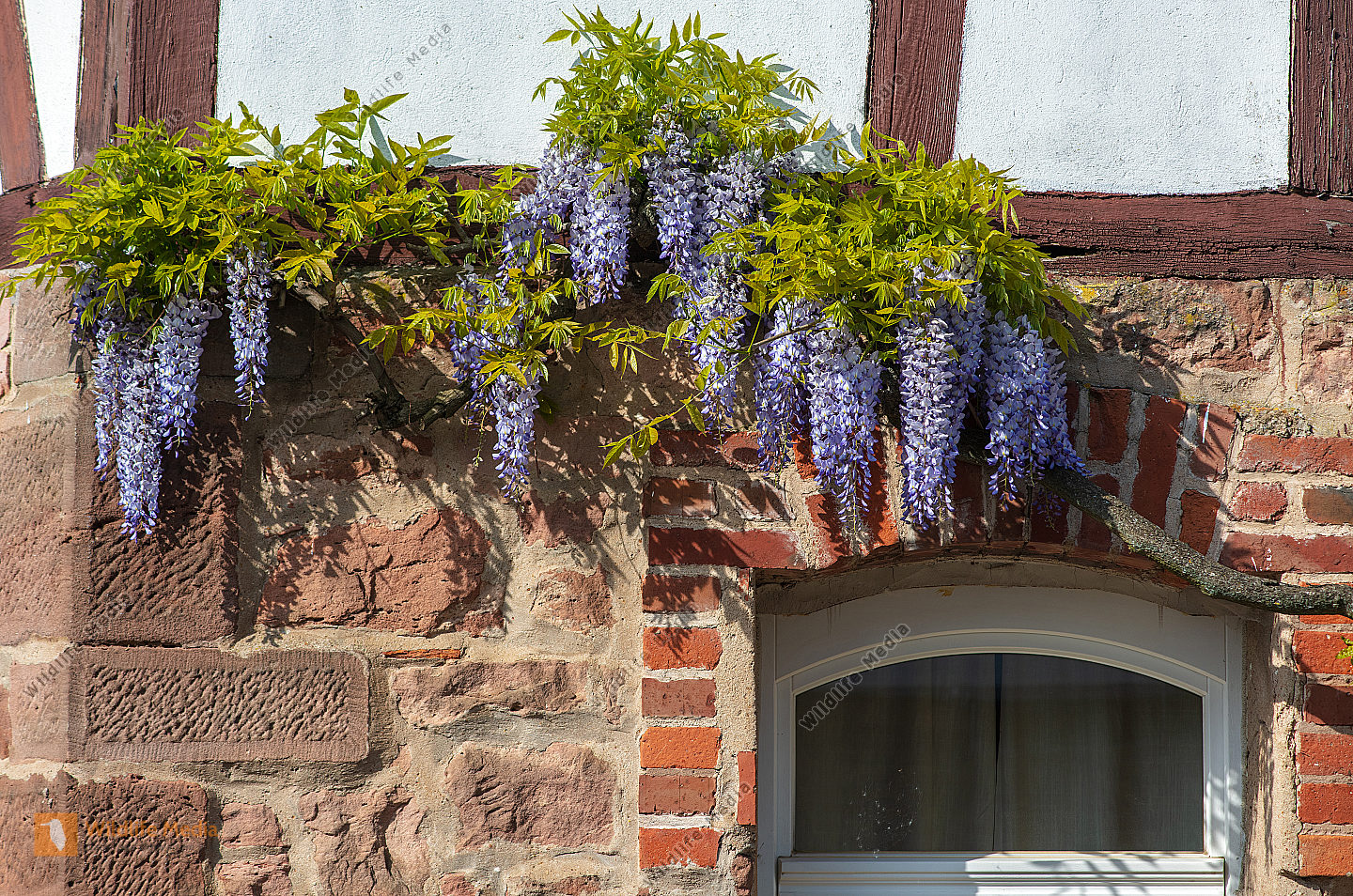 Blauregen Wisteria an einer Hauswand