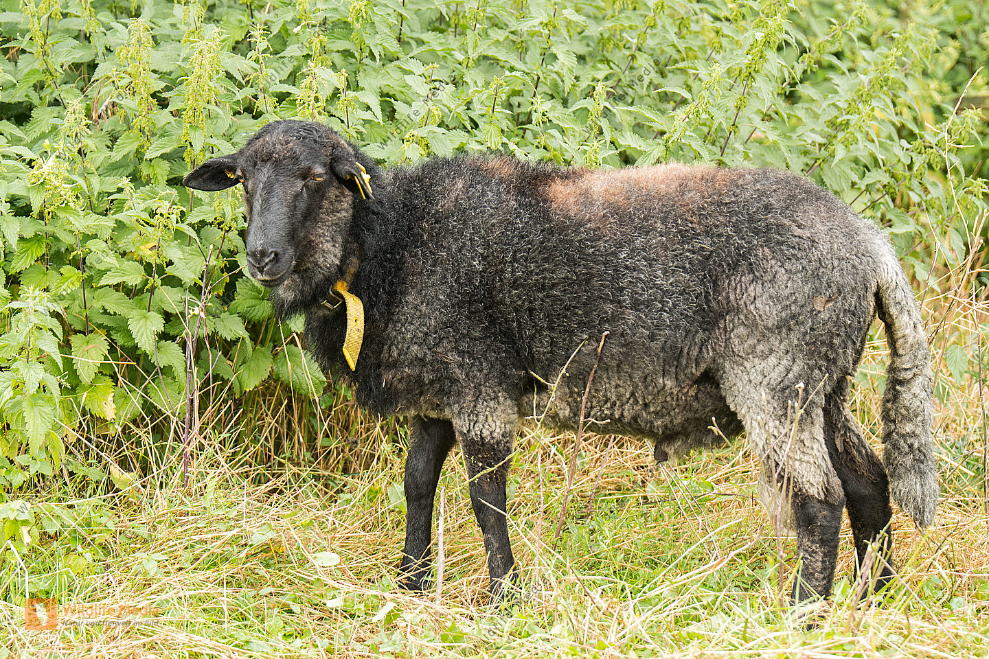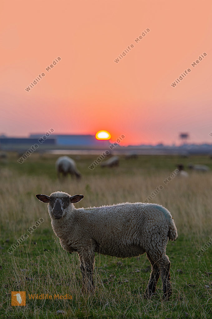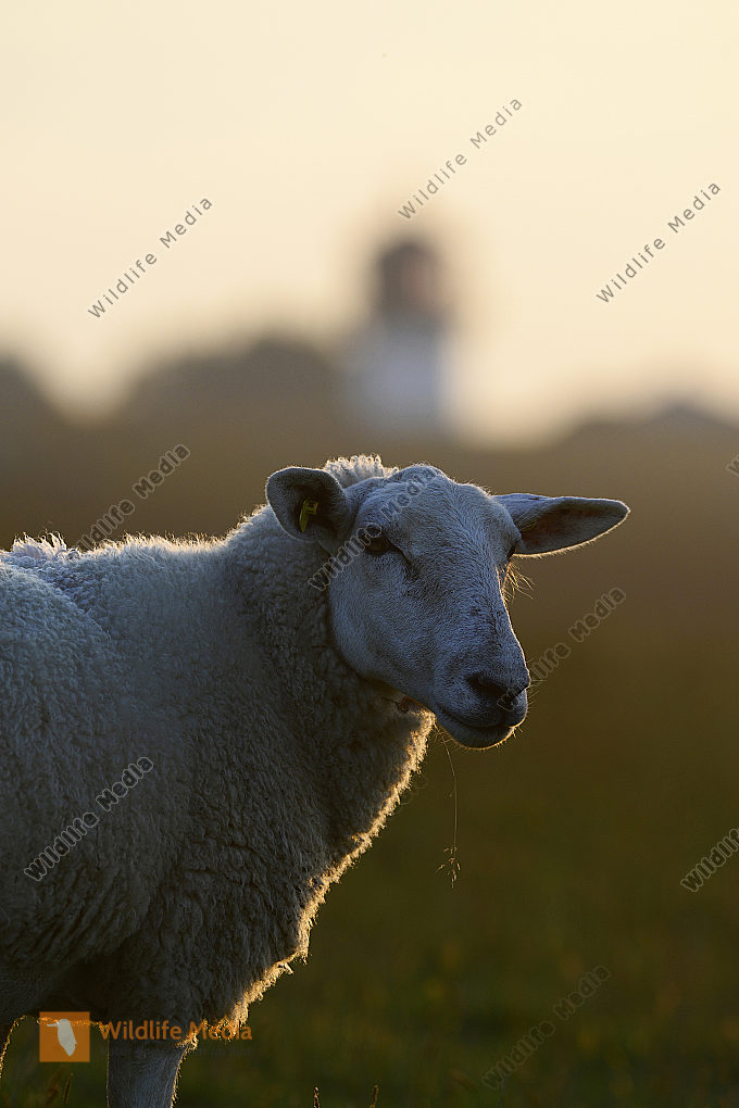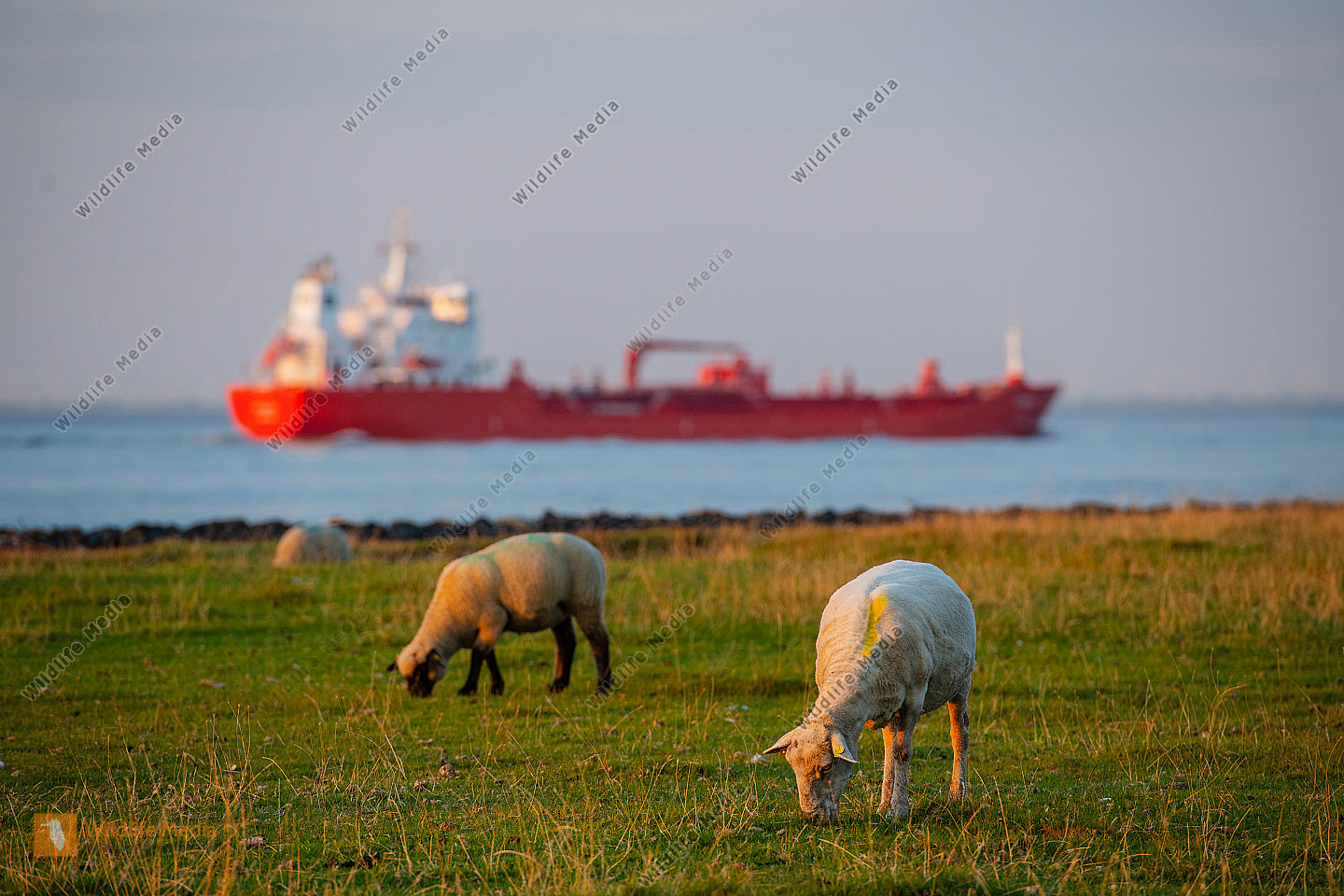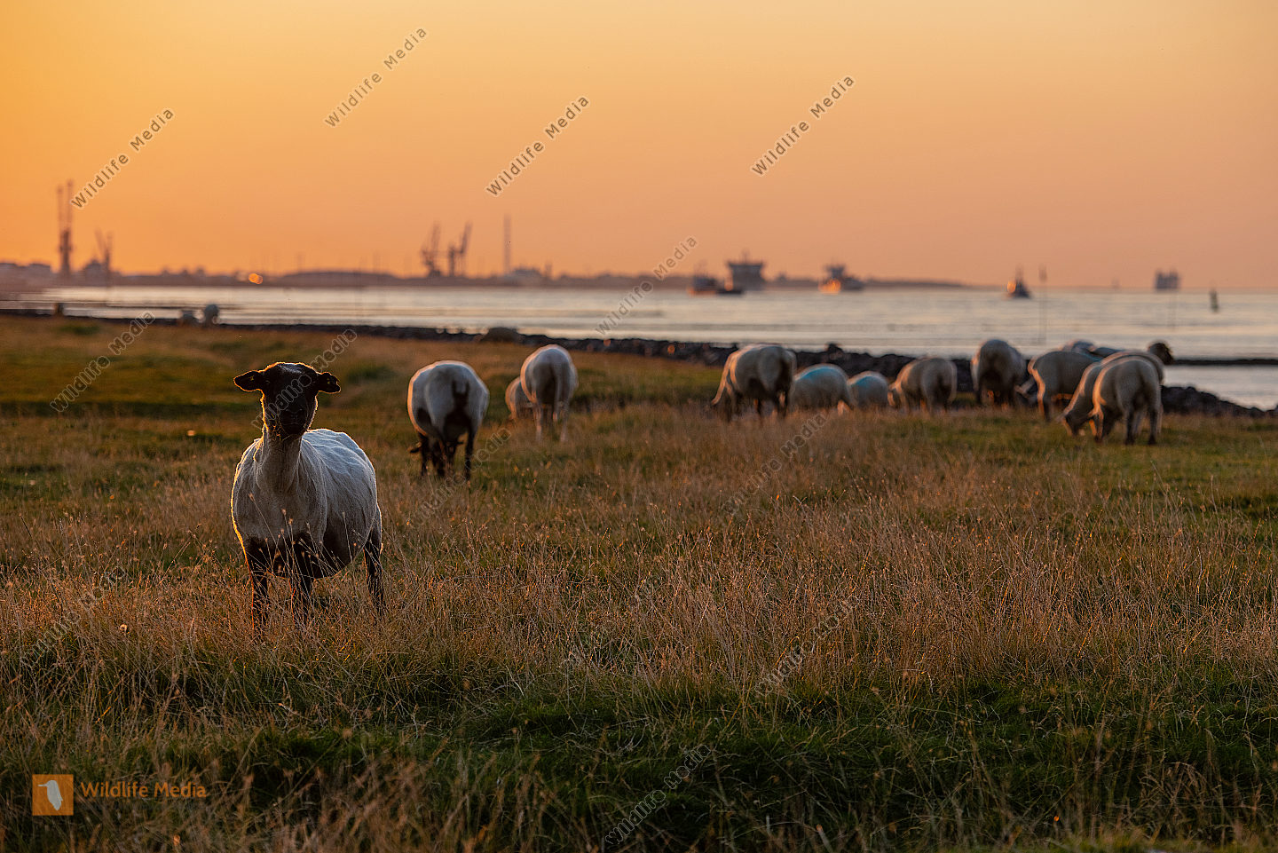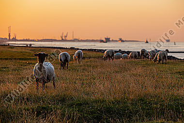 Texelschaf Ovis aries auf dem Deich/Fehmarn