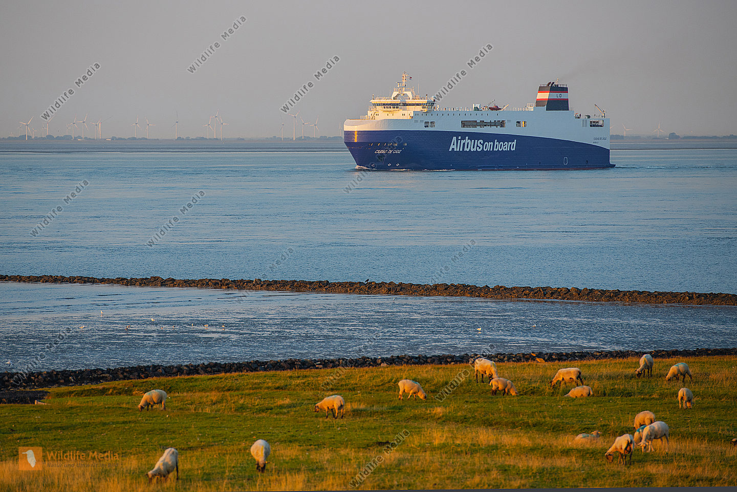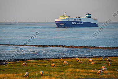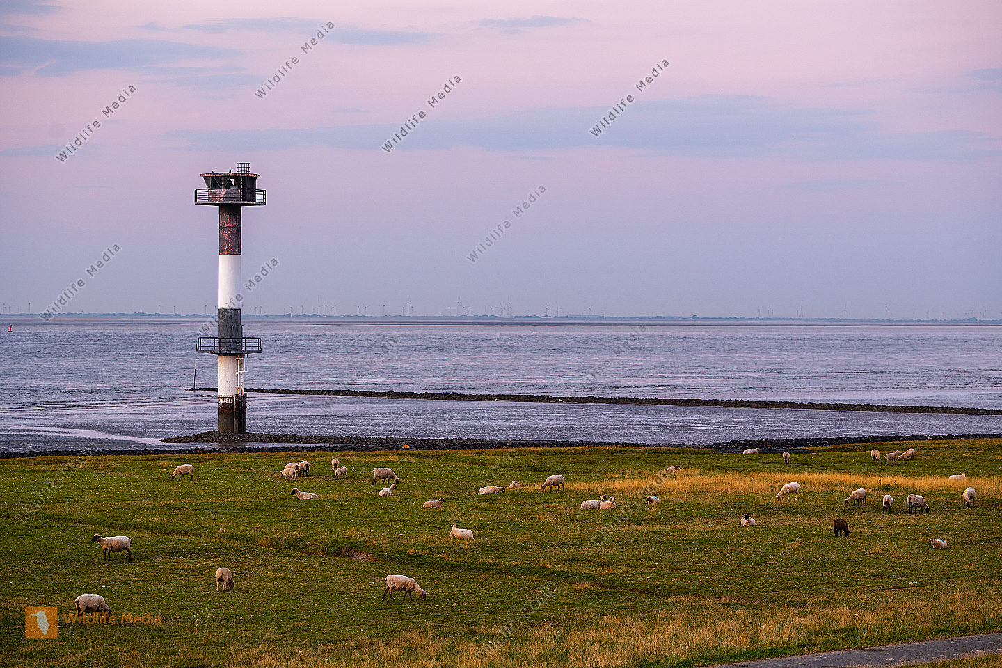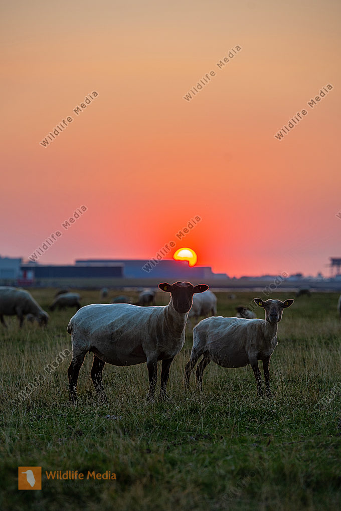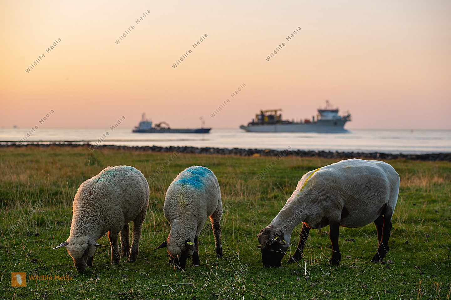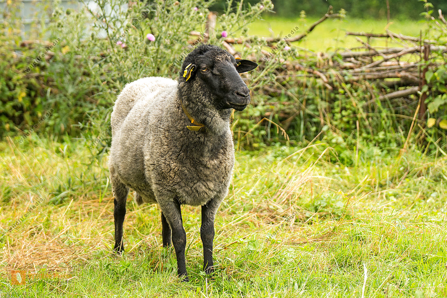 Texelschaf Ovis aries auf dem Deich/Fehmarn