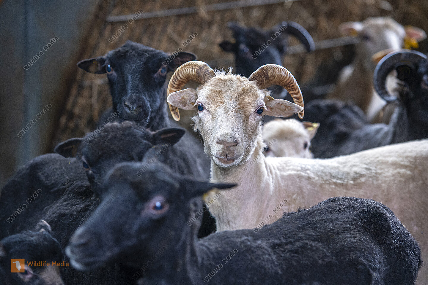 Graue gehörnte Heidschnucken Ovis aries im Stall