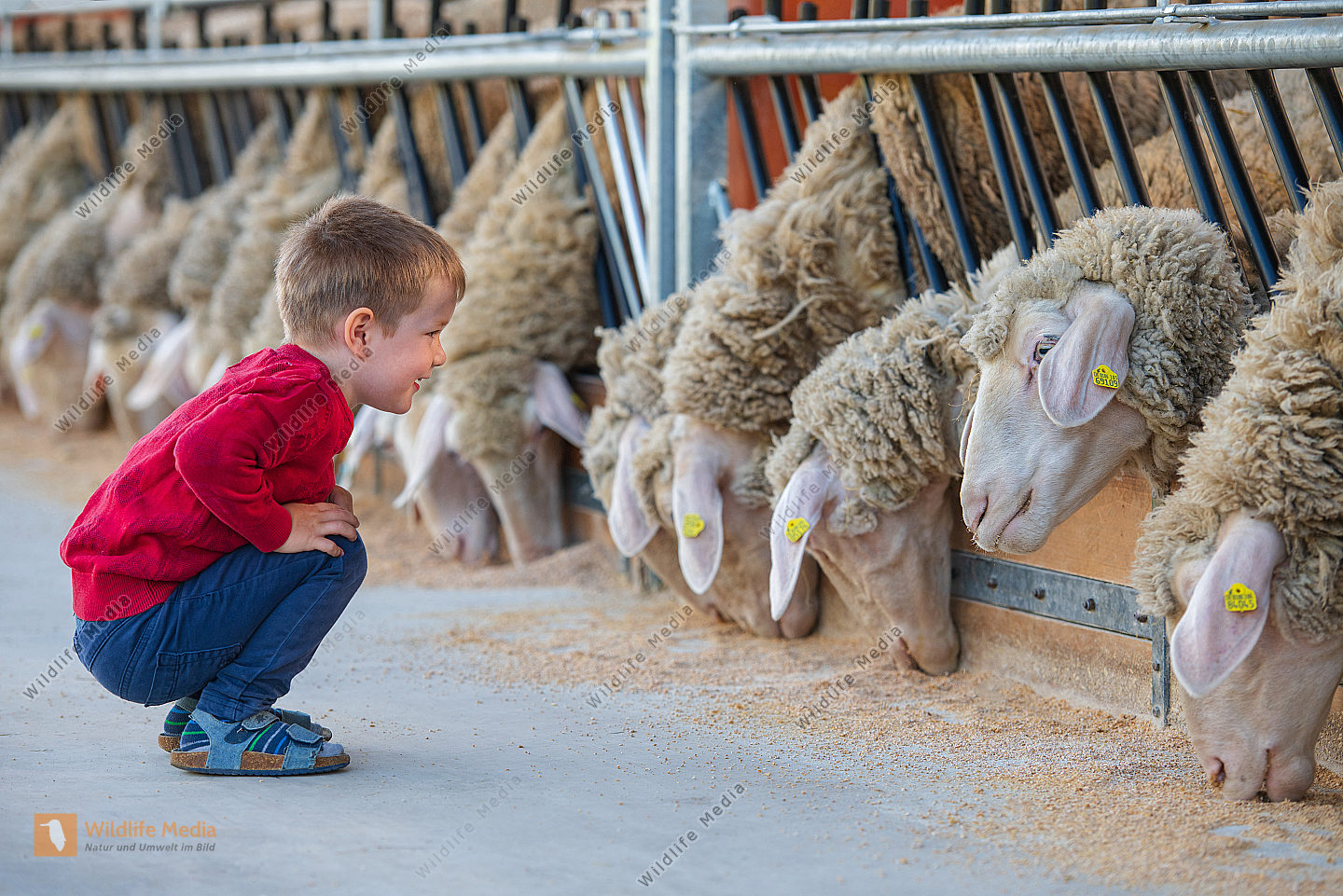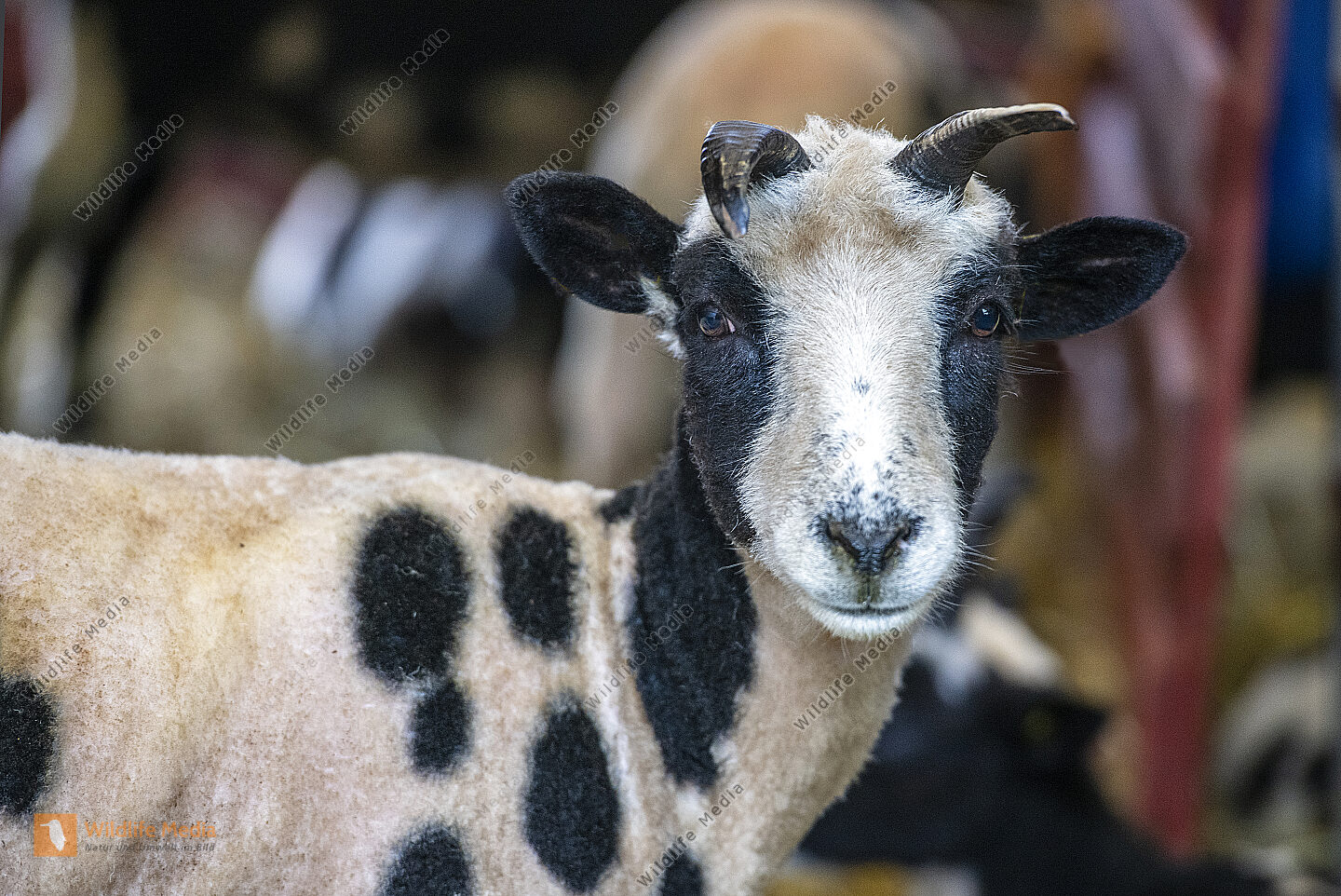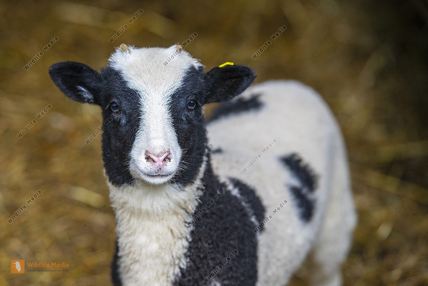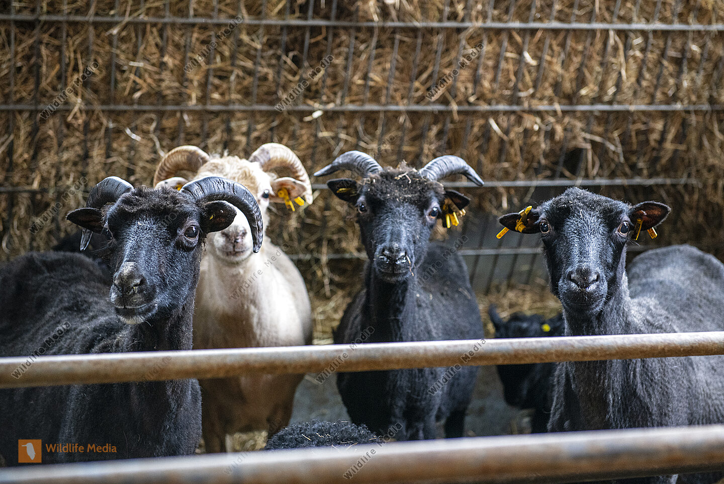Jacobsschaf-Lämmer Ovis aries im Stall