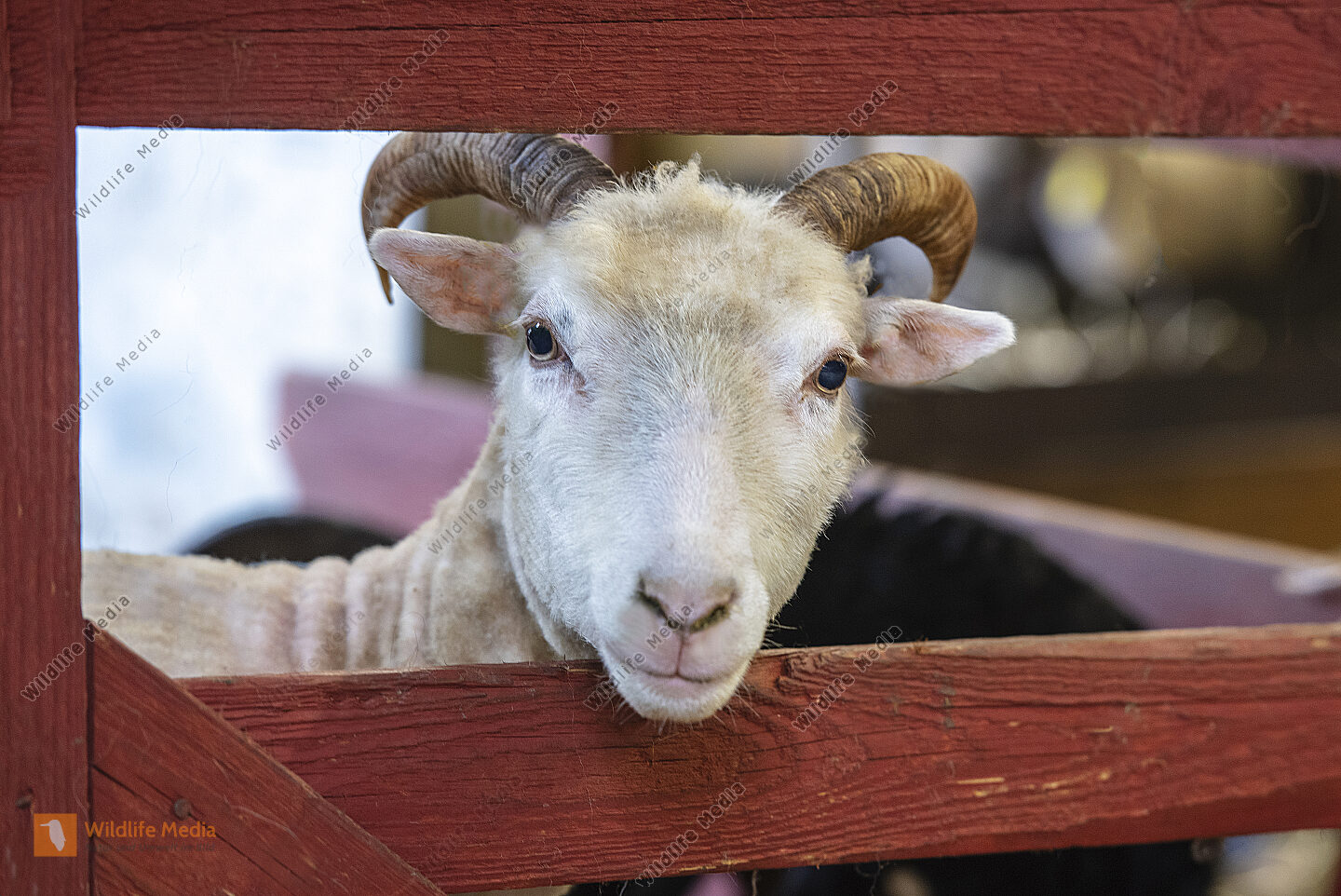 Weiße gehörnte Heidschnucke Muttertier Ovis aries im Stall