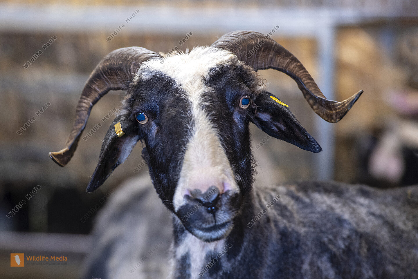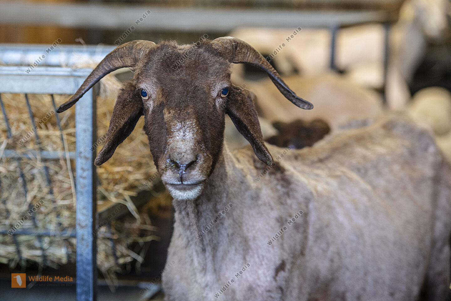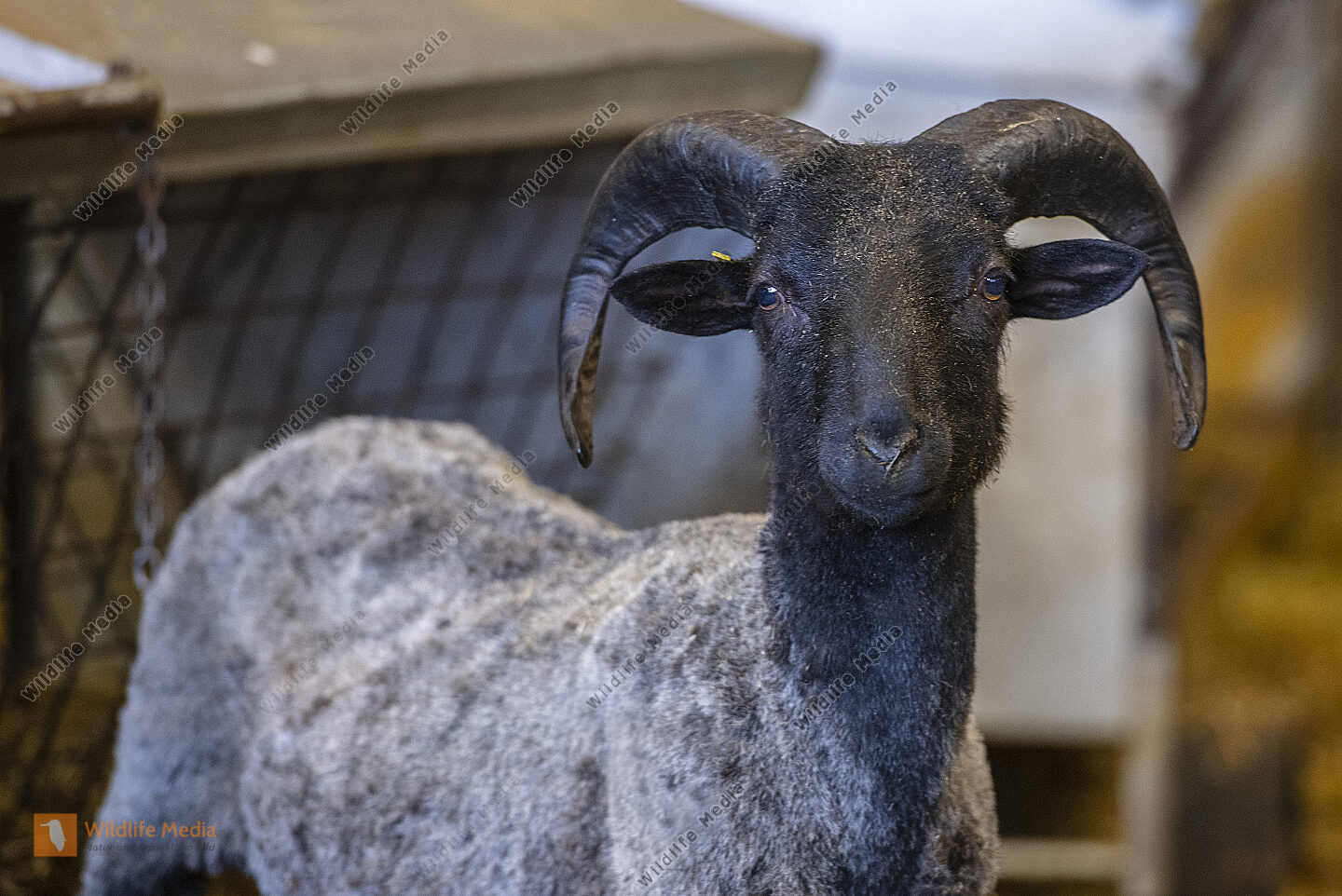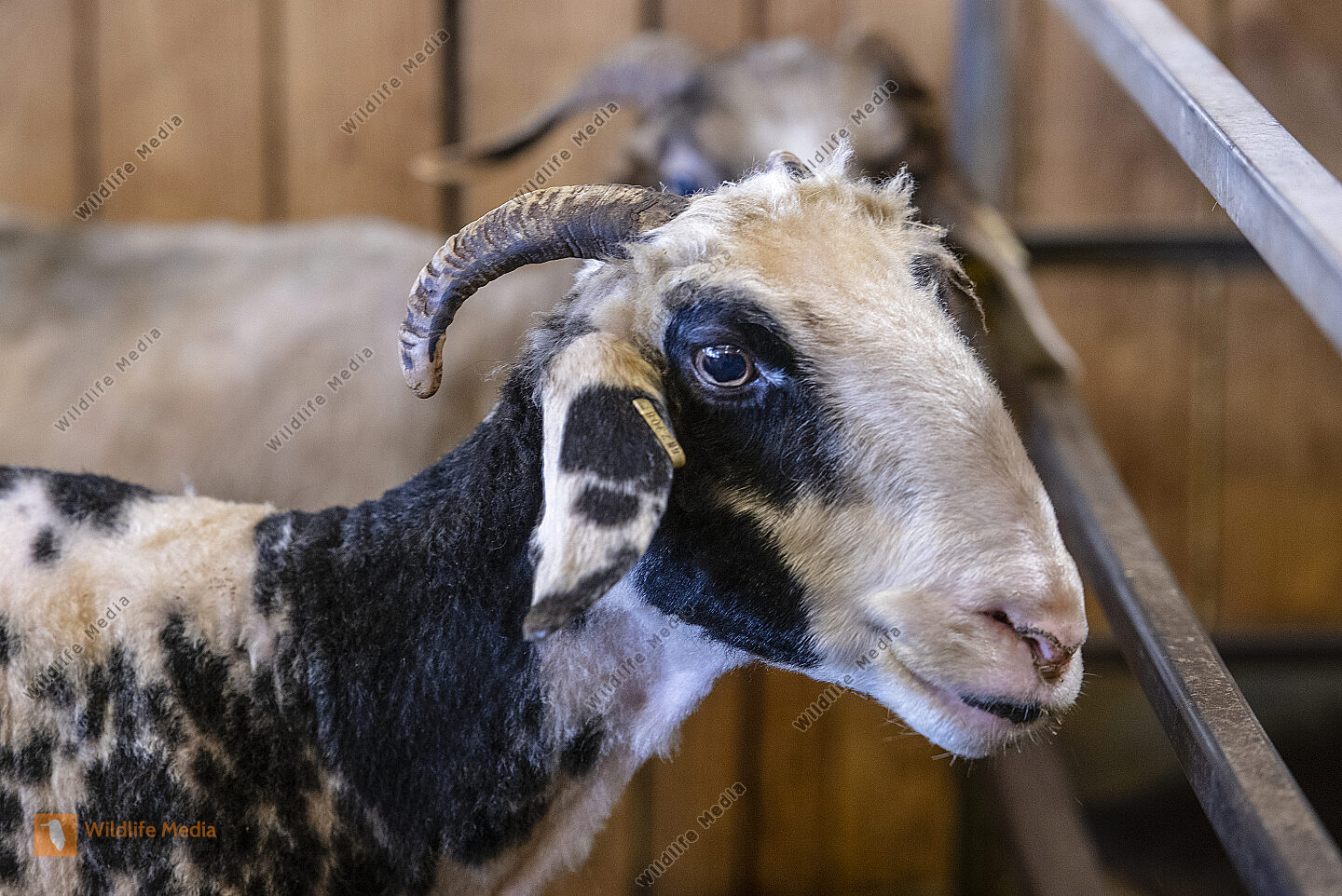 Graue gehörnte Heidschnucke junger Bock Ovis aries im Stall