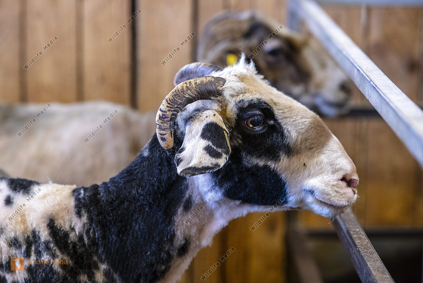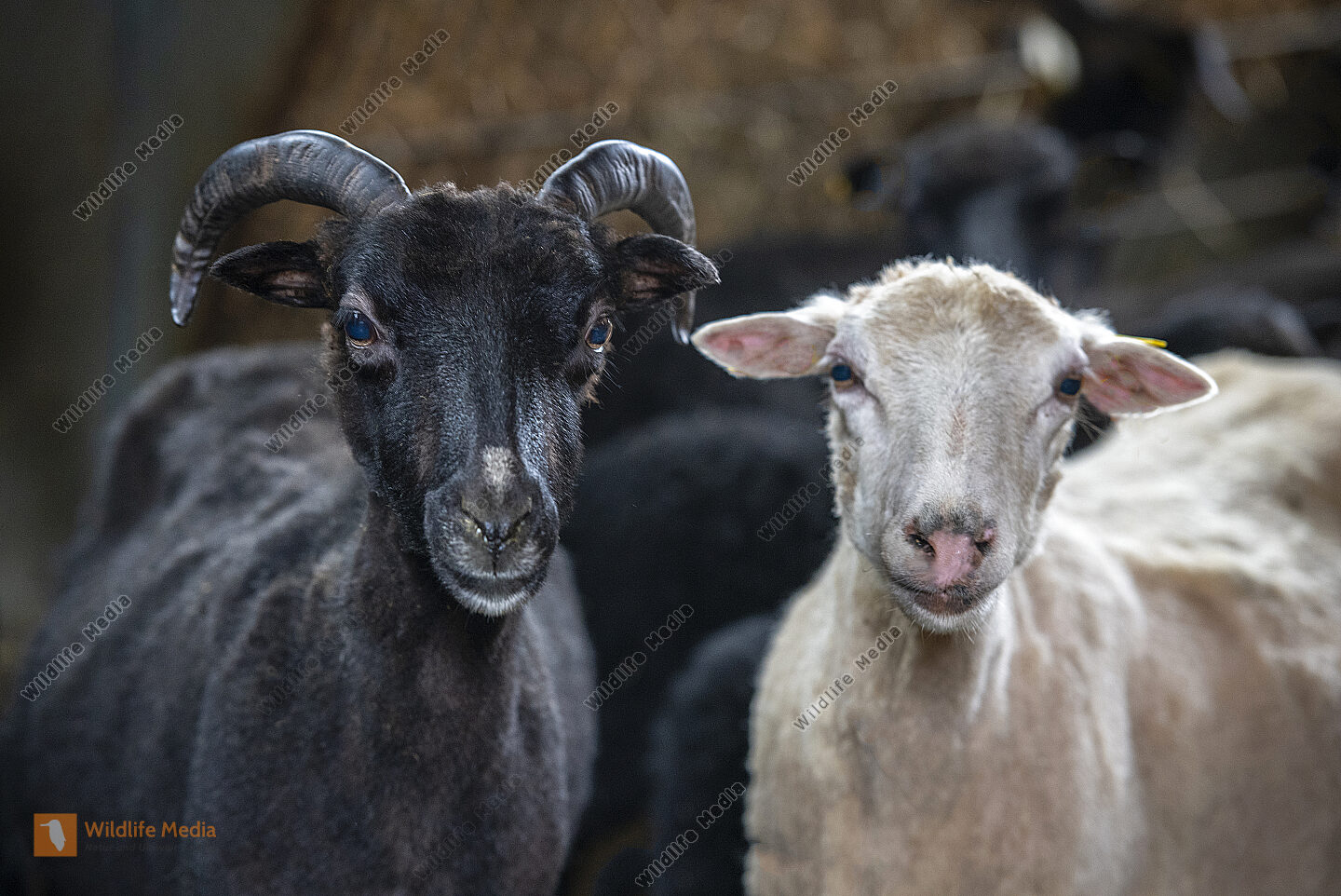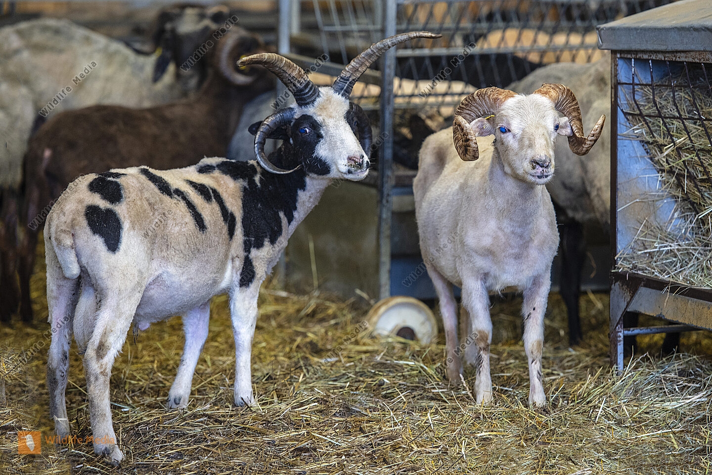 Jacobsschafbock links Weiße gehörnte Heidschnuckenbock rechts Ovis aries im Stall