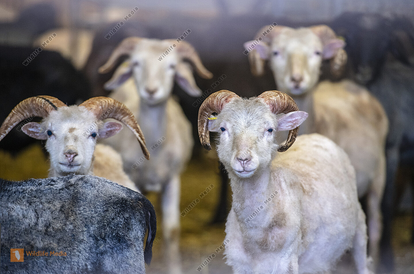 Weiße gehörnte Heidschnucken Böcke Ovis aries im Stall