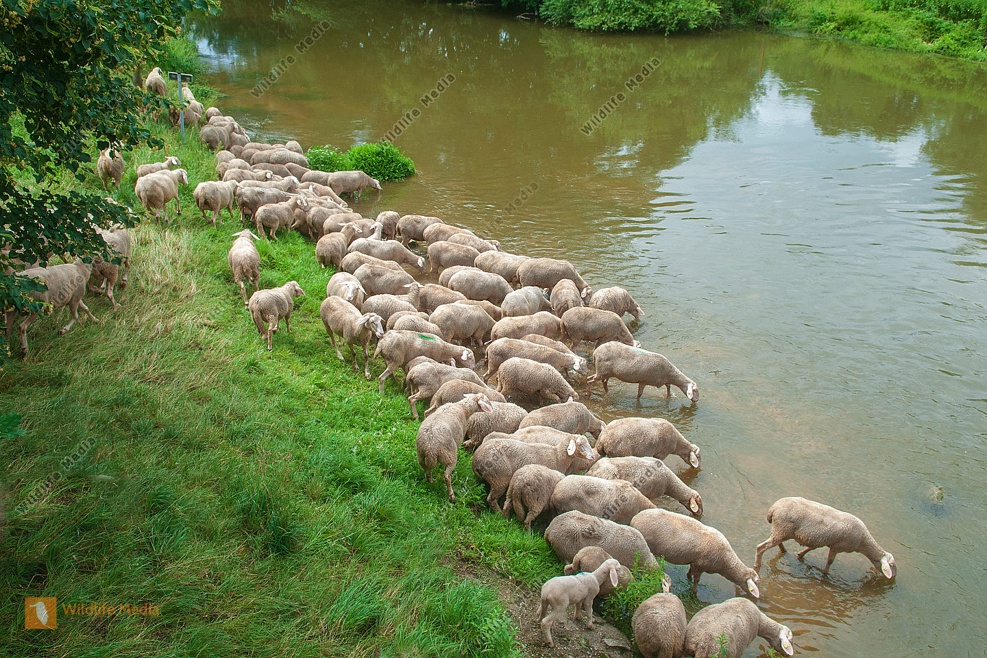 Schafherde Ovis aries im Tal der Laber. Luftaufnahme