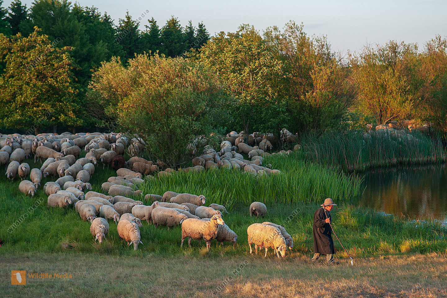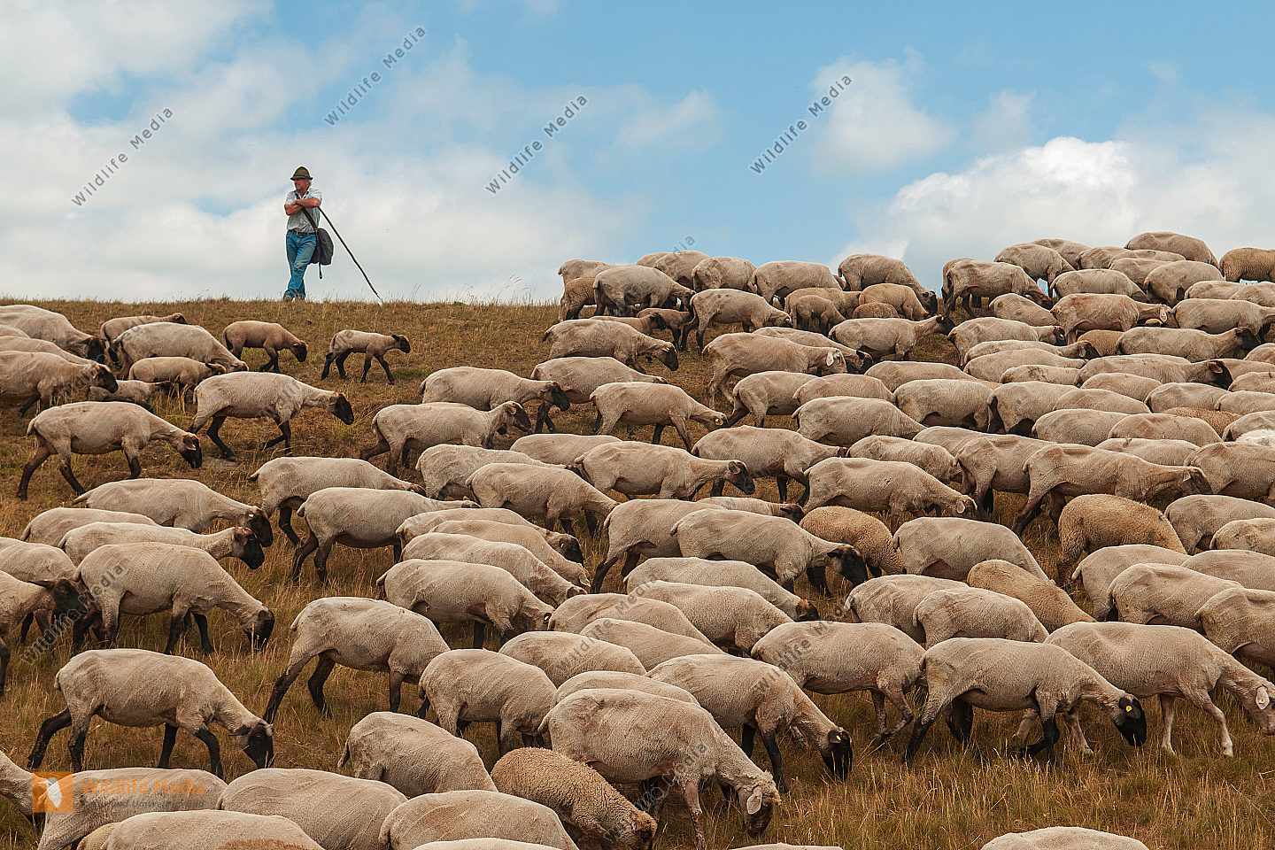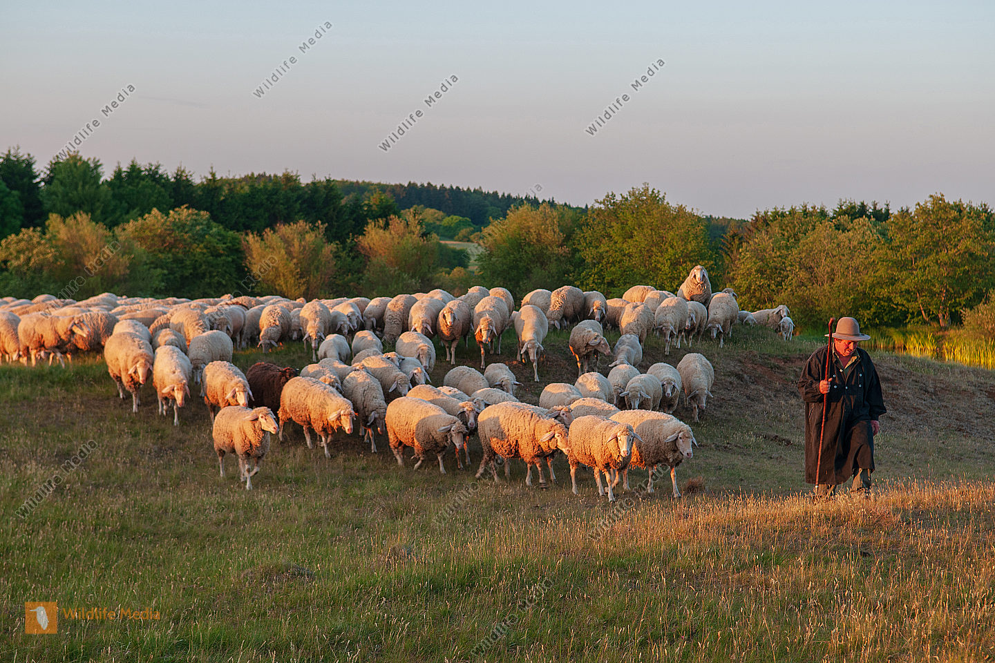 Schäfer mit Hütehund und Schafherde am Waldrand