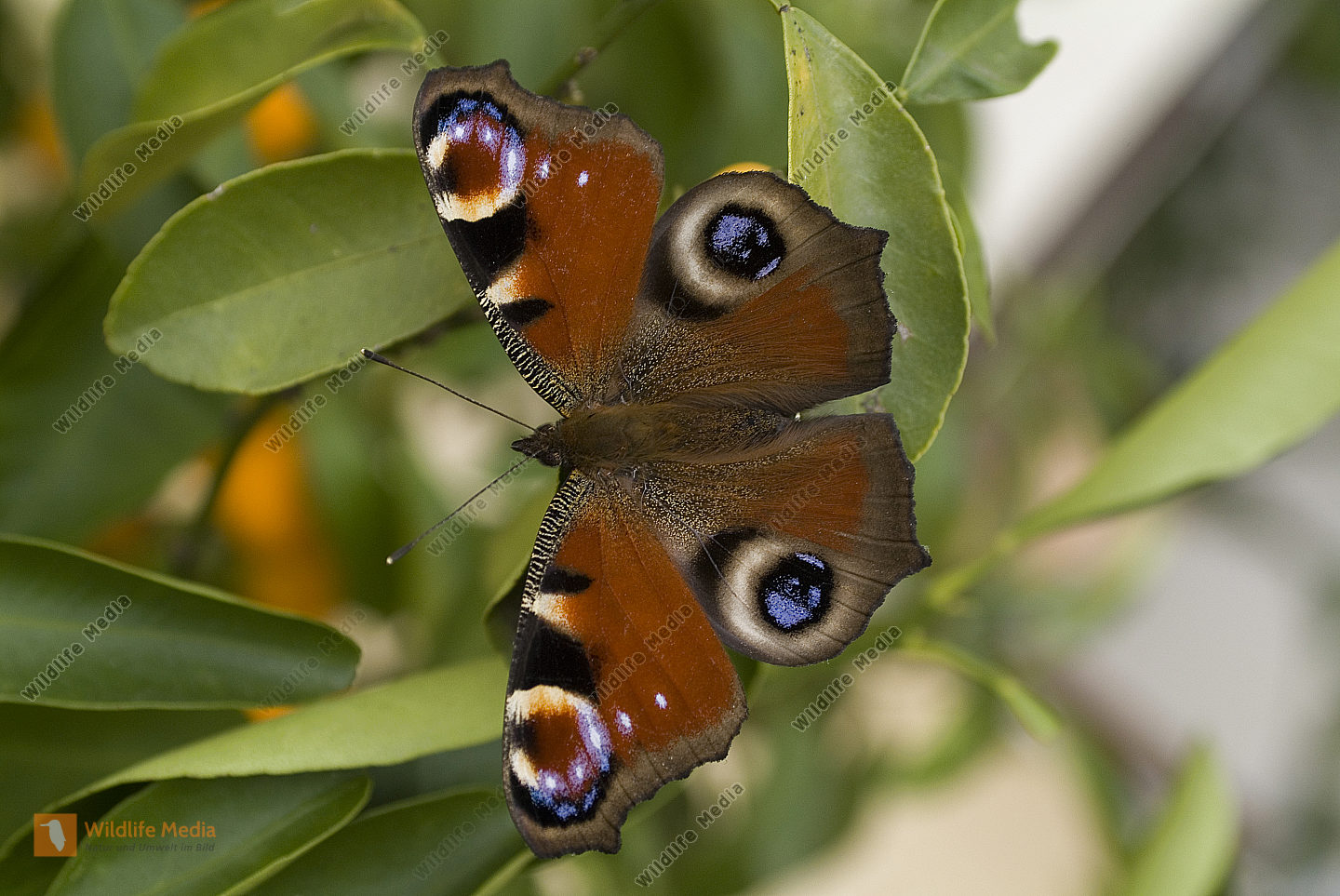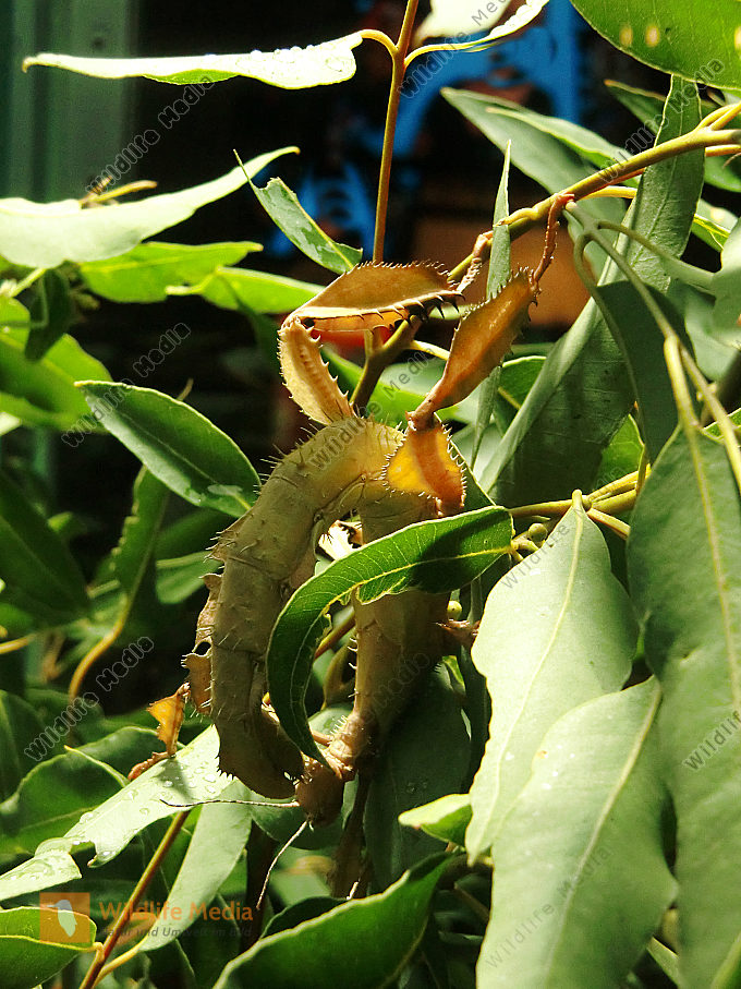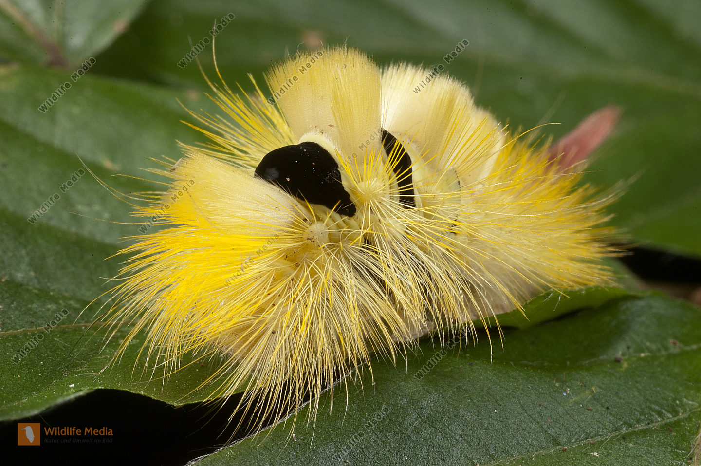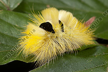 Die Raupe eines Tagpfauenauges auf einem Blatt