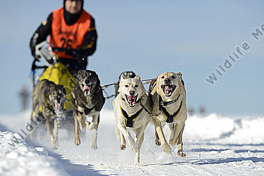 Schlittenhundegespann Canis lupus familiaris beim Rennen