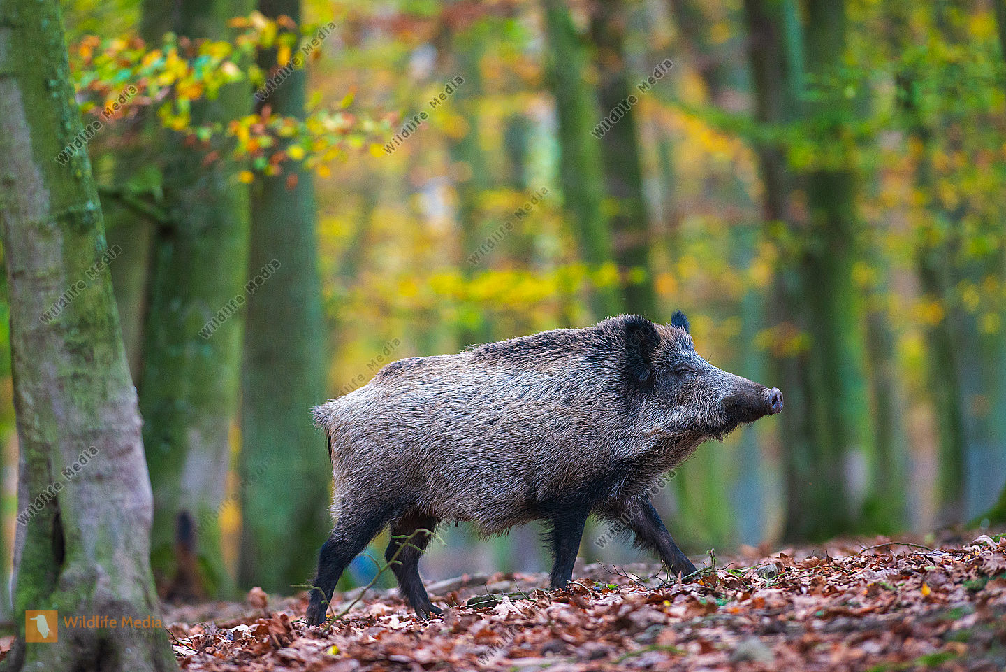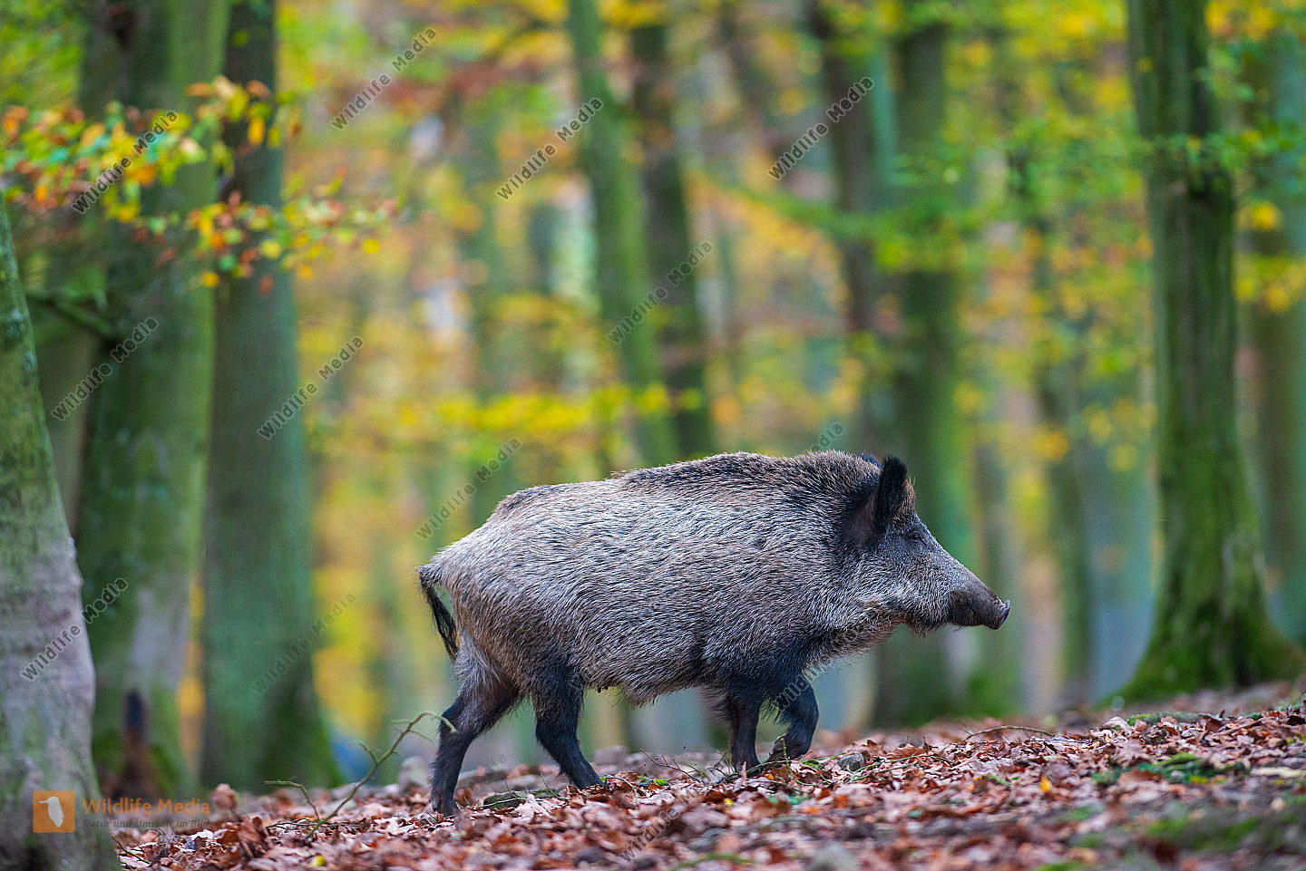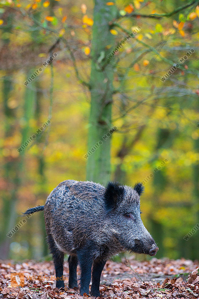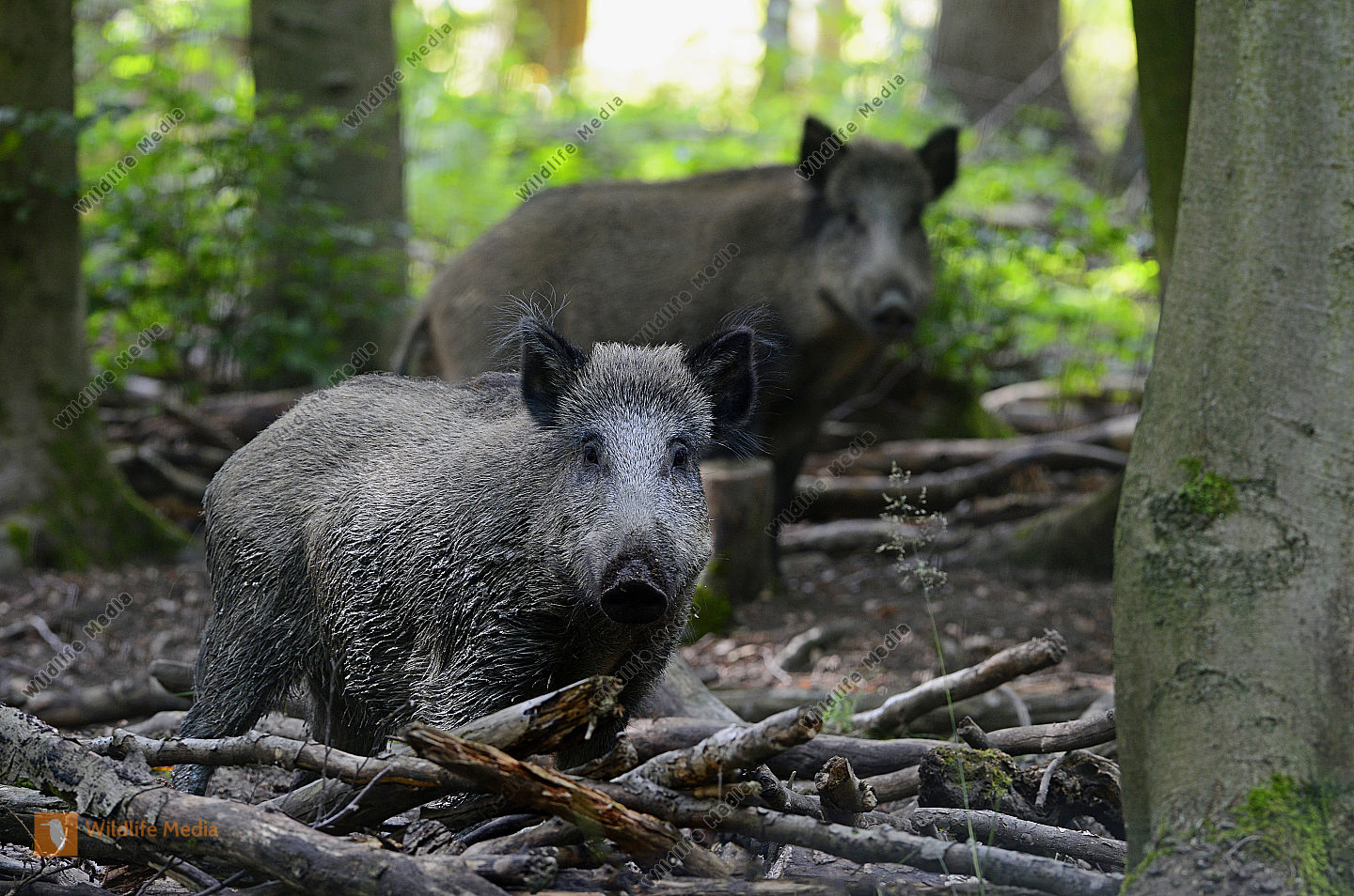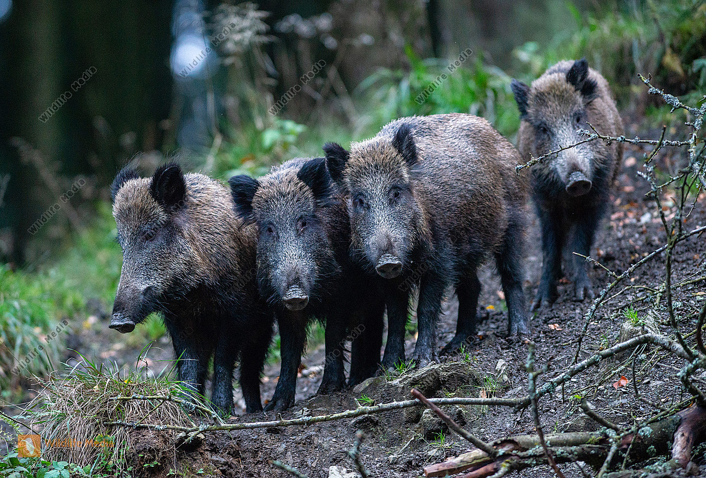 Junges Wildschwein Sus scrofa Frischling mit Klettengewächs