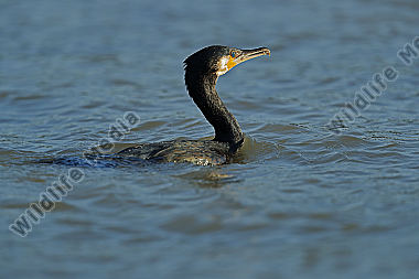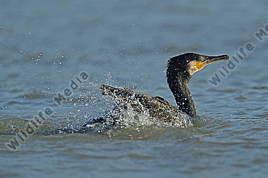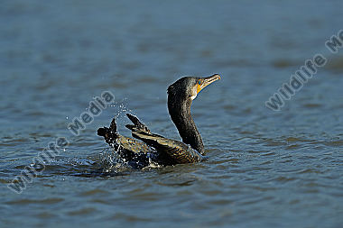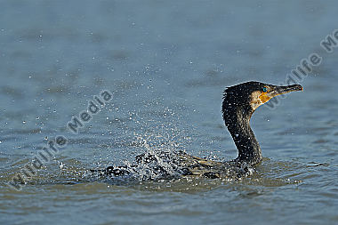 Kormorane überfliegen im Morgennebel den Bostalsee