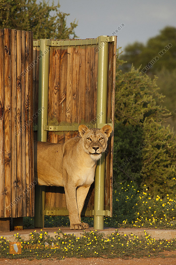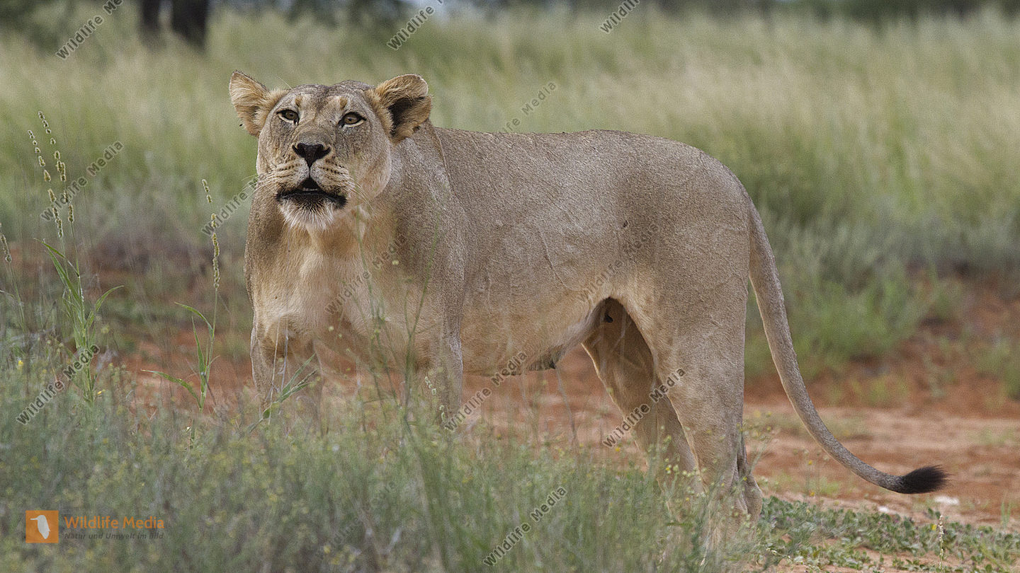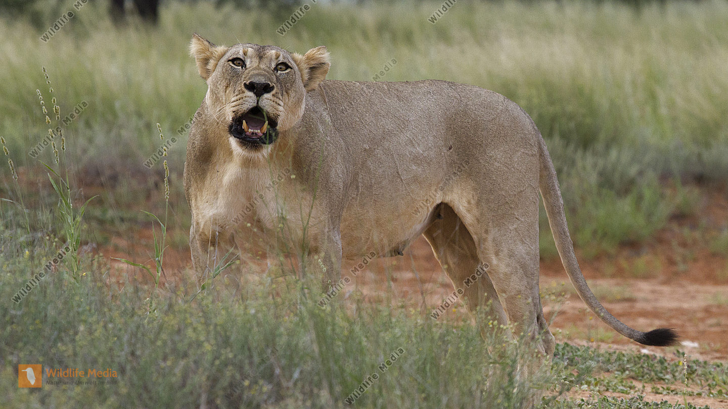 Zoom Löwin mit ihrem Jungtier aus einer der wenigen noch vorhandenen Pfützen trinkend Masai Mara Kenia f43149